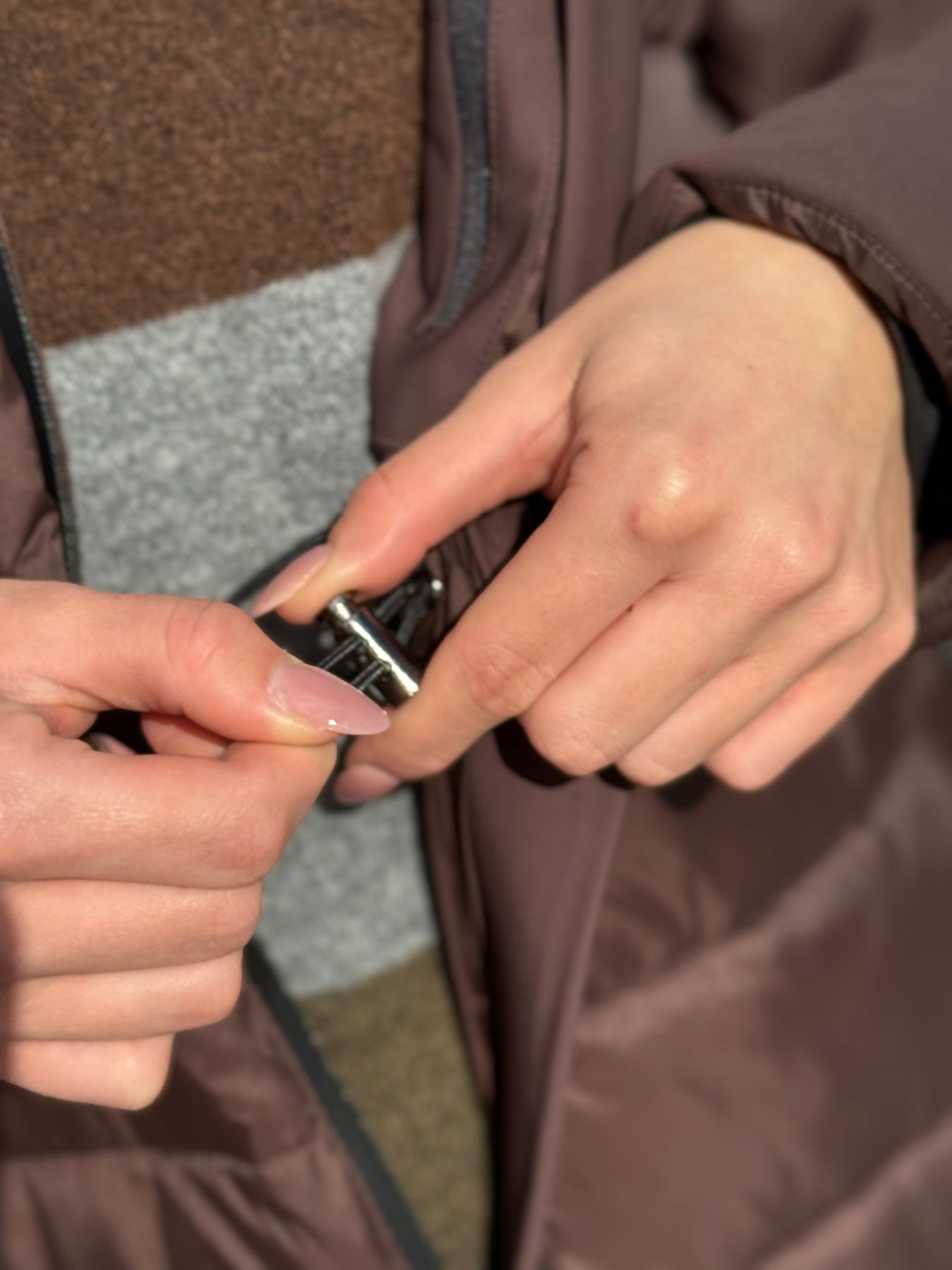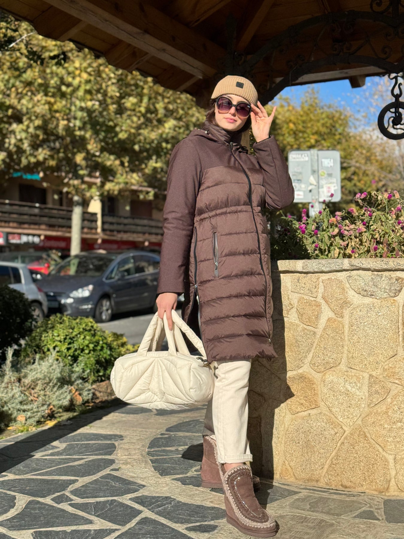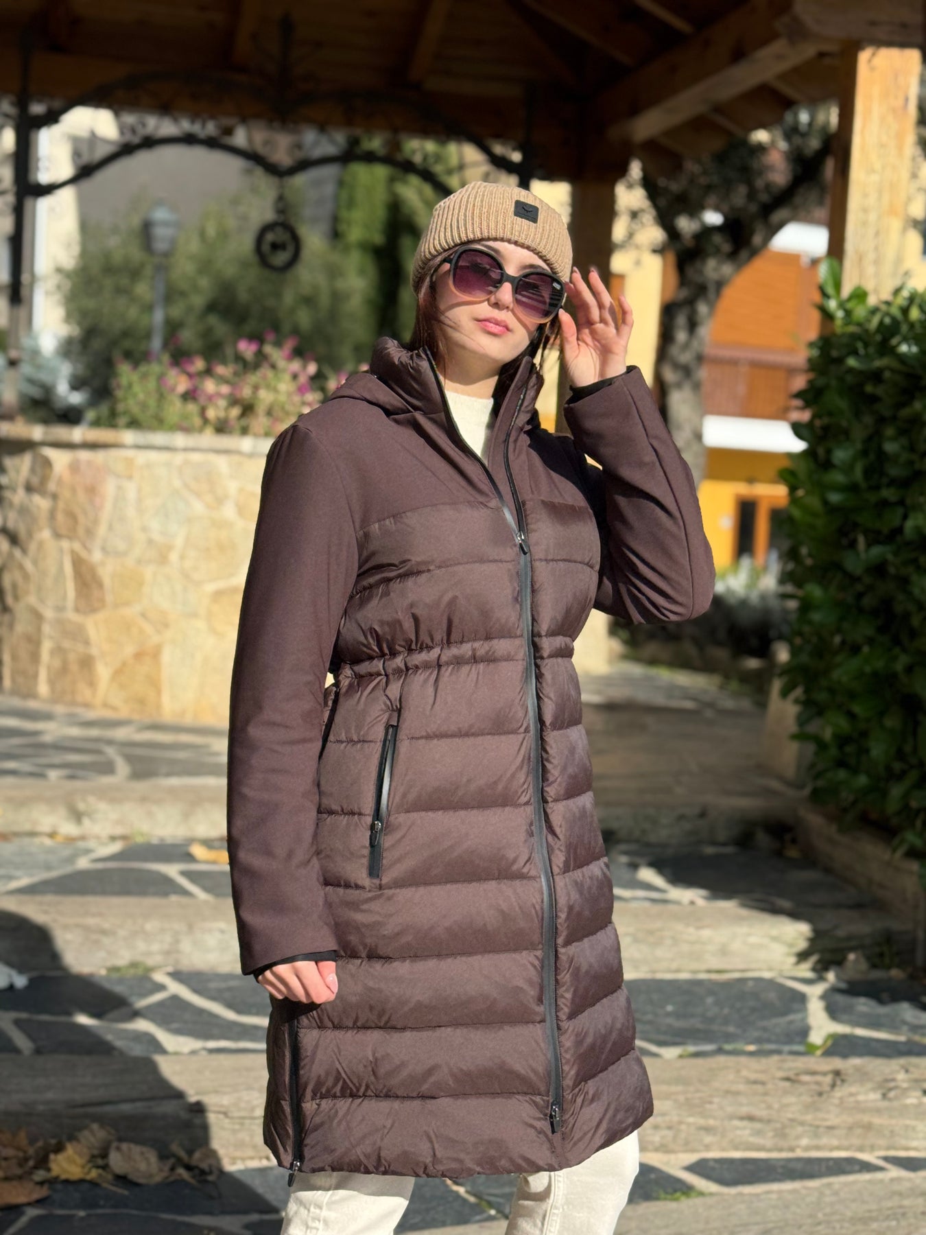 El modelo Hythe ahora en color marrón café, es a la vez una chaqueta y un abrigo, va acolchada y es perfecta para los días más fríos del año, con un estilo deportivo pero a la vez muy elegante gracias a su silueta curva y el ajuste en cintura que la hace muy femenina. Nos encanta cómo combina dos tipos de tejidos, lo que le confiere más elegancia que un plumas clásico.