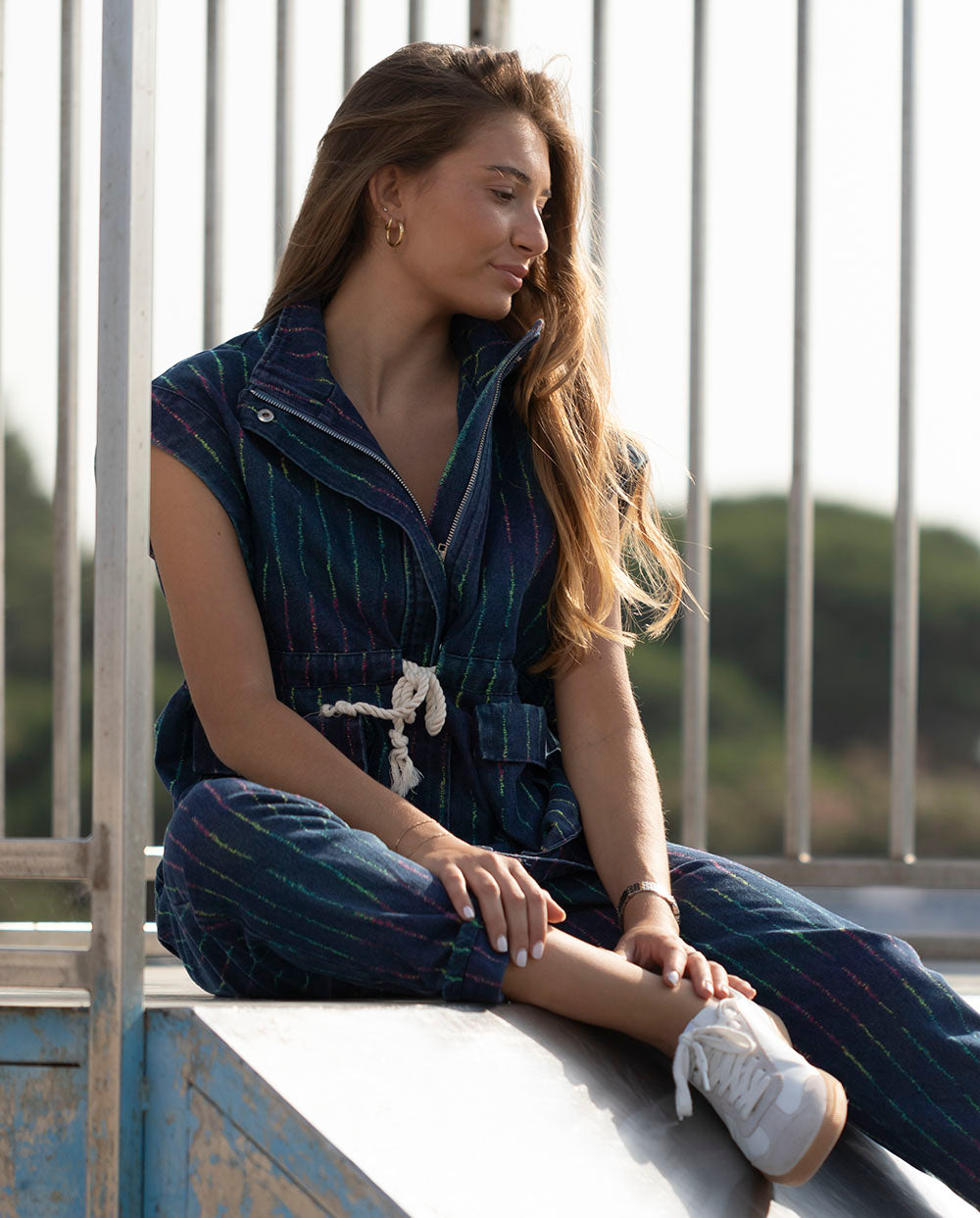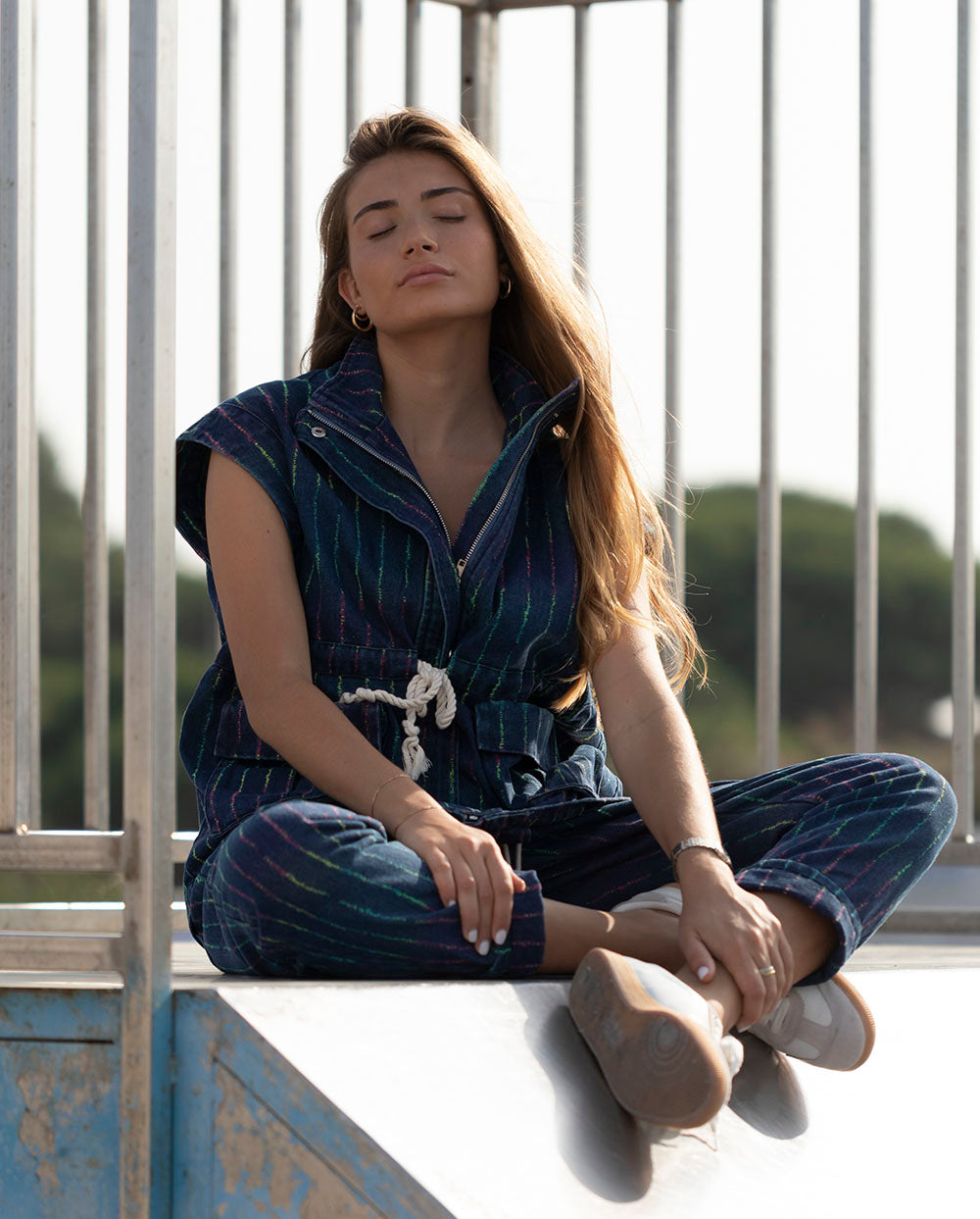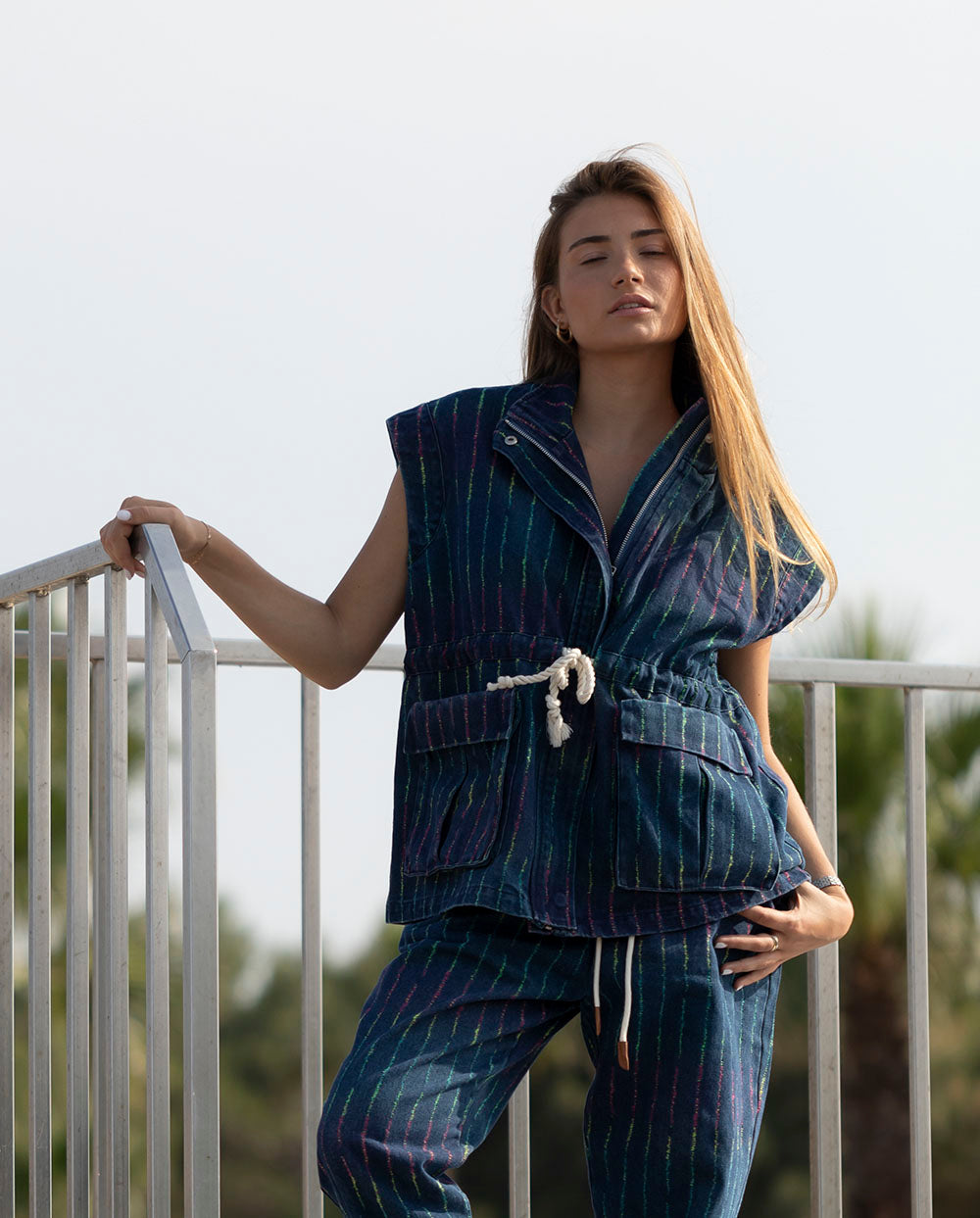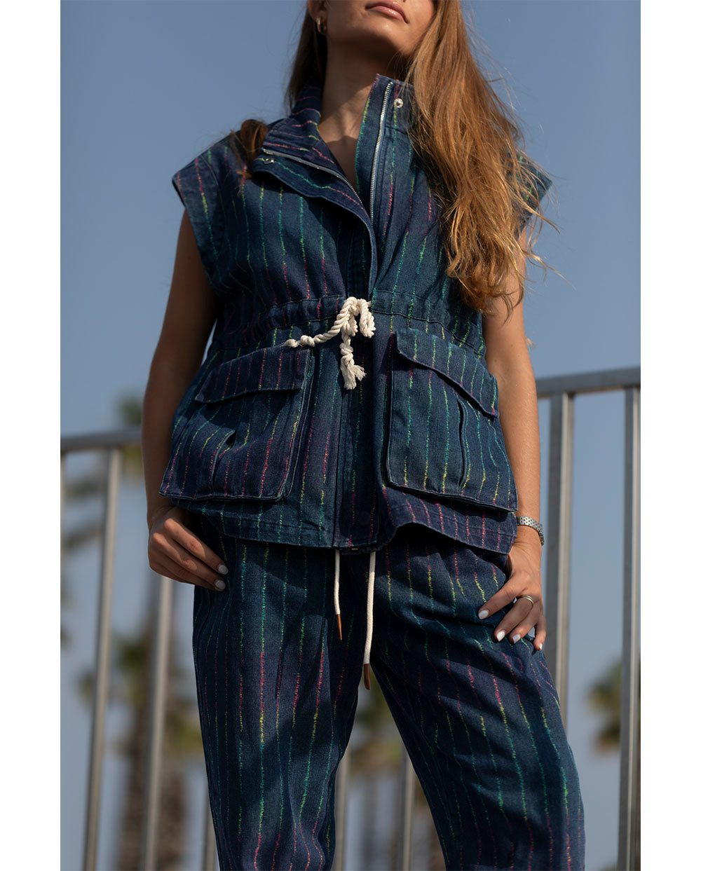 Chaleco cargo en tejido vaquero azul oscuro con rayas multicolor, que se ajusta a tu cintura con cordón. cierre con cremallera y crochetes. Puedes combinarlo con el pantalón Lola de la misma colección.