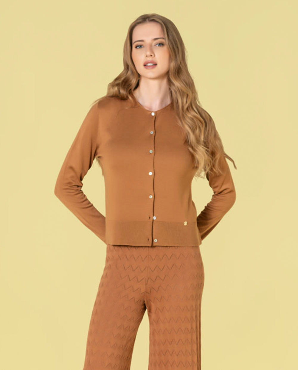 Rebeca con botones color marrón caramelo, con tejido ligero y suave al tacto. Largo por debajo de la cintura. De la nueva colección de Rüga para la temporada primavera-verano 2026.