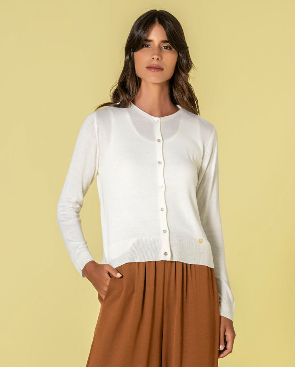 Rebeca con botones color crudo, con tejido ligero y suave al tacto. Largo por debajo de la cintura.