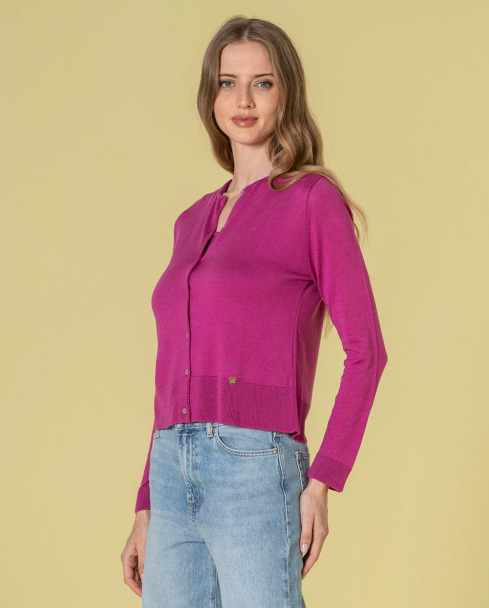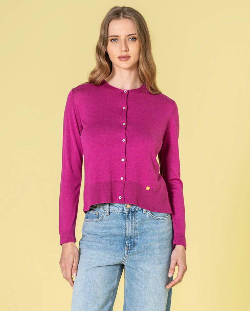 Rebeca con botones color rosa rosa buganbilla, con tejido ligero y suave al tacto. Largo por debajo de la cintura.
