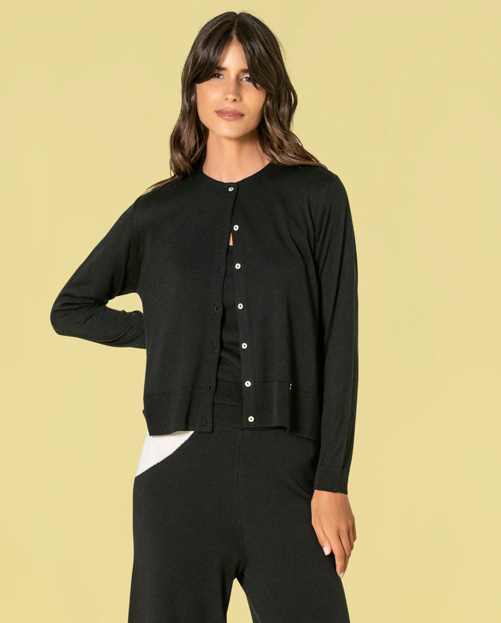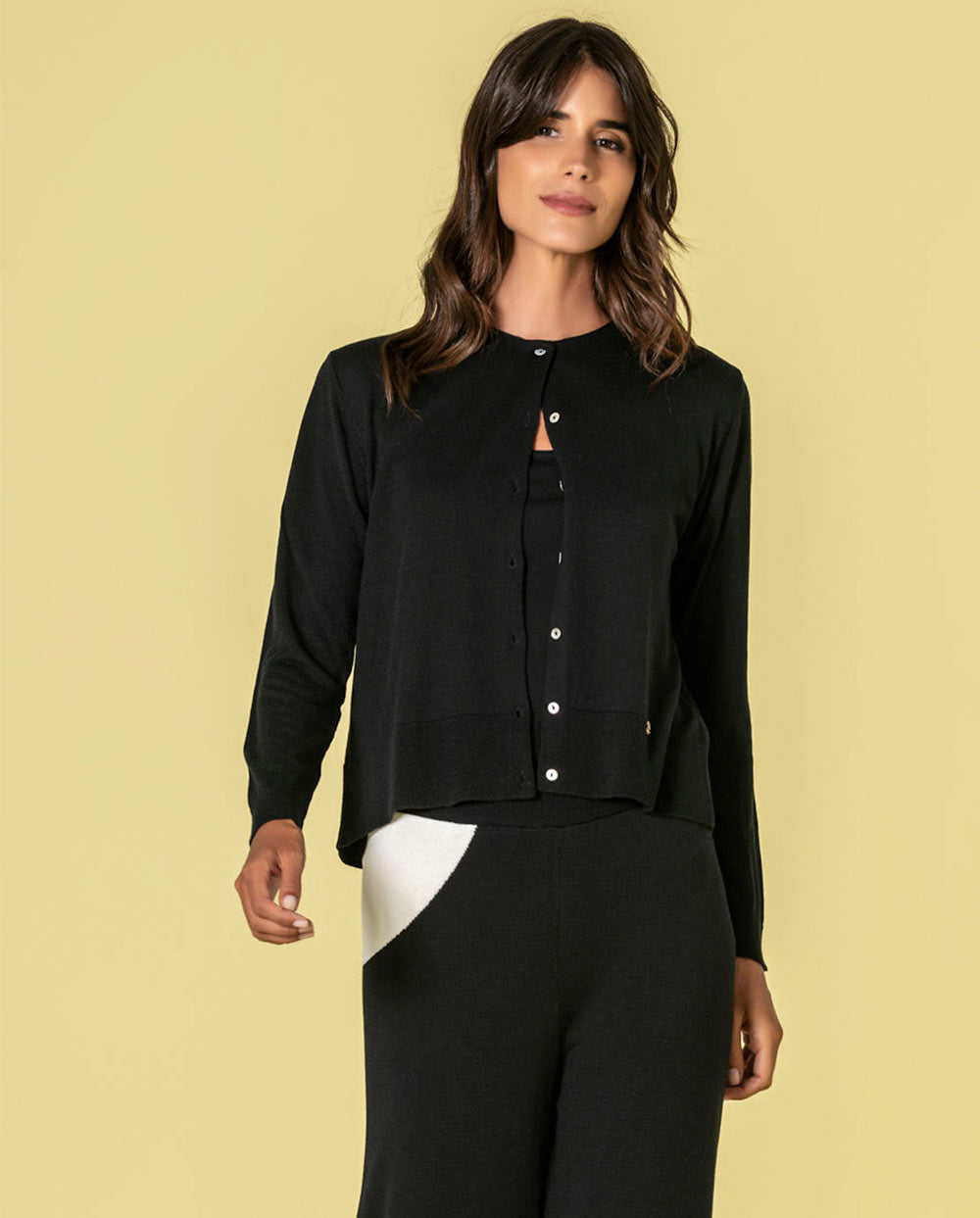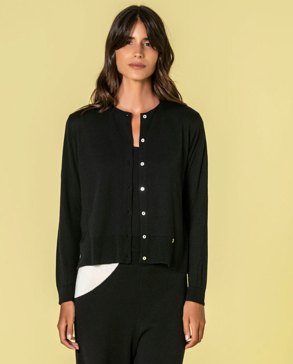 Rebeca con botones color negro, con tejido ligero y suave al tacto. Largo por debajo de la cintura. De la nueva colección de Rüga para la temporada primavera-verano 2026.
