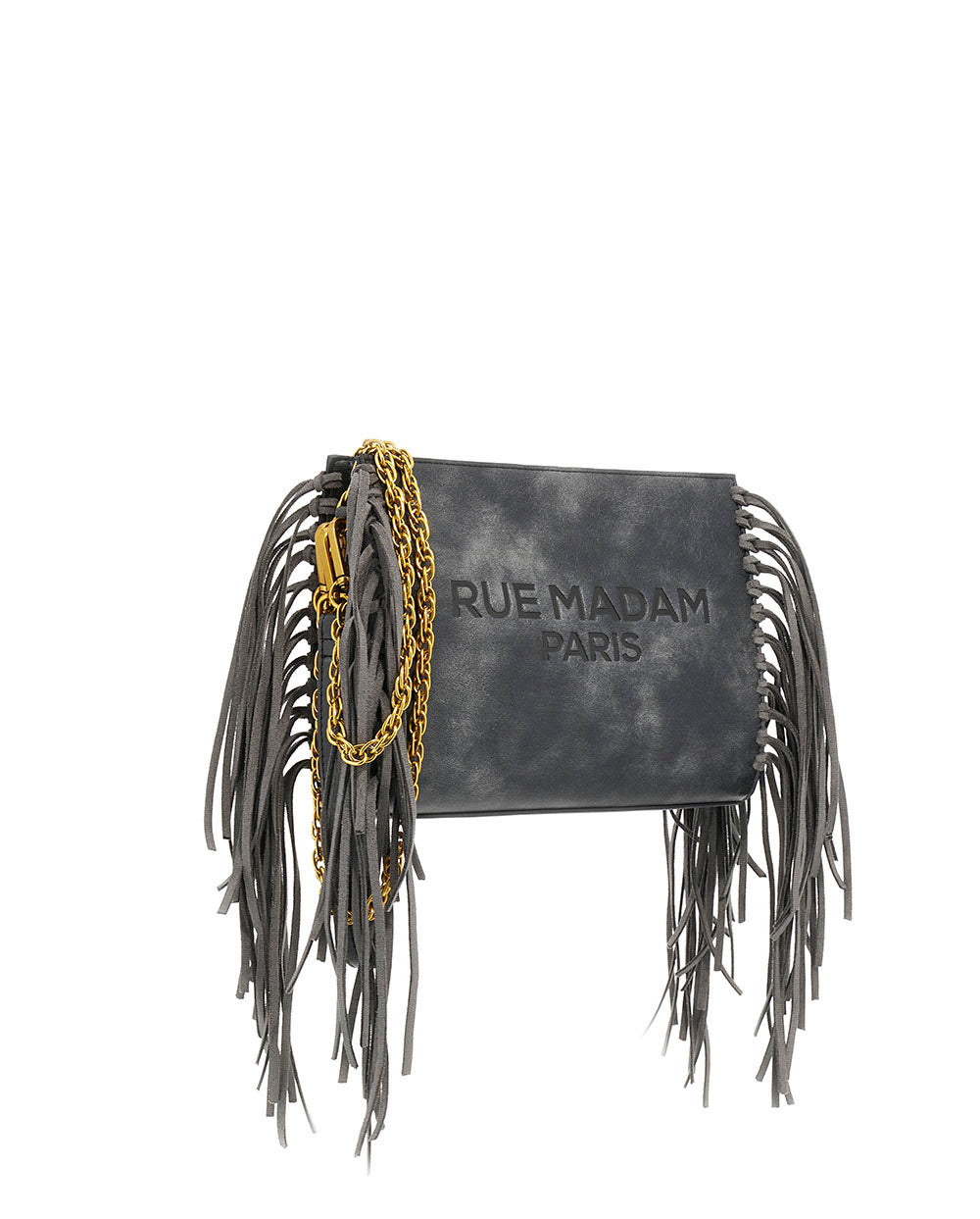 Bolso de mano de ecopiel  vegana  efecto vintage con logotipo grabado y flecos de ante en ecopiel. Cadena Bandolera desmontable y forro interior de algodón con bolsillo.