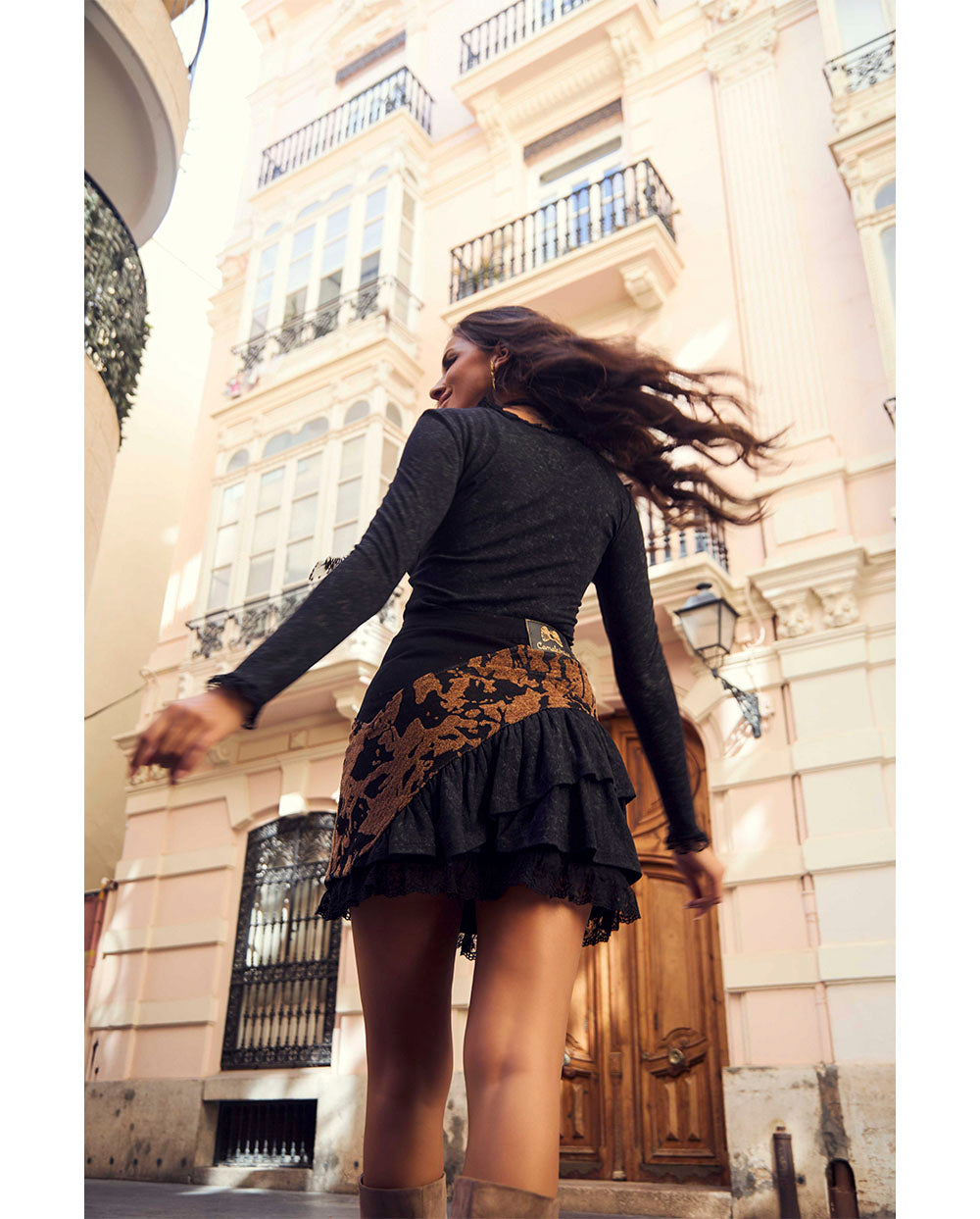 Camiseta Atacamita en un tejido gris carbón con detalle de encaje en el escote y en los puños, de la firma Camaleónica