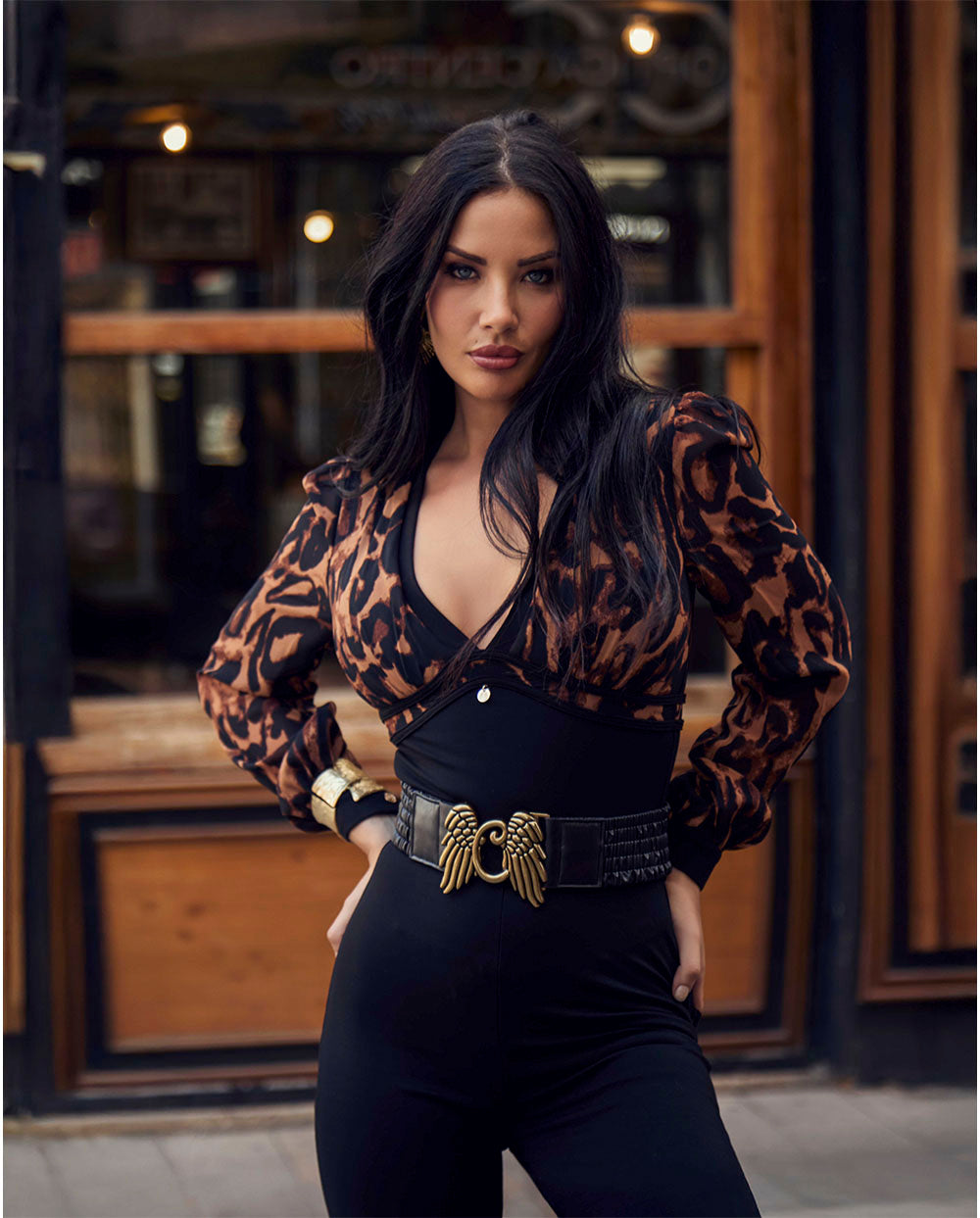 Mono Orquídea combinado en la parte superior con tejido animal print y el resto en negro. Escote pronunciado en uve.Manga larga abullonada semi transparente. Cierre con cremallera en espalda. Pantalón recto color negro. Doble bolsillo trasero.