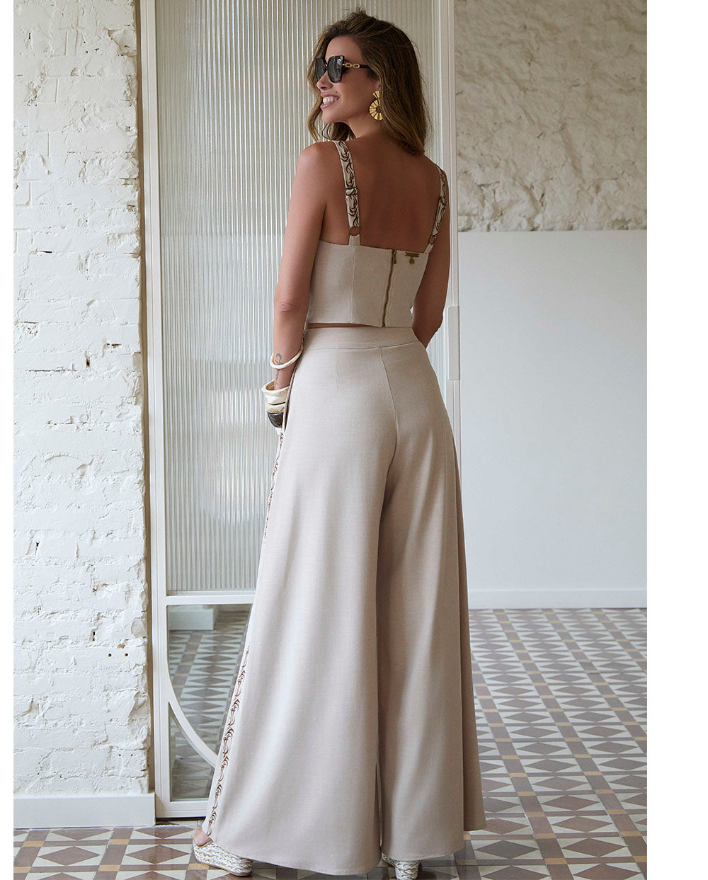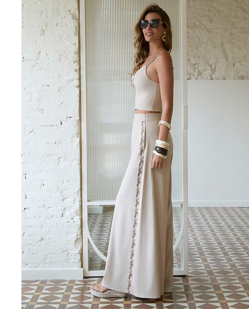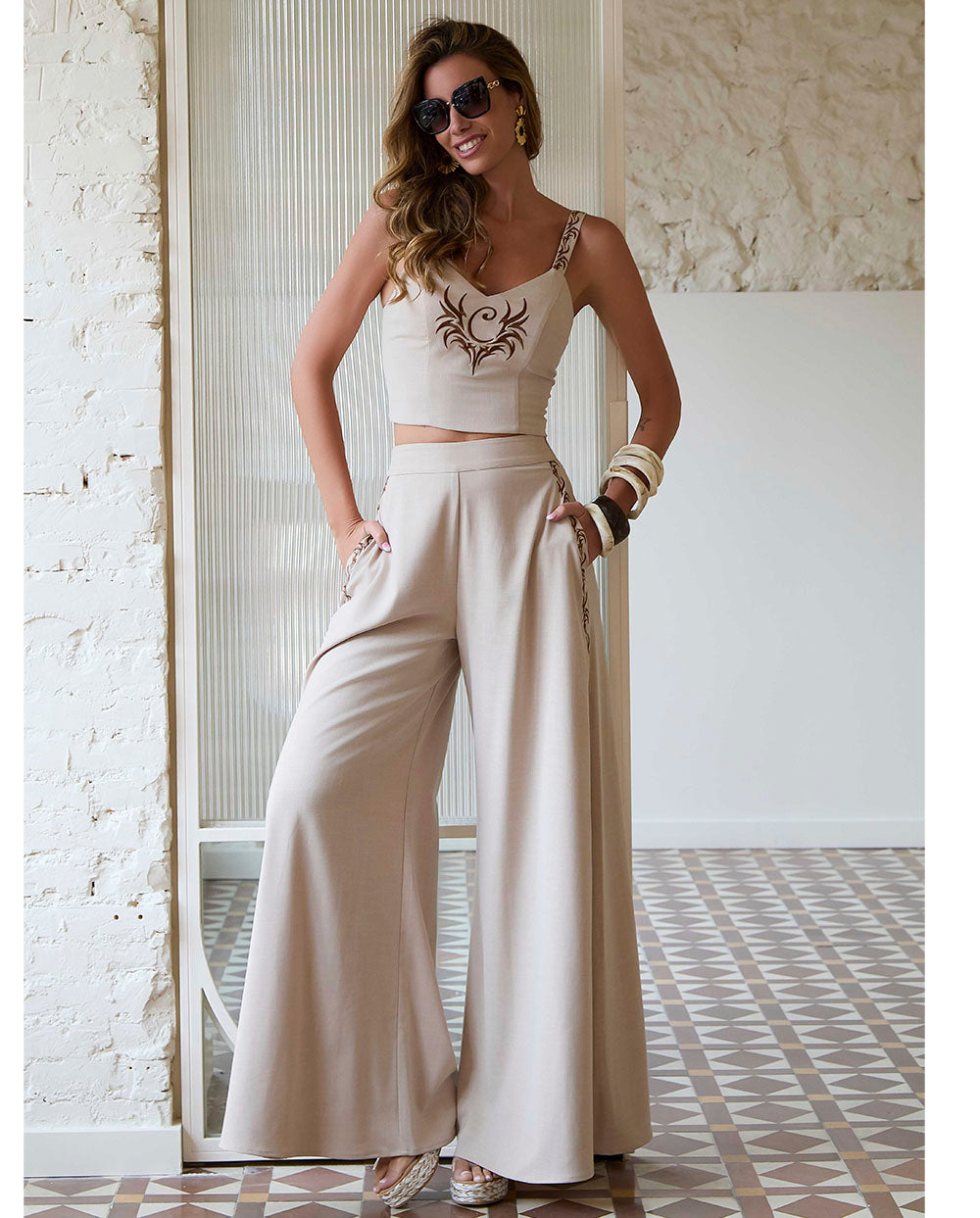 Top de tirantes Jilguero en color piedra, con bordado de la C de Camaleónica en el pecho en tono marrón tostado, escote escote en uve y tirante ancho ajustable con bordado, a conjunto con el pantalón de la misma serie. El top queda ajsutado a tu silueta a través de una cremallera en la espalda.