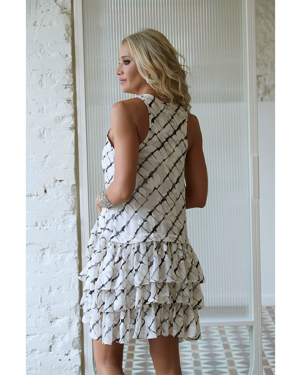Cómodo y femenino, el modelo Seron es un vestido corto sin mangas, con escote amplio redondo, y líneas de volantes por debajo del pecho.