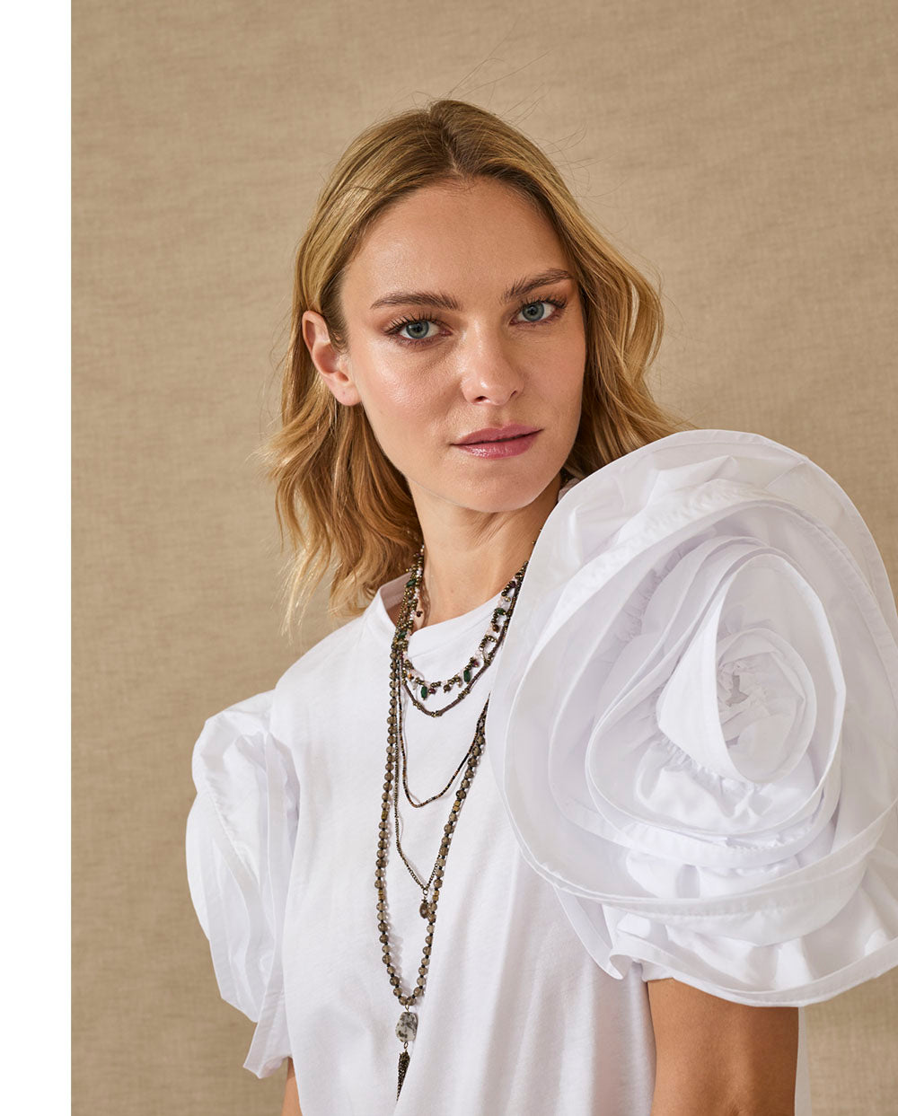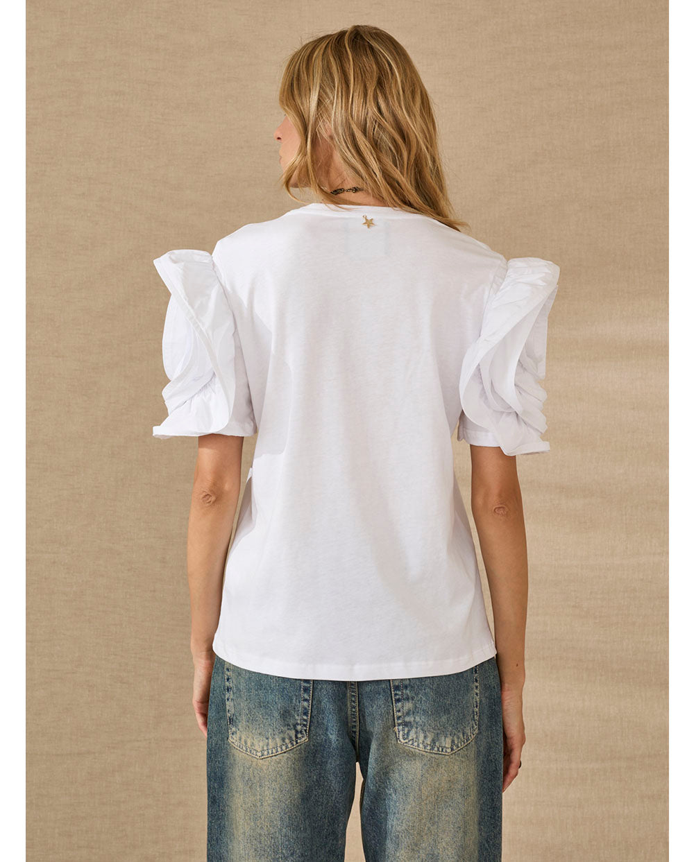 Camiseta blanca de manga corta y cuello redondo, con aplicación de rosa grande en la manga..