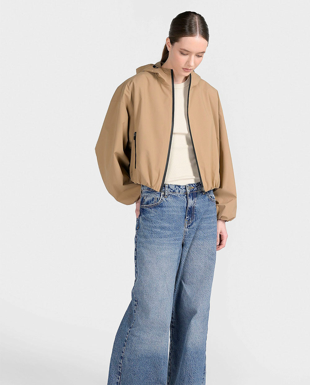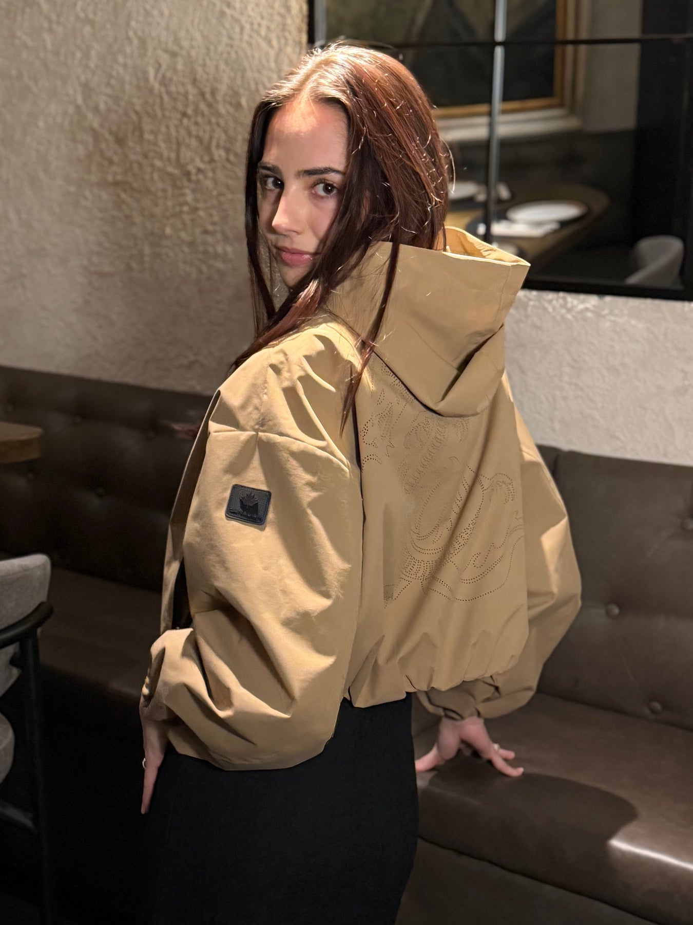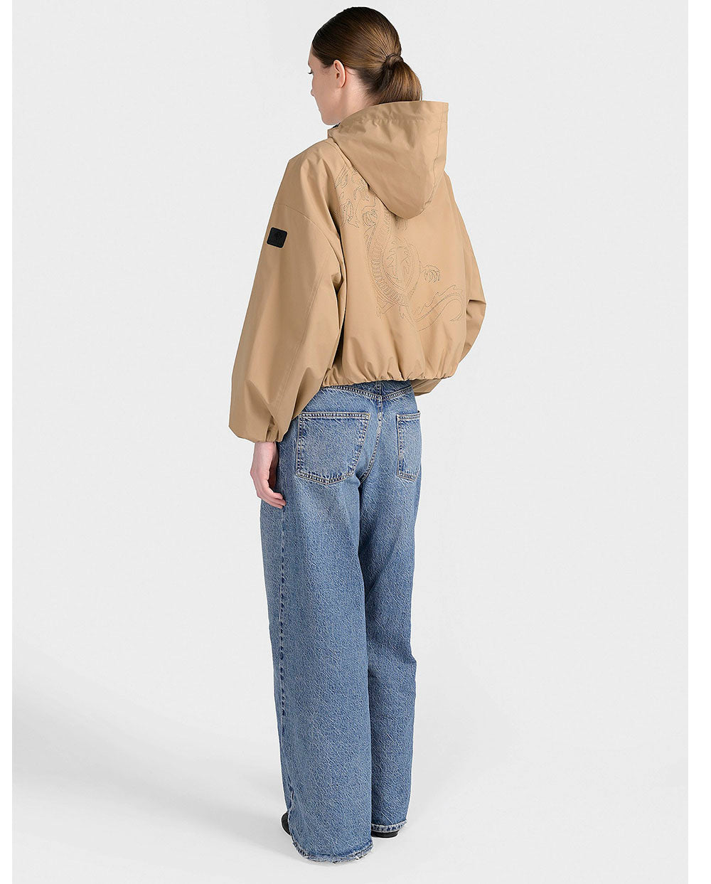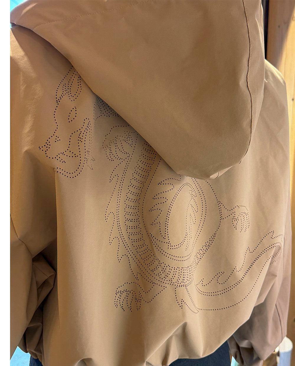 Chaqueta corta impermeable de la firma Canadian Classics en color marrón biscuit, que lleva un sorprendente diseño de Dragón en la tela exterior. Incorpora capucha, dos bolsillos y cremalleras termoselladas en color negro.