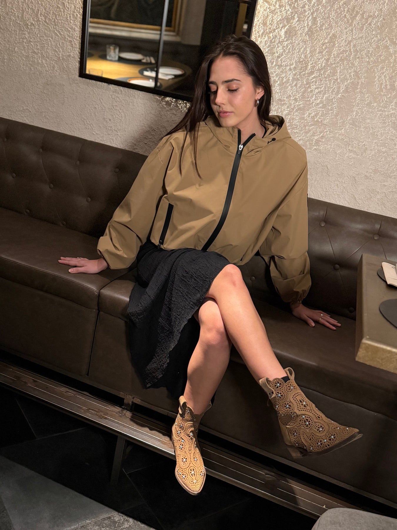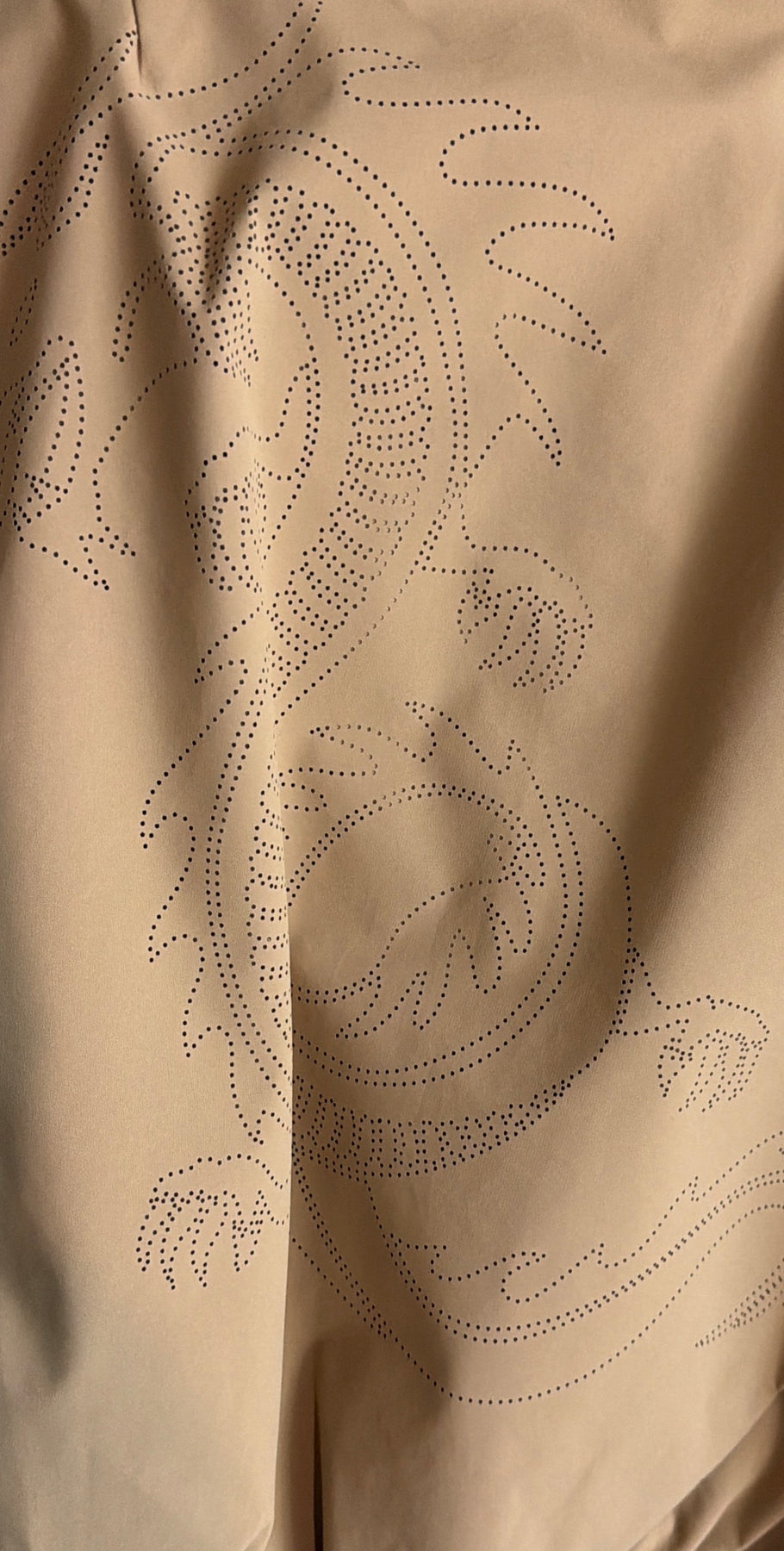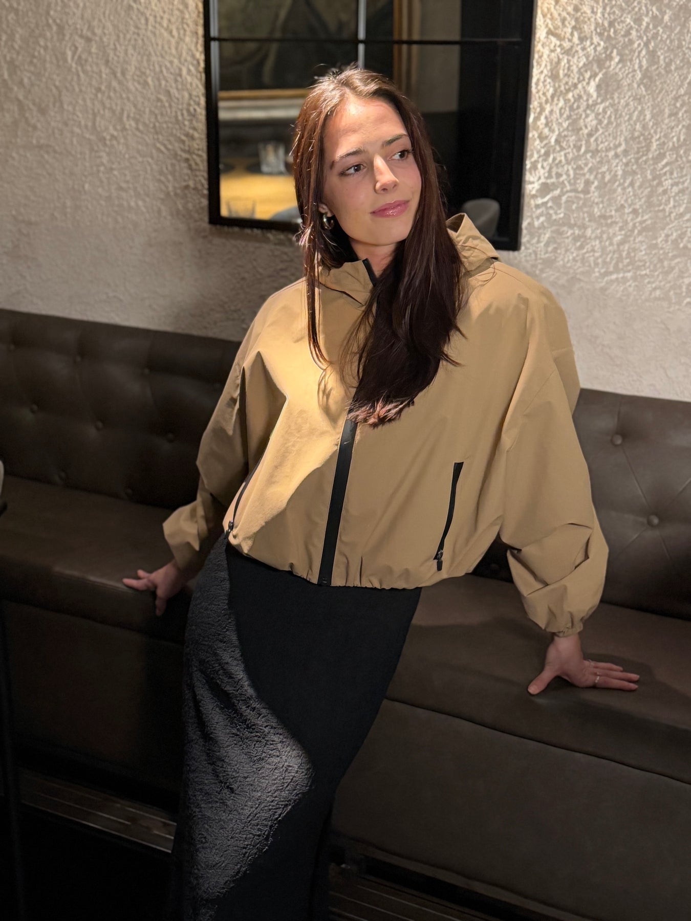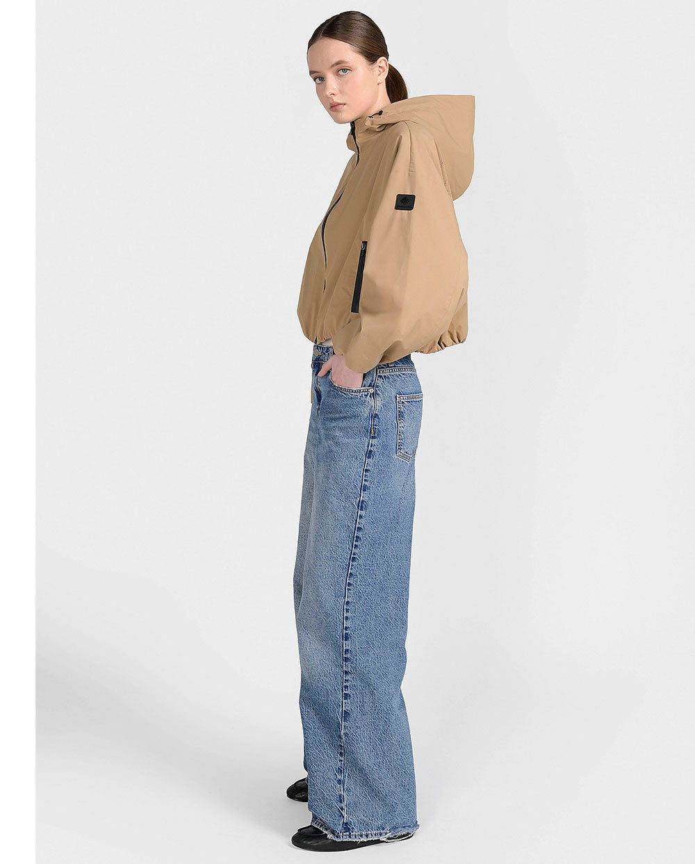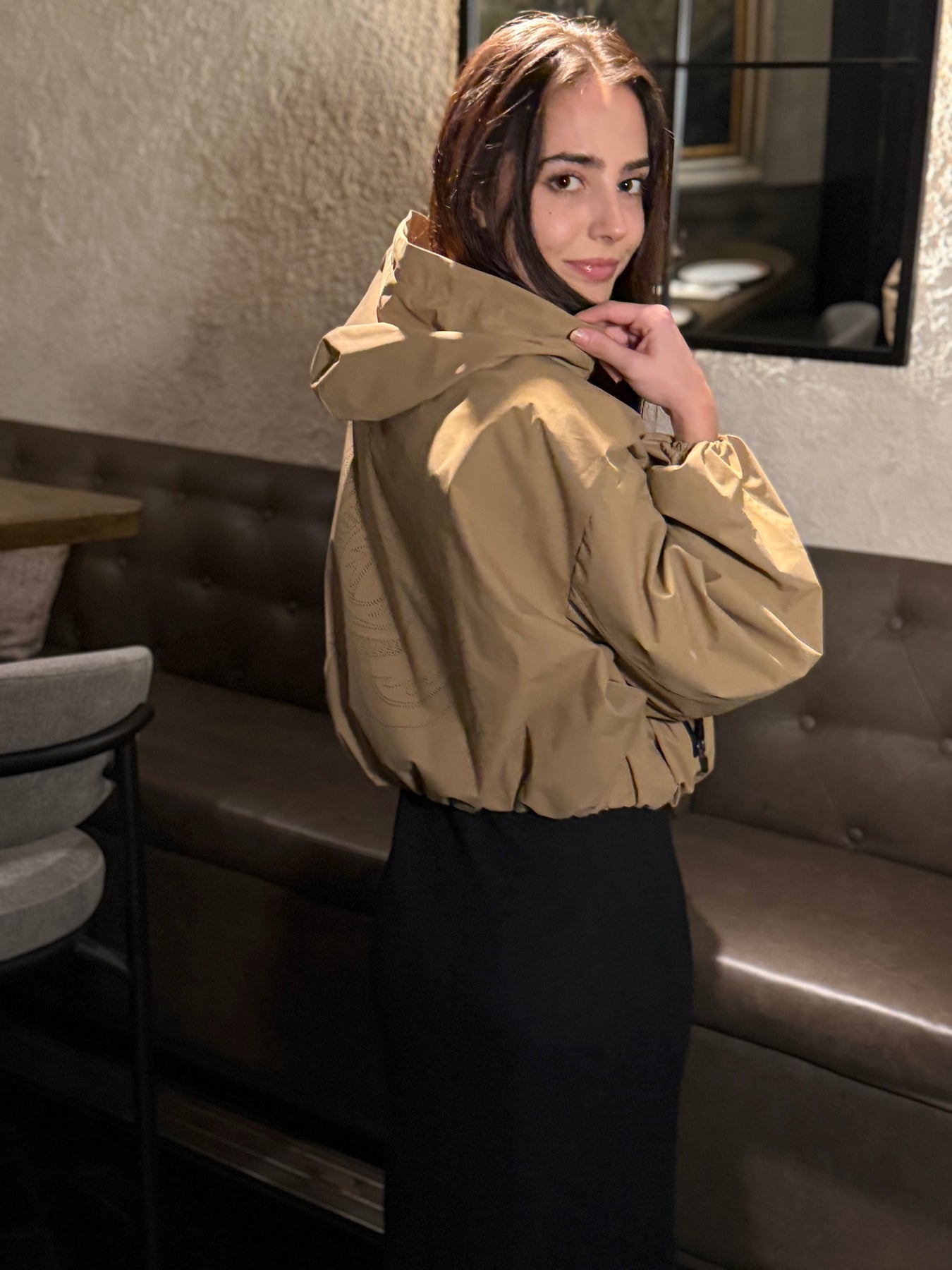 Chaqueta corta impermeable de la firma Canadian Classics en color marrón biscuit, que lleva un sorprendente diseño de Dragón en la tela exterior. Incorpora capucha, dos bolsillos y cremalleras termoselladas en color negro.