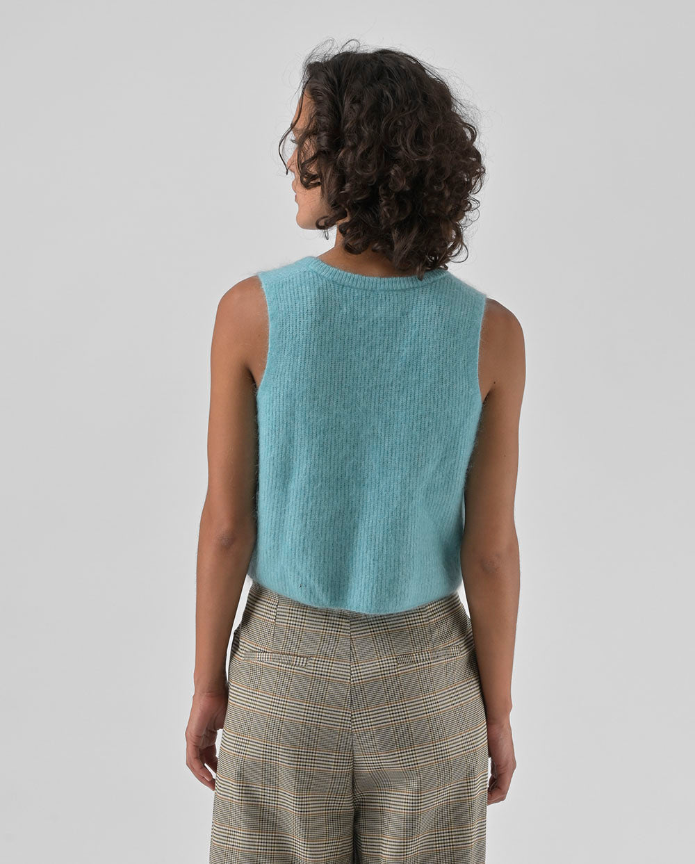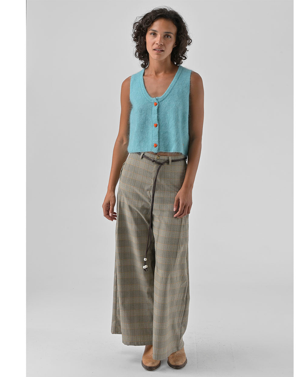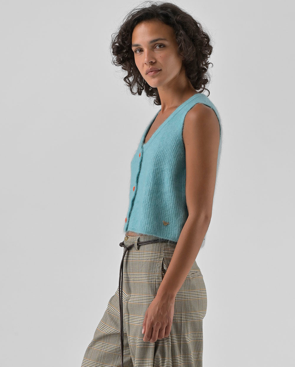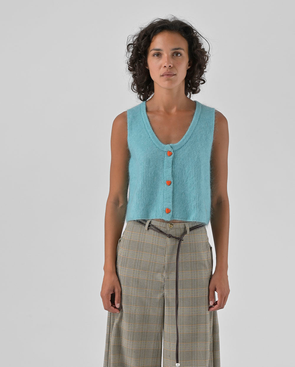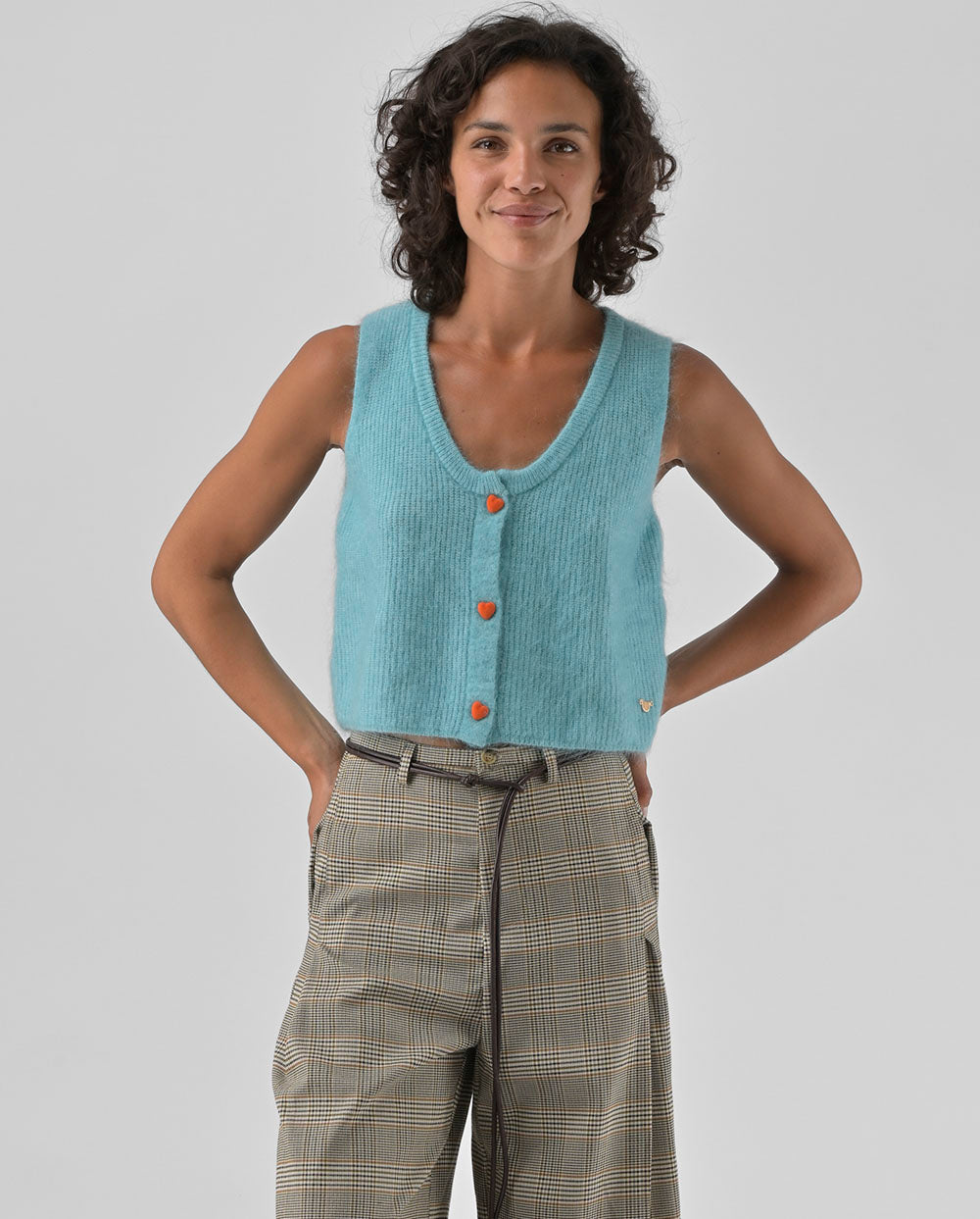Chaleco de punto azul turquesa con botones en forma de corazón en color naranja.