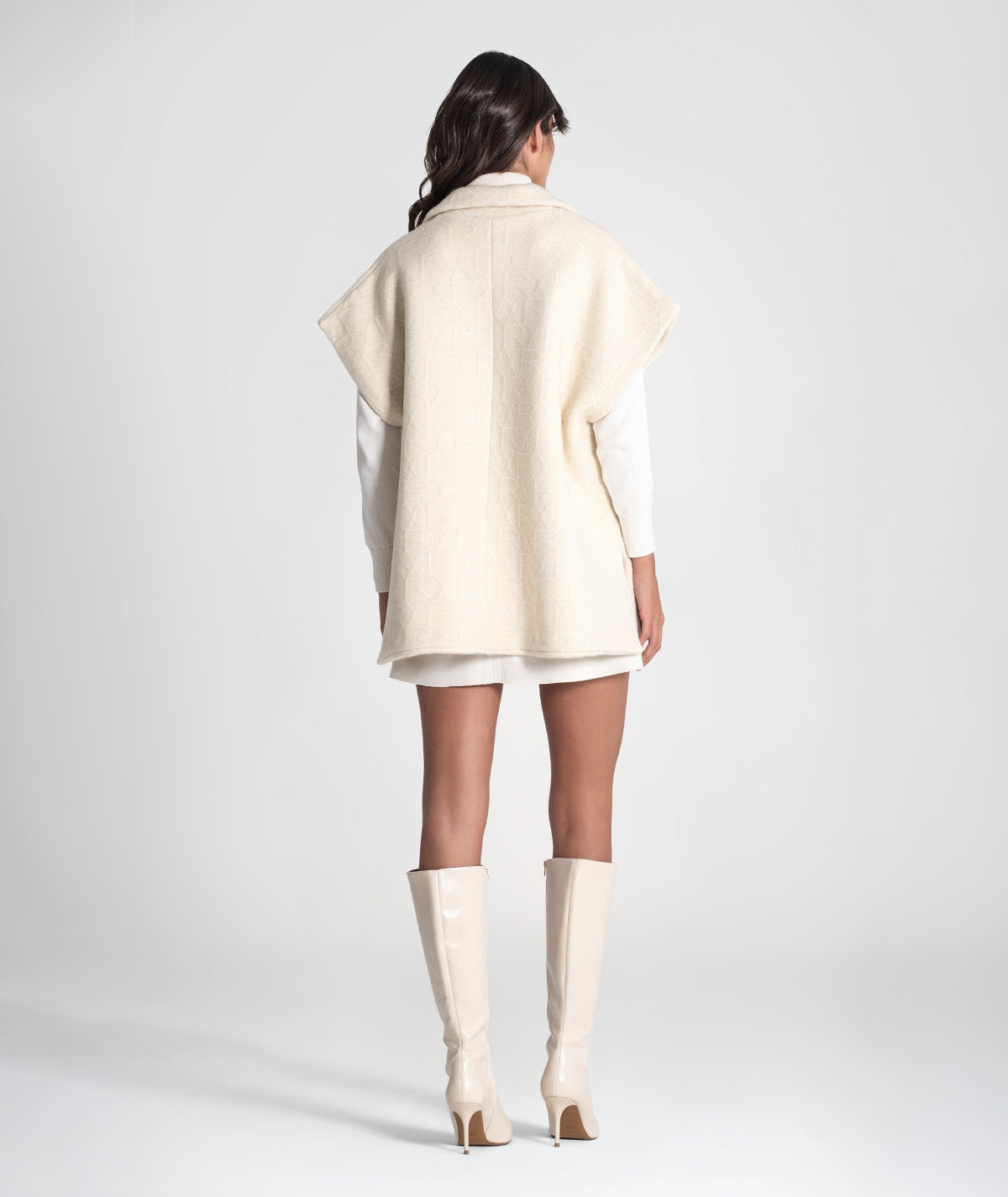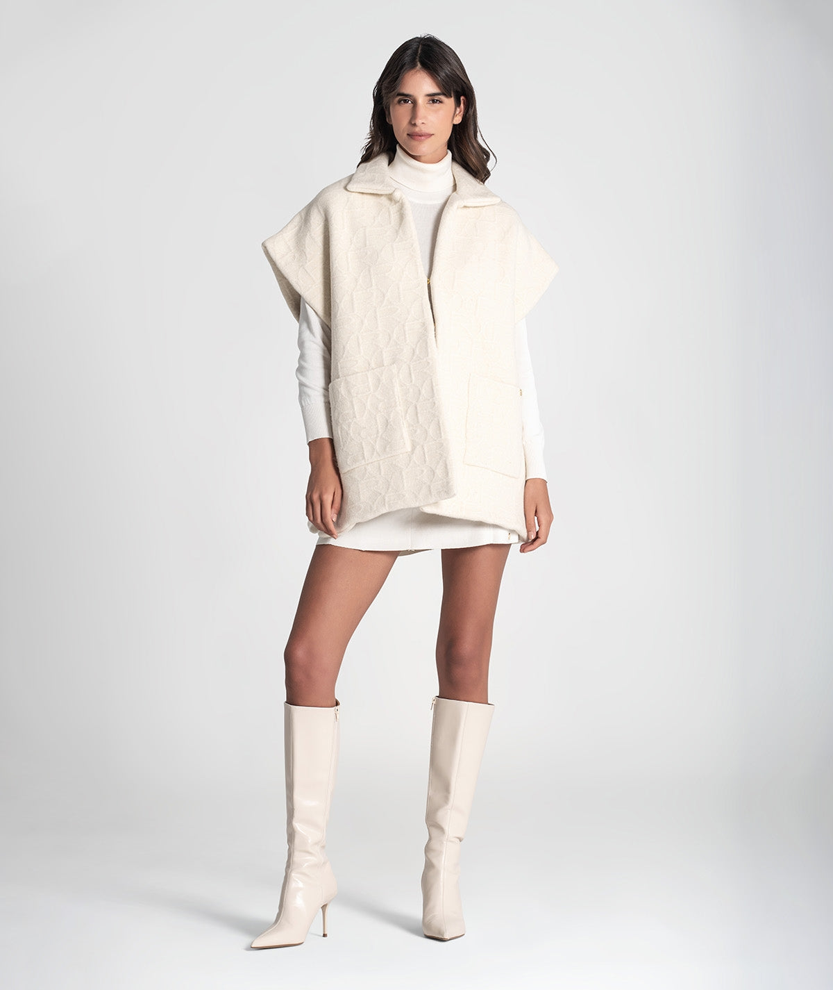 Chaleco capa sin mangas crudo, con detalle de relieve de la firma. Cierre invisible y dos bolsillos.