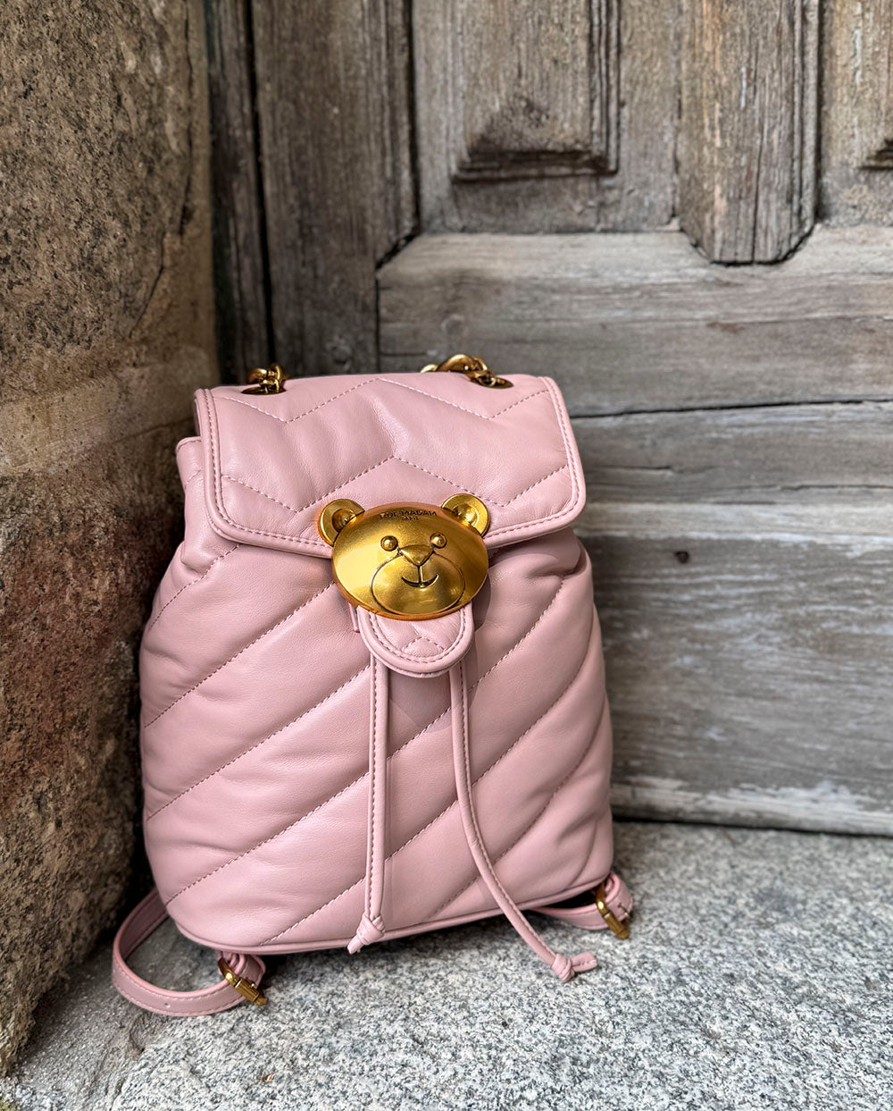 Mochila Puffy en ecopiel suave y acolchada. Cierre con imán en forma de osito y asa de cadena con efecto metálico envejecido.