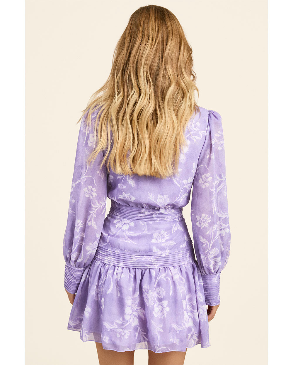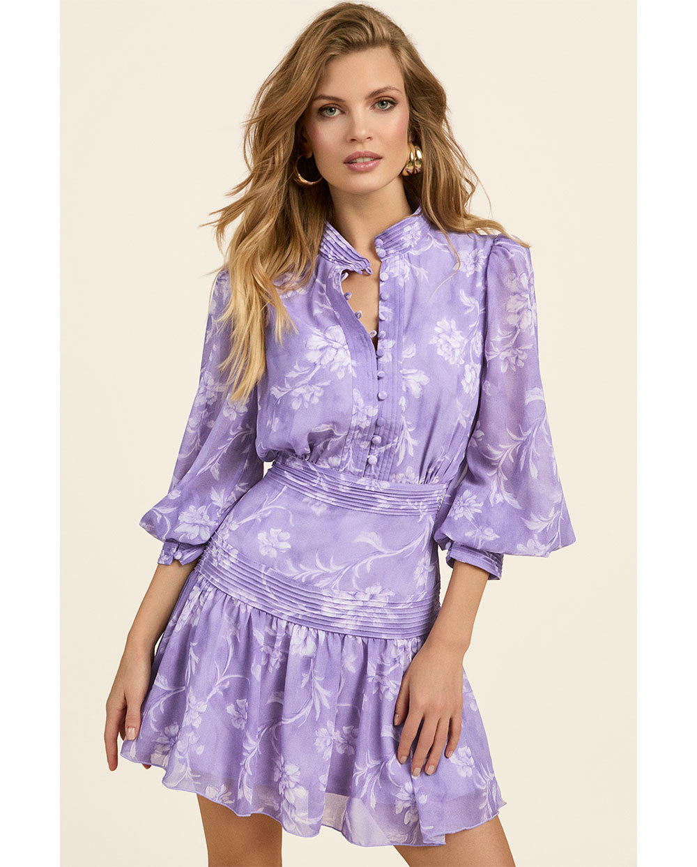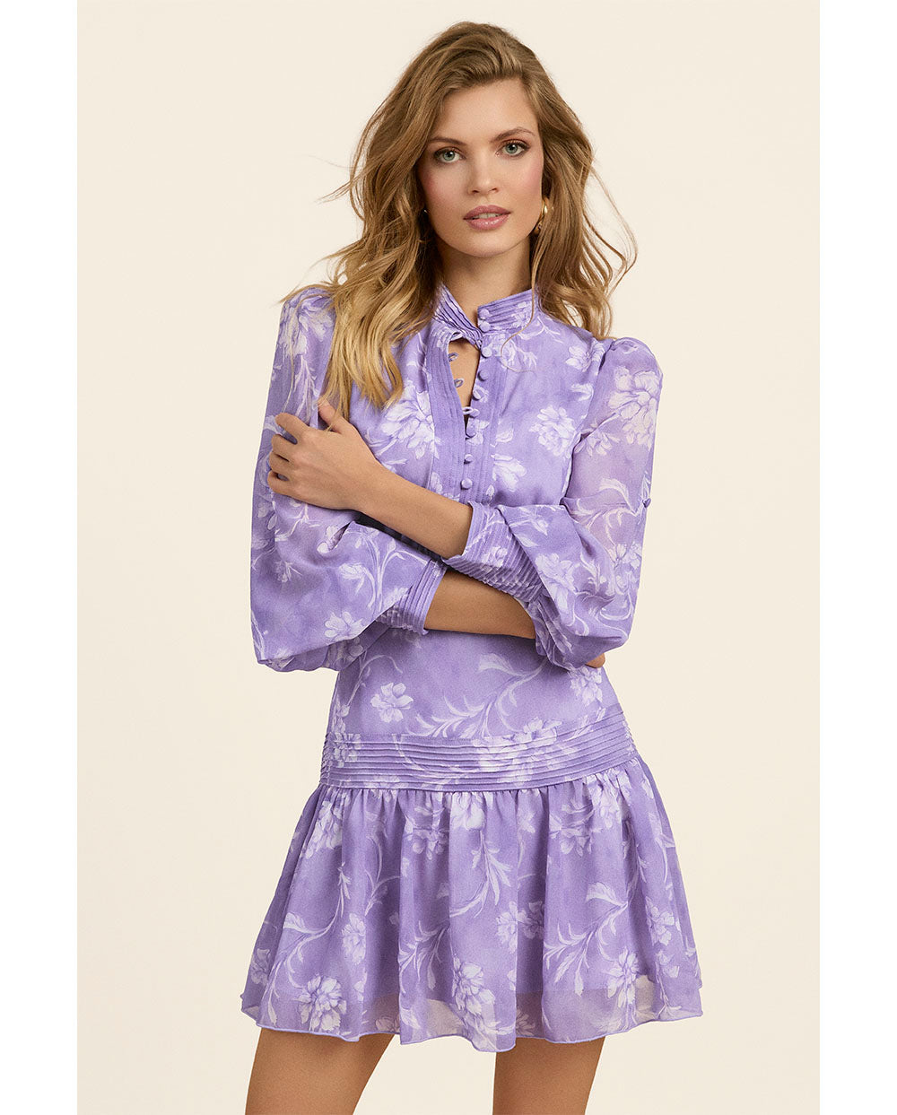 Vestido Florentine en estampado de flores lila, con cuello mao y manga larga, de la Nueva colección de Fetiche Suances Primavera-verano 2026