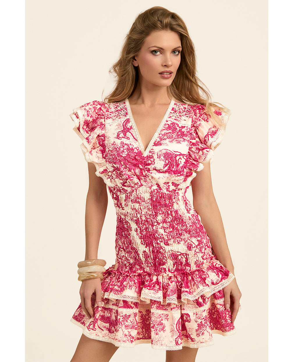 Vestido corto Versailles de la Nueva colección de Fetiche Suances Primavera-verano 2026. Lleva el cuerpo engomado, para adaptarse a tu figura, un favorecedor escote en pico y volantes en la falda y sobre los hombros.