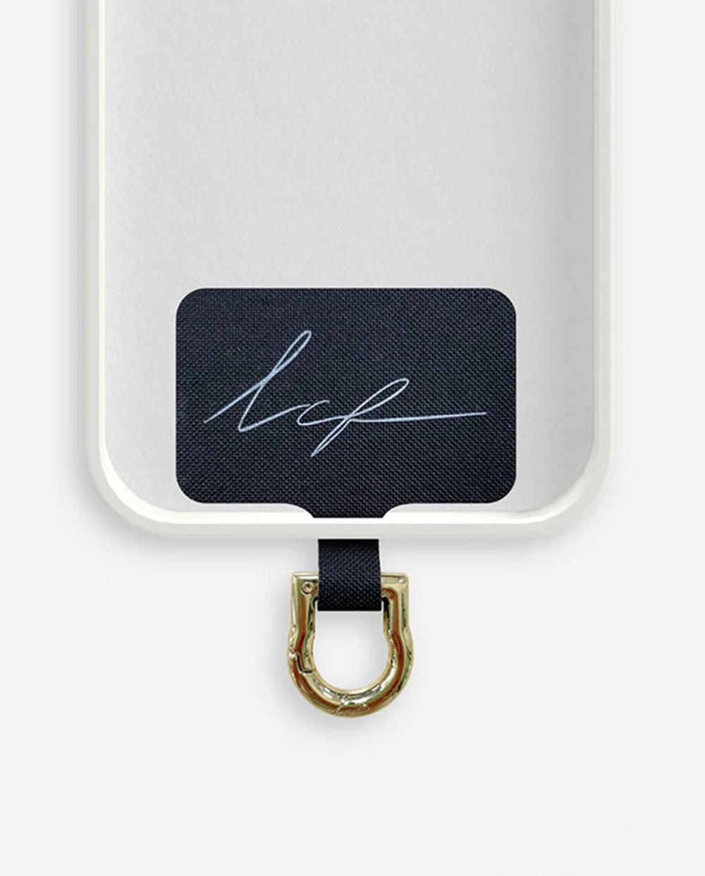 Adaptador universal para cadenas de teléfonos móviles con mosquetón en dorado, diseñado para conectar fácilmente la cadena a cualquier teléfono sin quitar la funda.