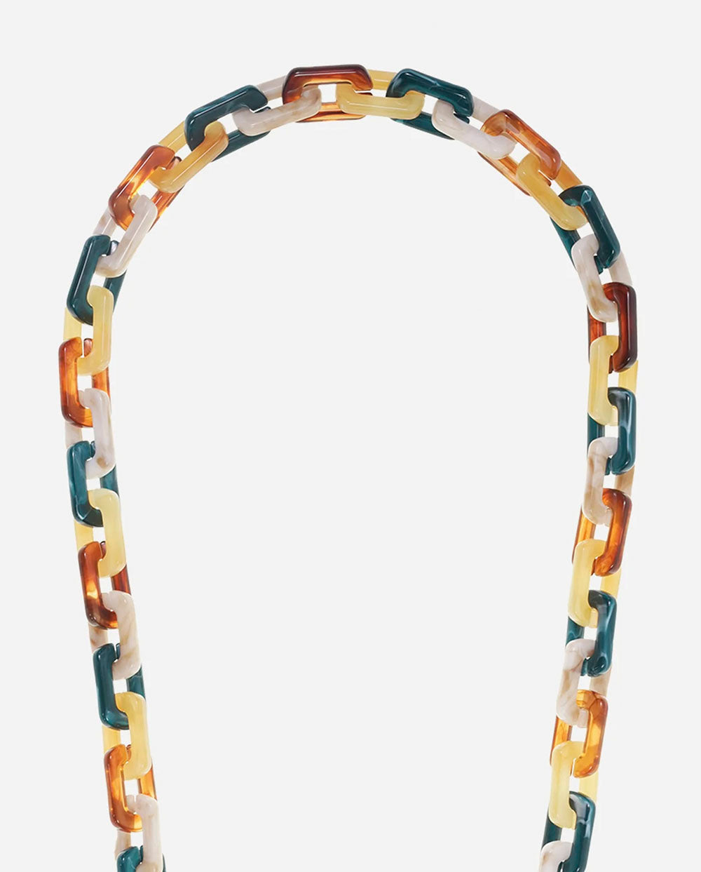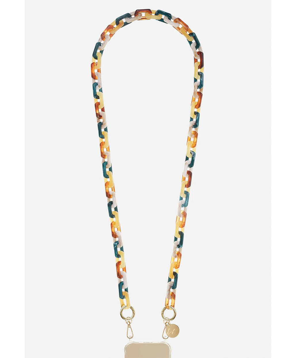 Cadena para teléfono movil Emmy de 120 cm de largo, de varios colores con cierres dorados, de doble mosquetón y medallón decorativo.