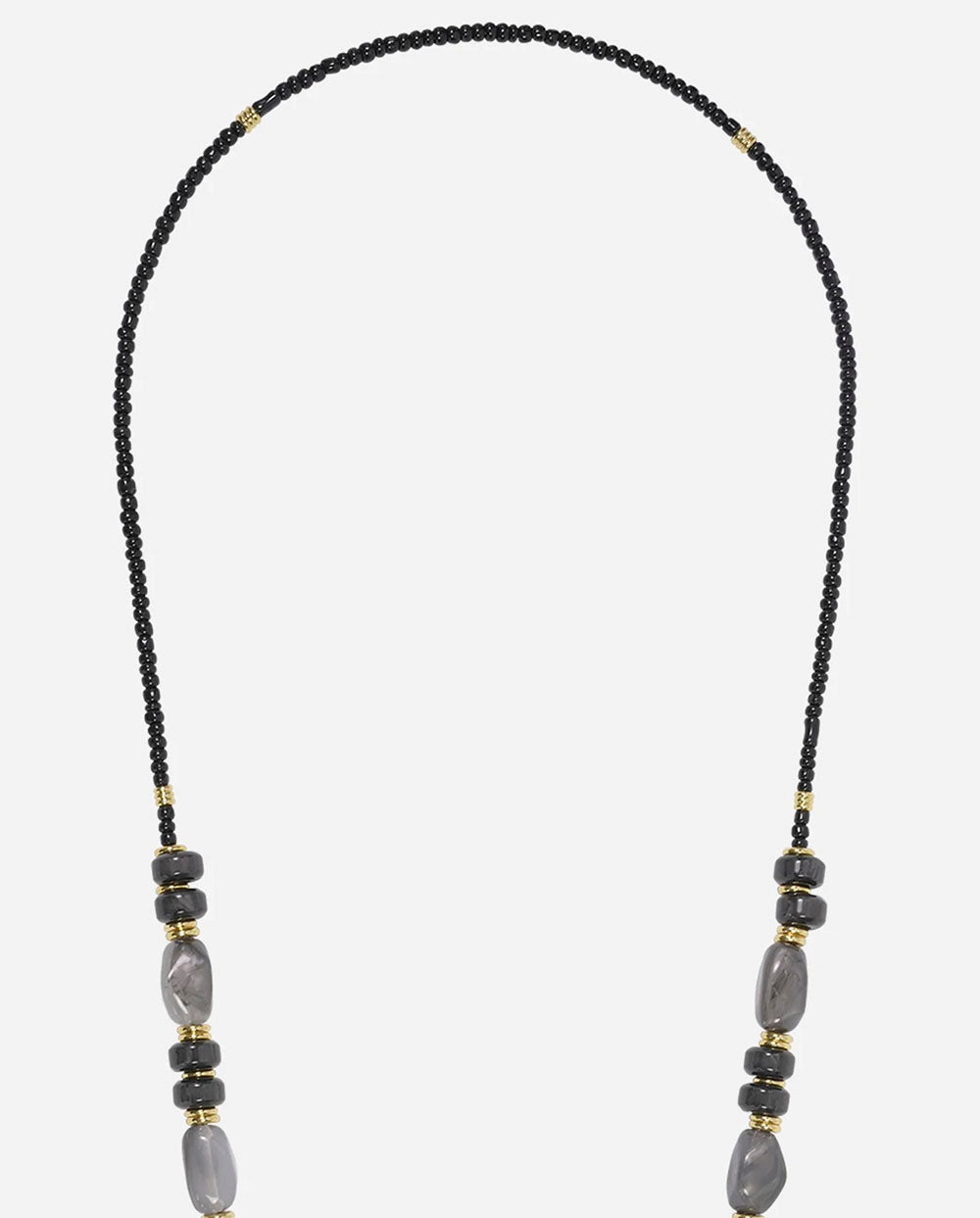 Cadena para teléfonos móviles Chiara, elaborada  con cuentas grises y negras. Lleva los cierres de mosquetón dorados y Medallón decorativo grabado también en dorado.