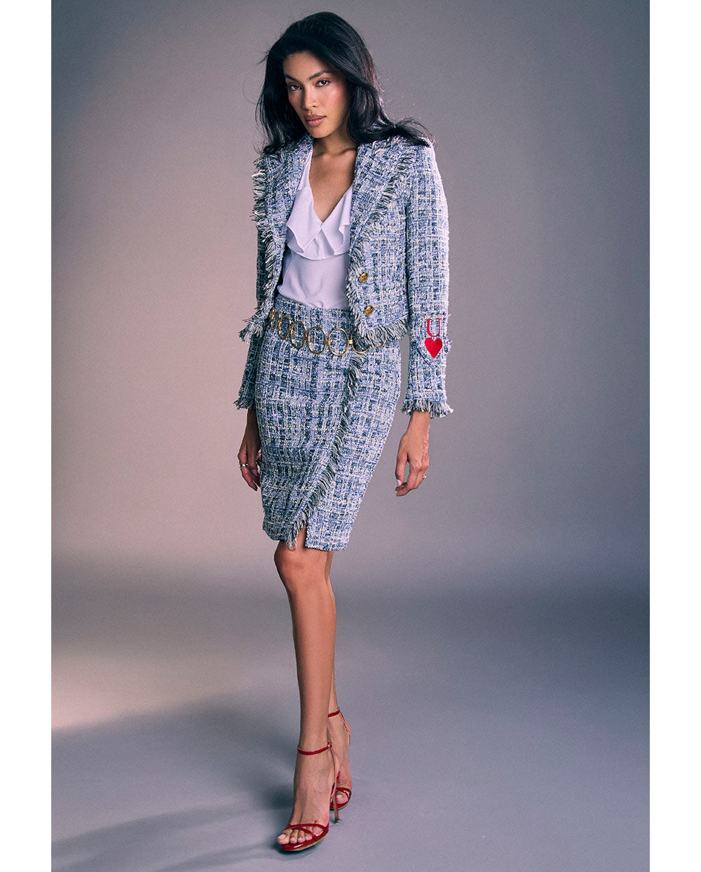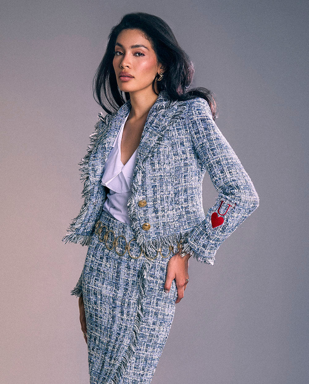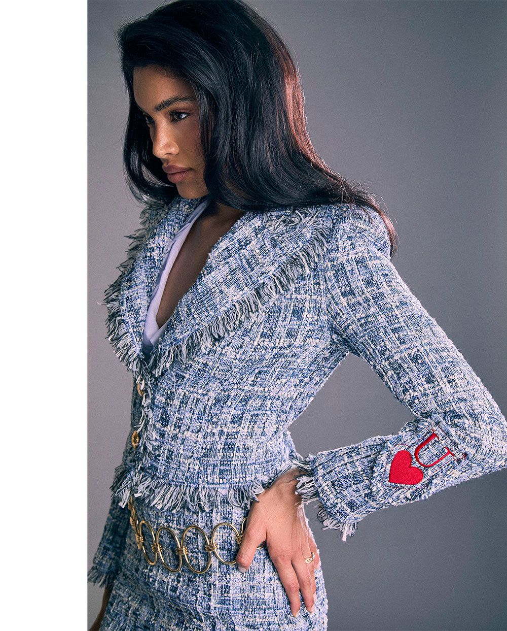 Es una blazer que cierra por debajo del pecho con dos grandes botones en dorado, en tejido estilo chanel azul, con detalles de desflecados ribeteando los bajos y solapas.