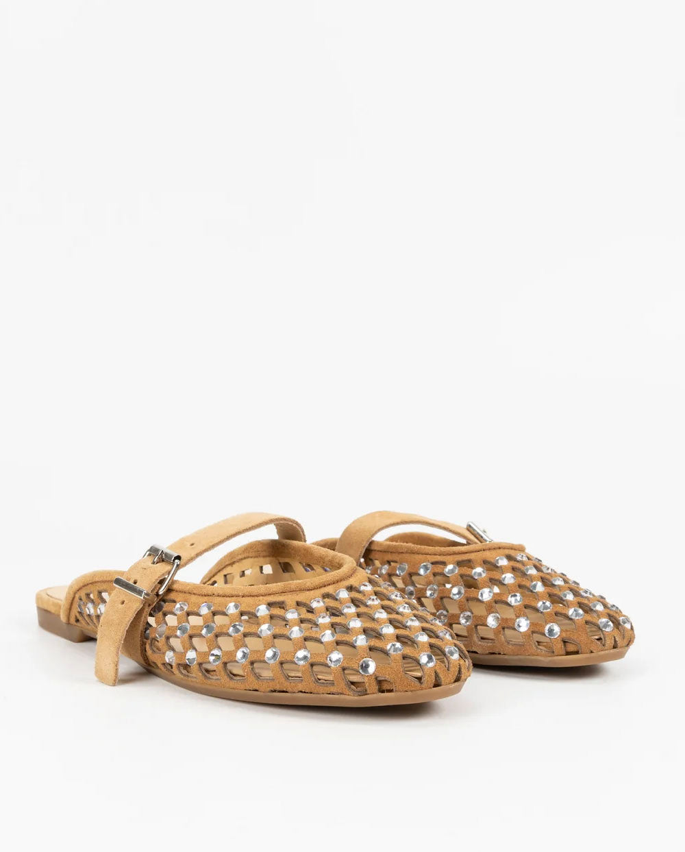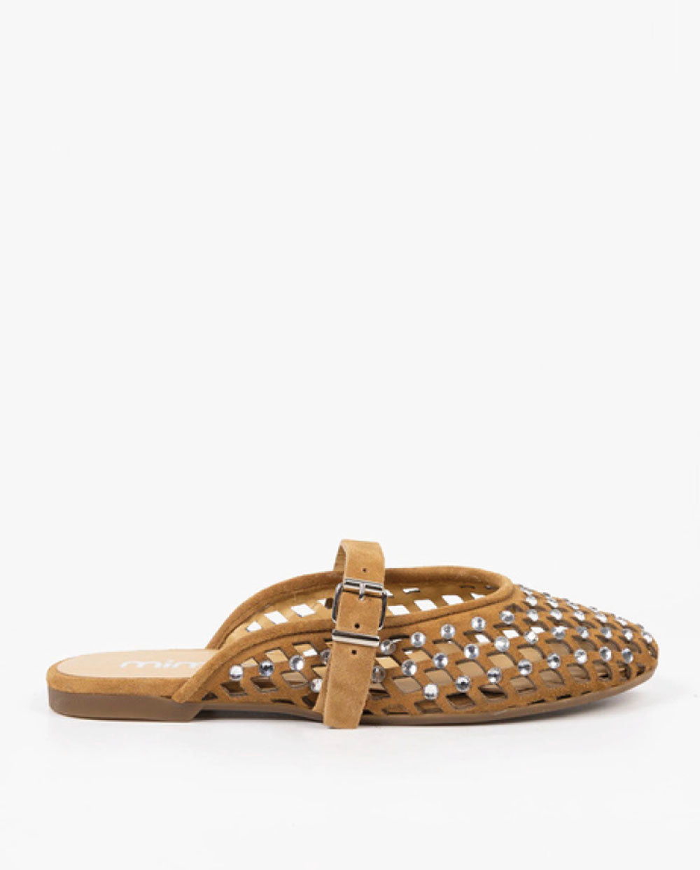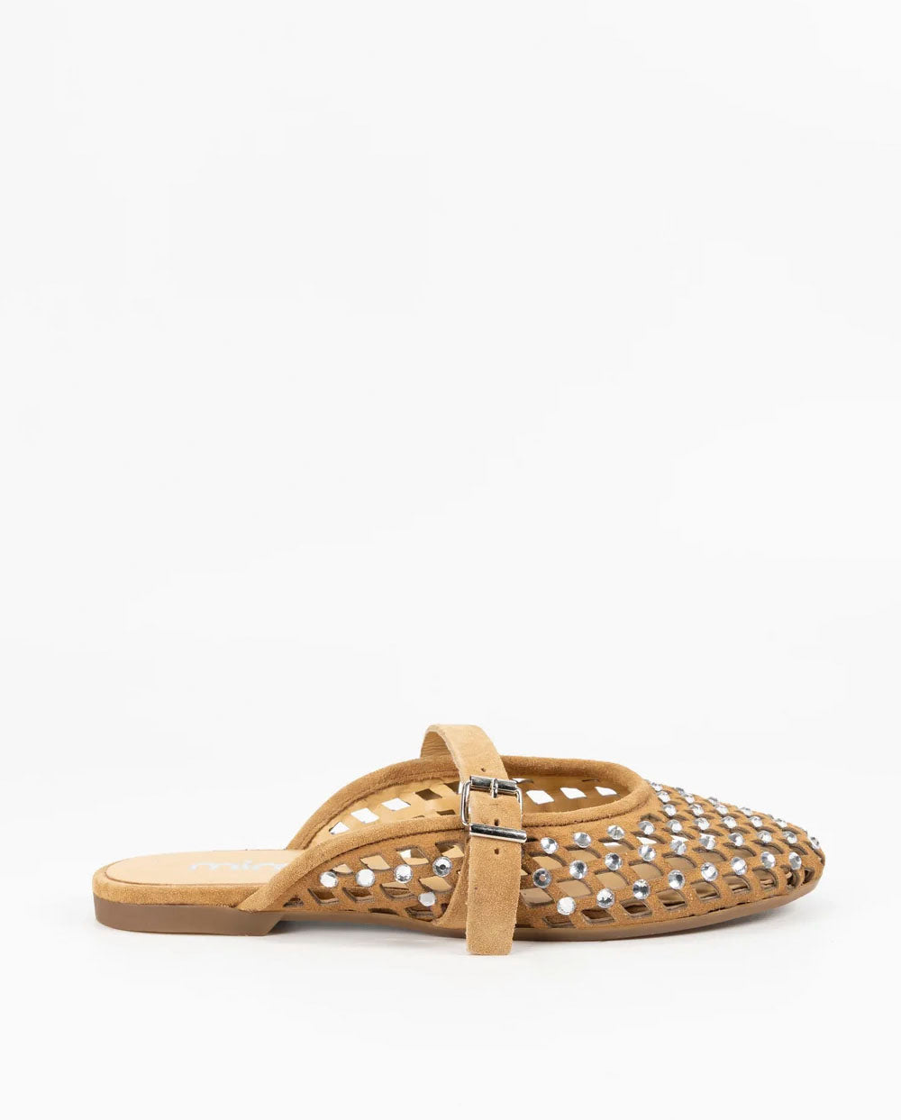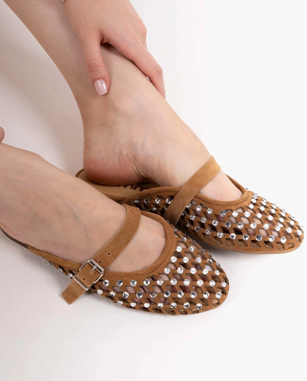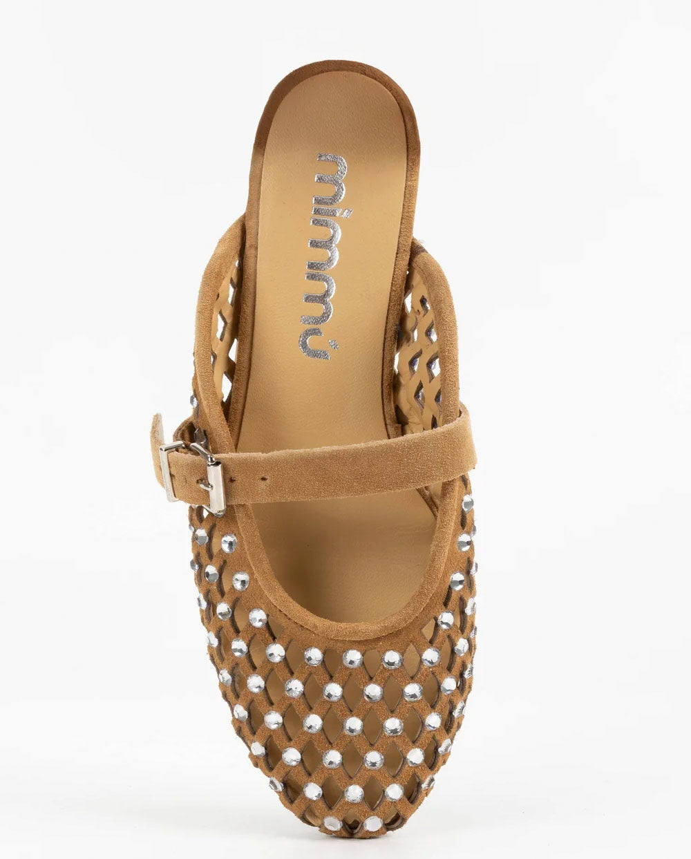 Bailarina de auténtico ante color marrón, con todo el empeine troquelado y decorado con strass. Hecho en italia por la firma Mimmú. Ajuste delantero con trabilla.