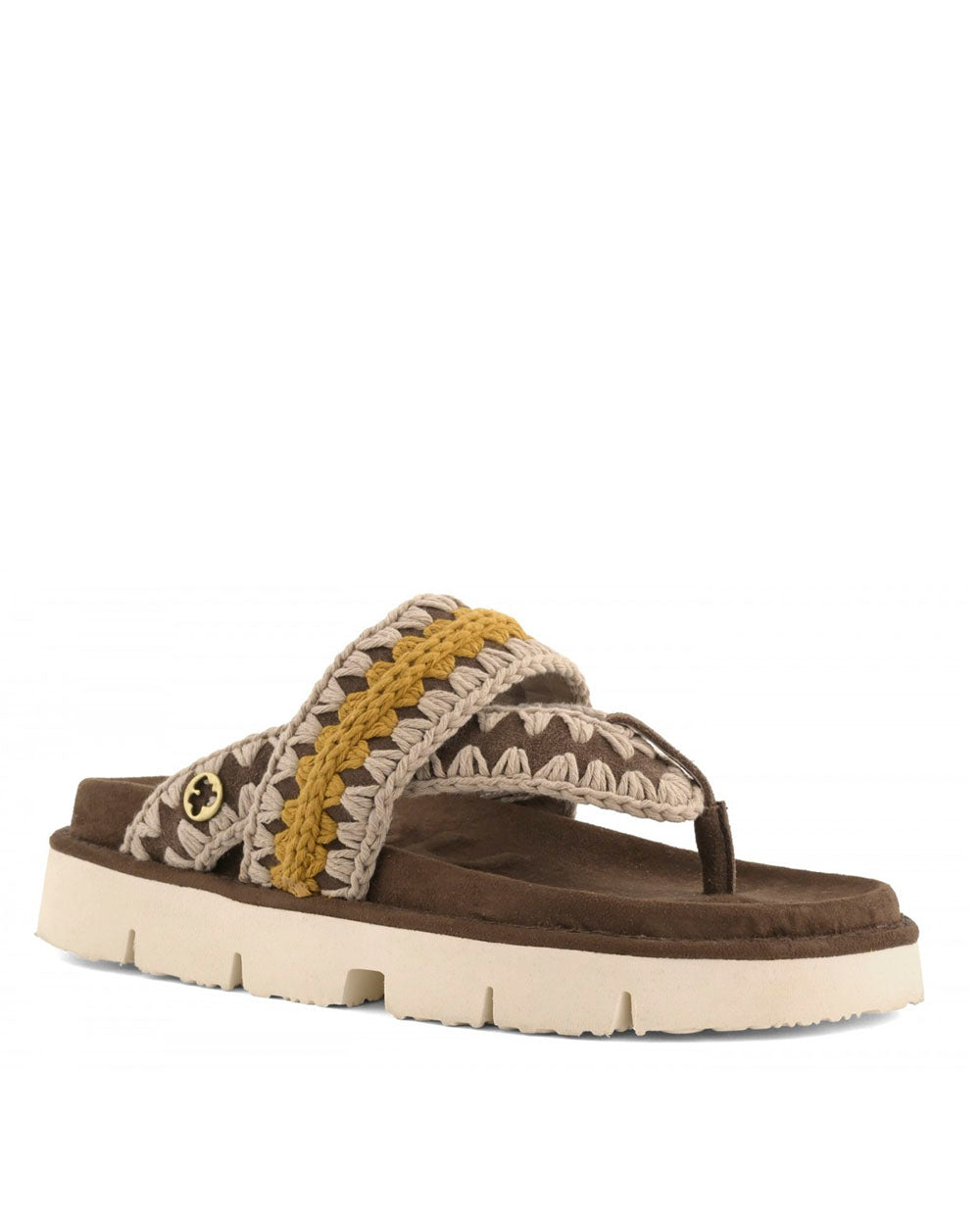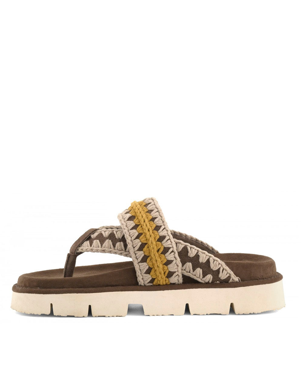La sandalia bio de dedo con cruce criss-cross. Impresionante decoración con costura de colores sobre la tira central. Con empeine de tiro bajo de ante y la característica costura de ganchillo de Mou en color.
