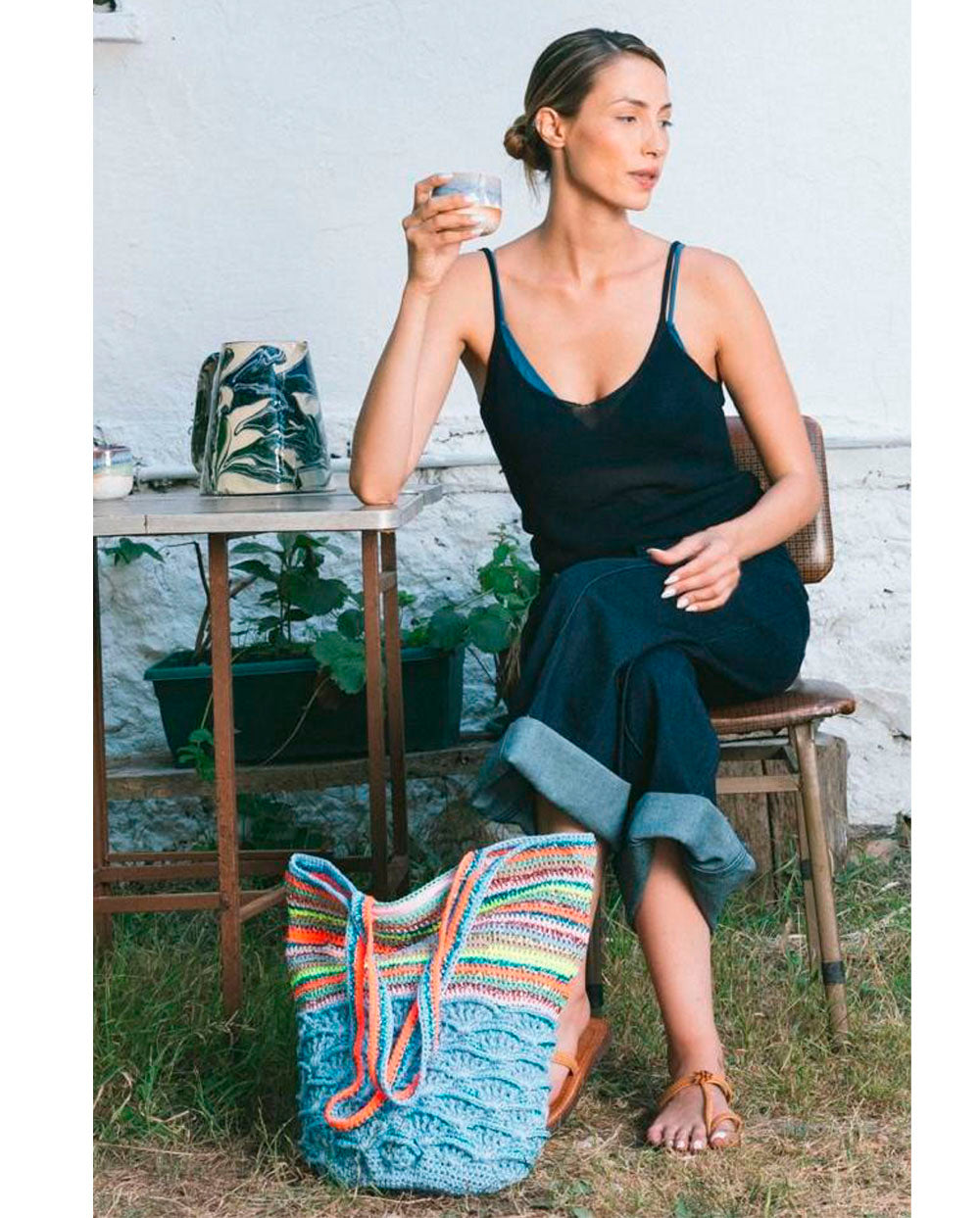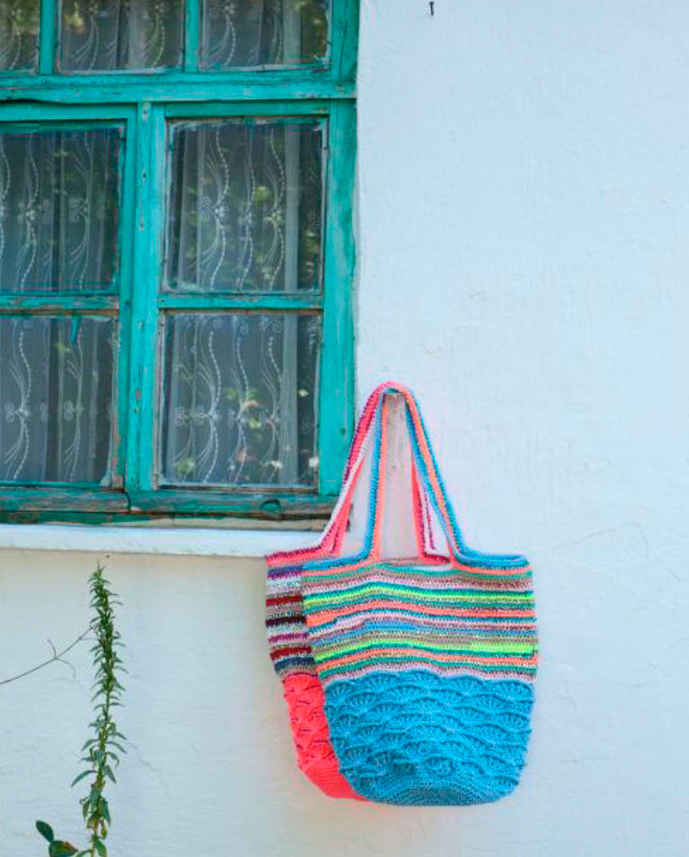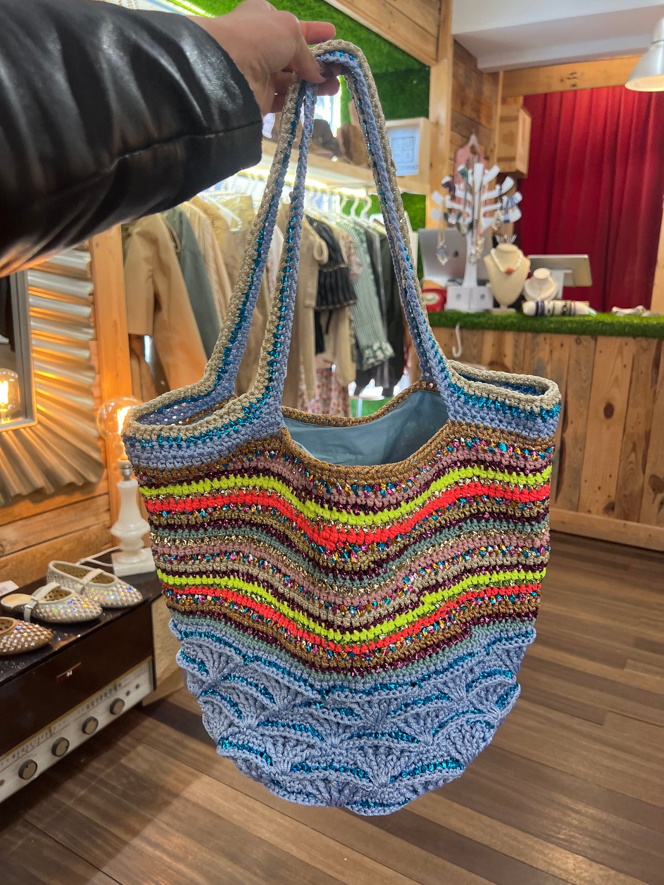 Bolso estilo shopper 100 % hecho a mano con la técnica del ganchillo en hilos multicolor.