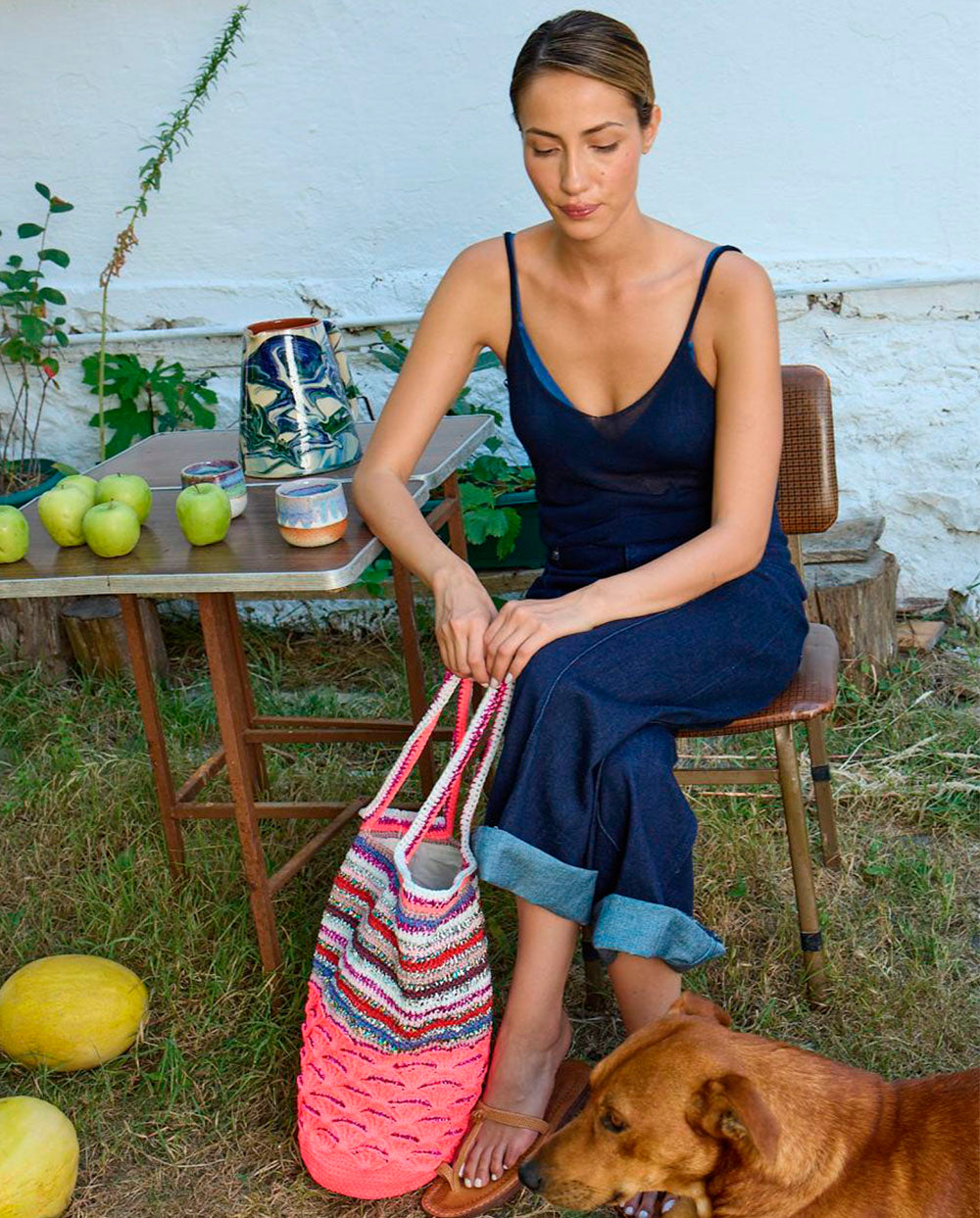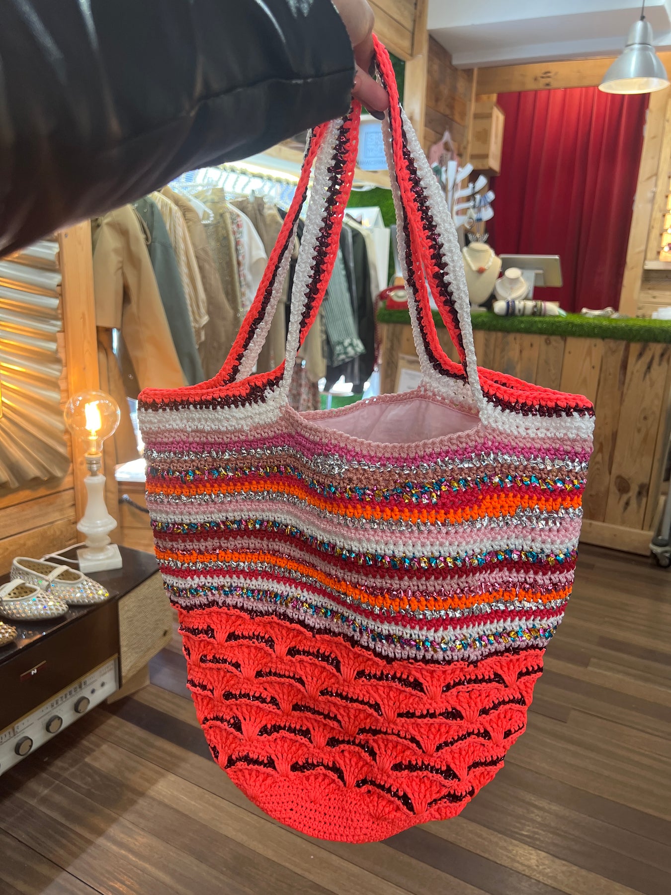Bolso estilo shopper 100 % hecho a mano con la técnica del ganchillo en hilos multicolor.