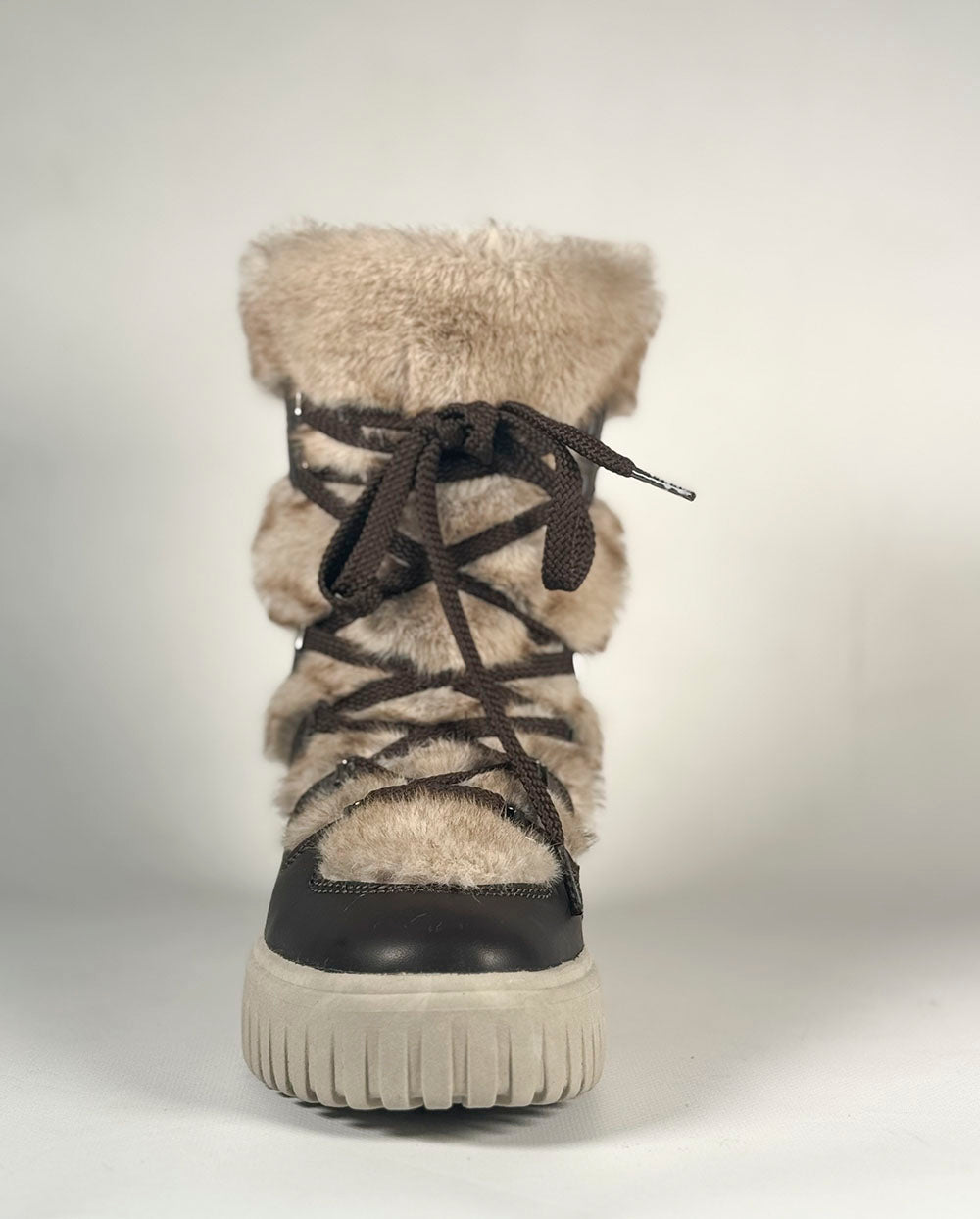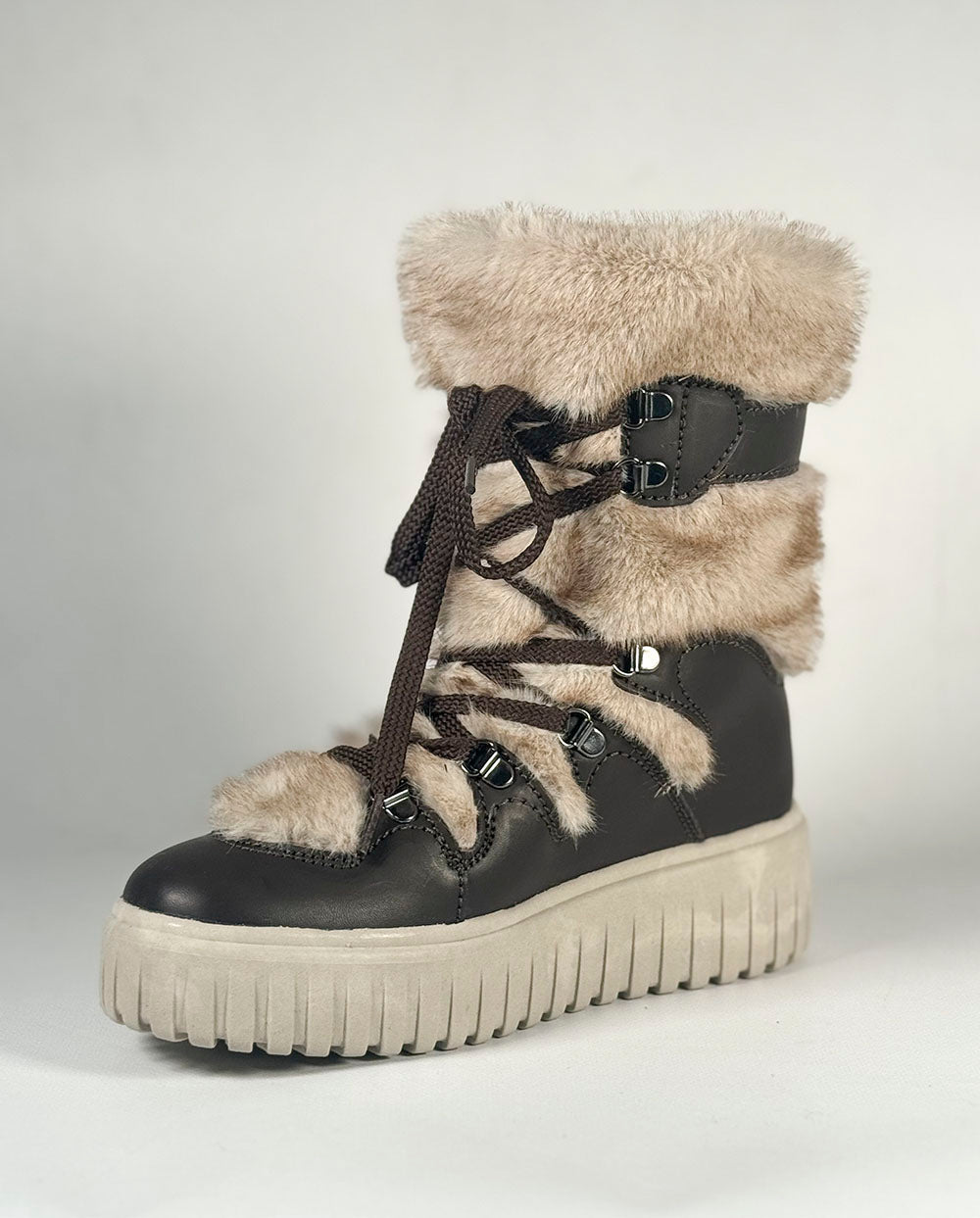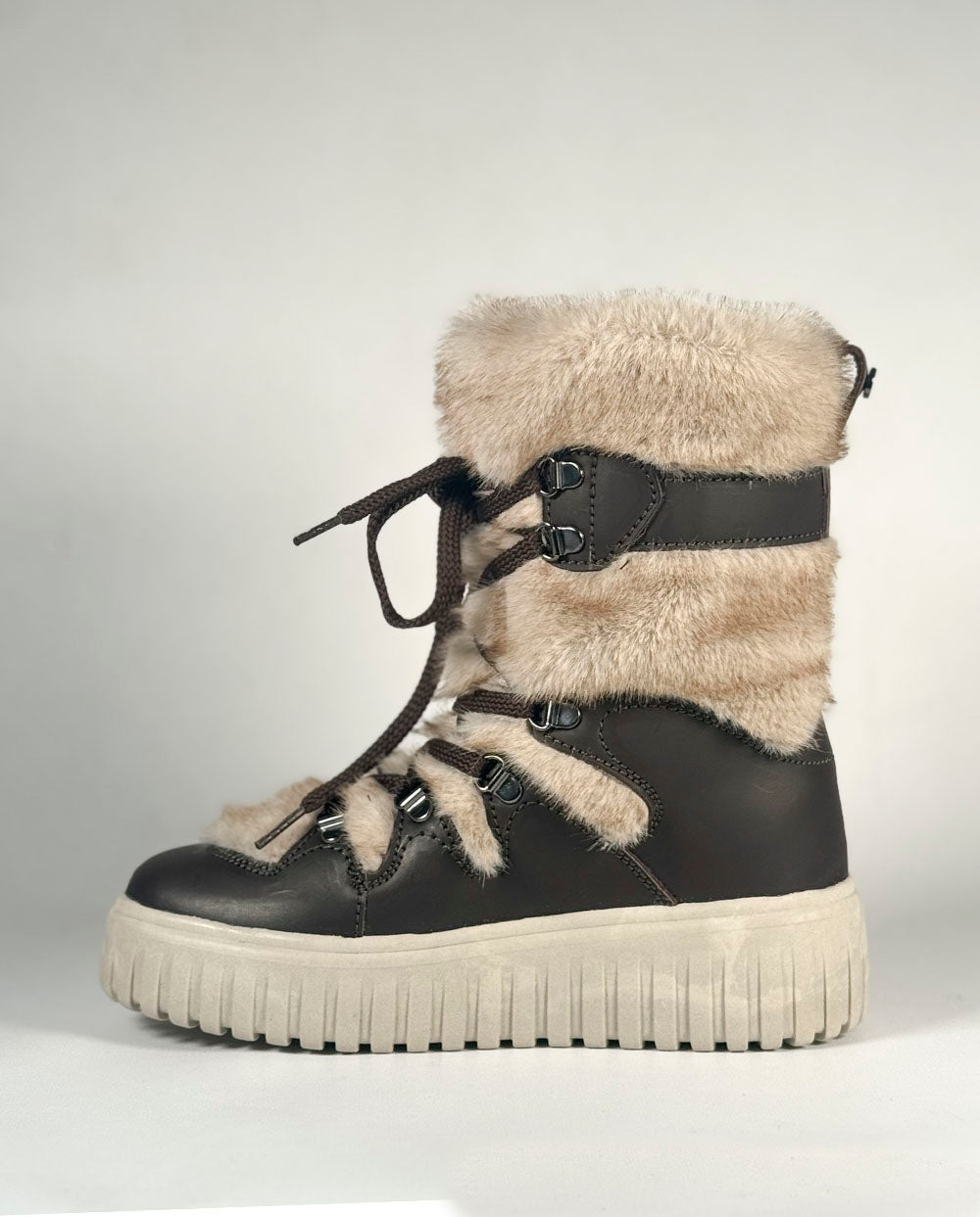 Botín de diseño y fabricación italiano, ideal para los días más fríos y húmedos. Precioso diseño, con pelo tonalidades beige, con cordones cruzados marrones al más puro estilo nórdico.
