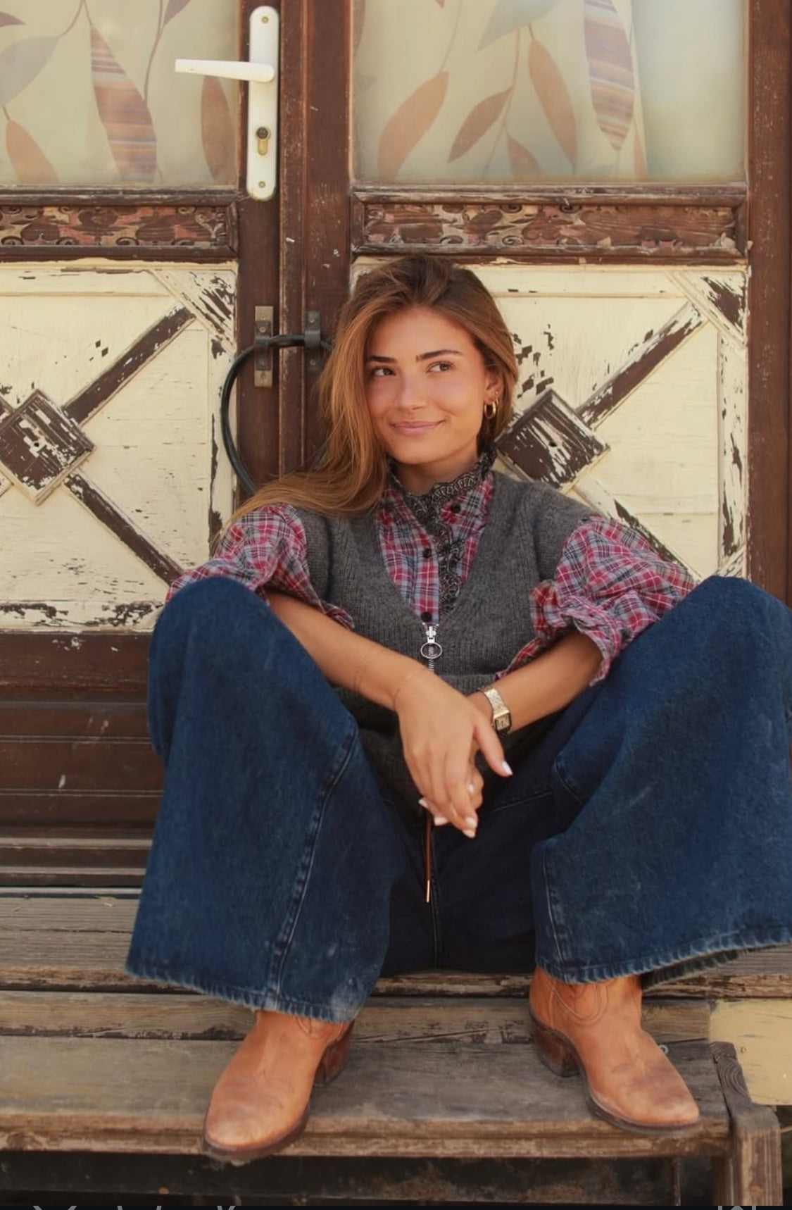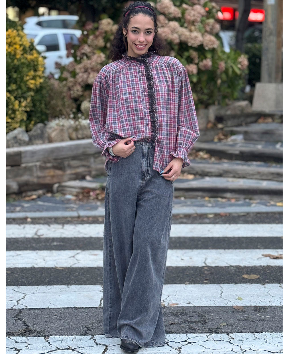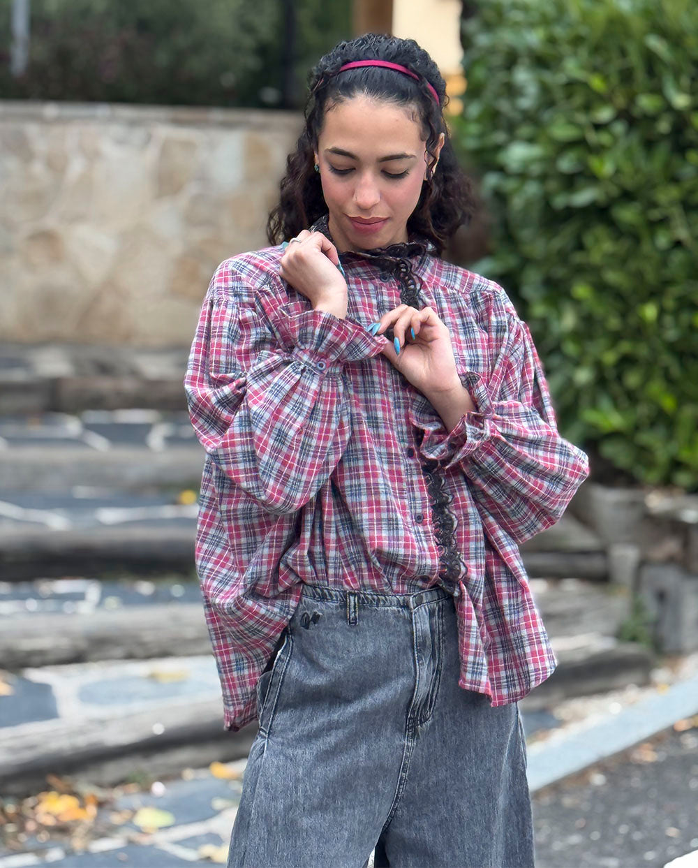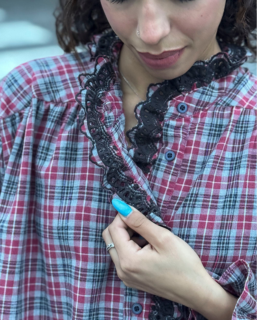 Camisa Montana de manga larga, en cuadros de tonos frambuesa, gris y negro. Cuello subido de inspiración western, con tira de encaje vertical. Puño en volante.