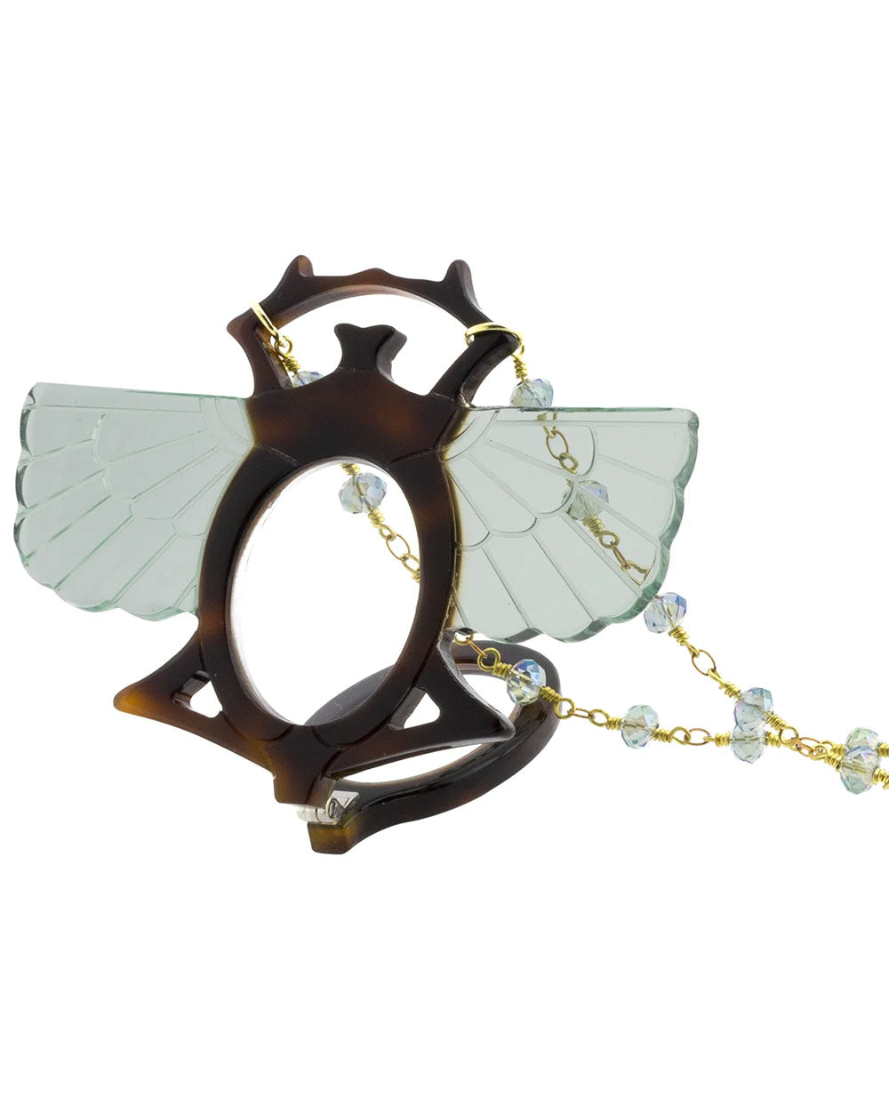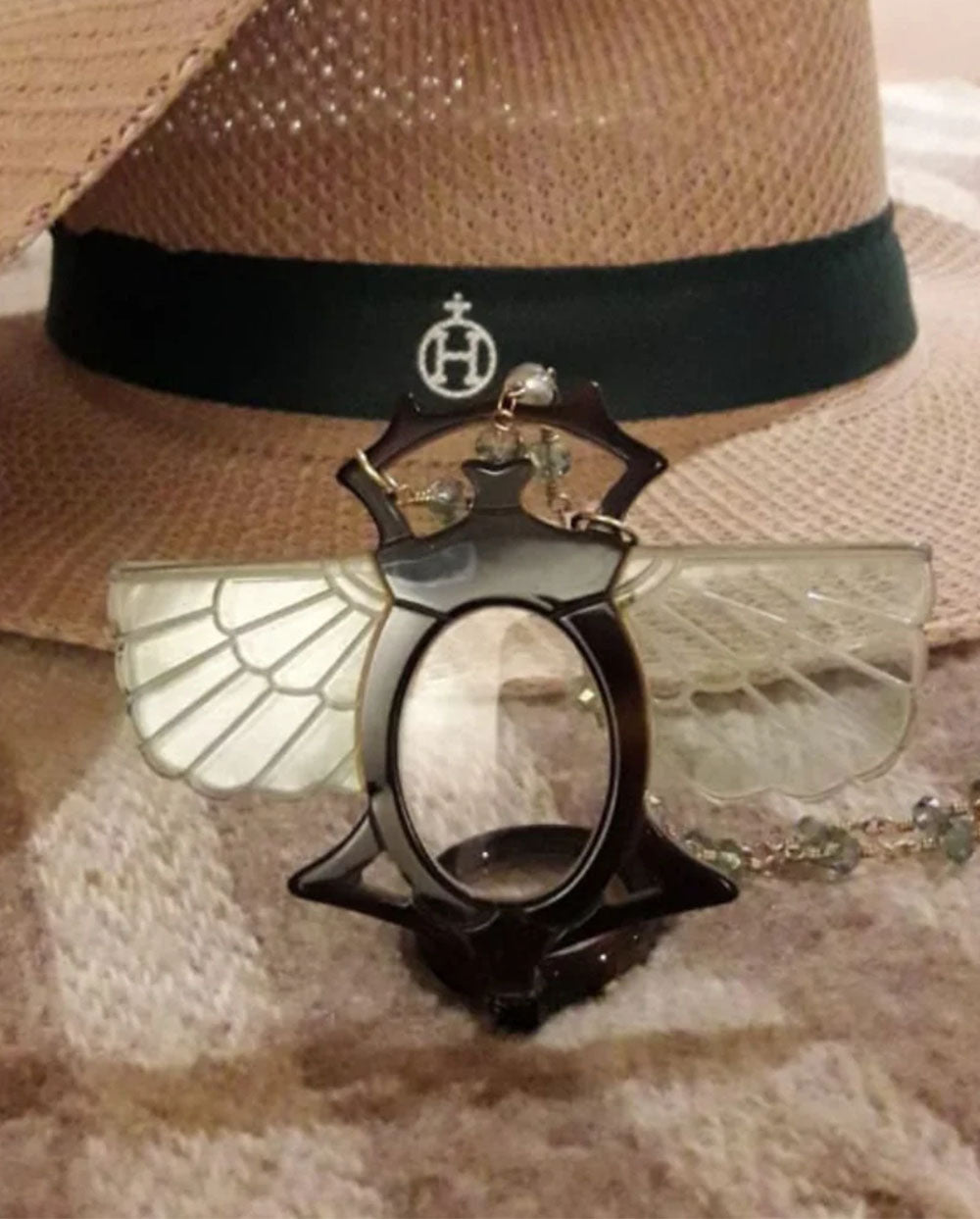 El modelo es una pieza artesanal, moldeada a mano. En el antiguo Egipto el escarabajo era símbolo de renovación y renacimiento. Un diseño delicioso con las alas delicadamente talladas en color transparente. El complemento más elegante y original.