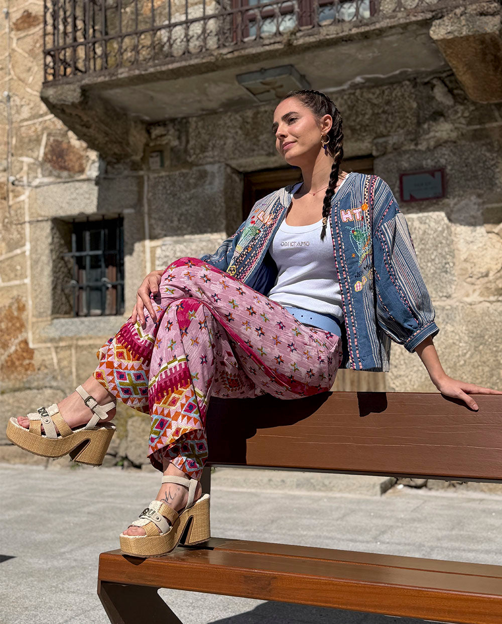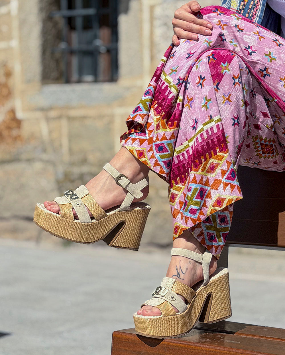 MOU sandalia plataforma rafia cinta tobillo chalk