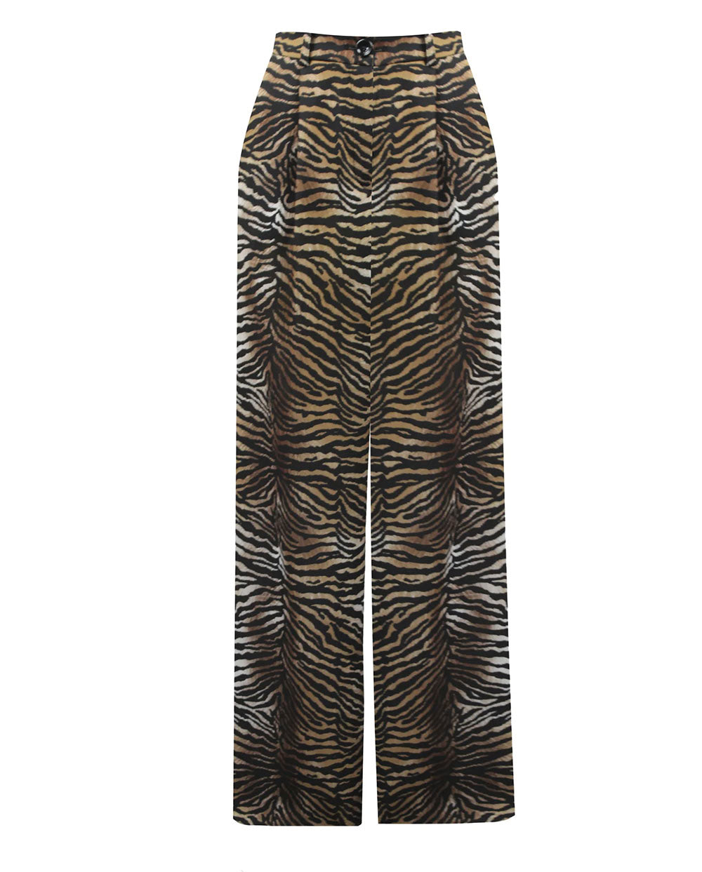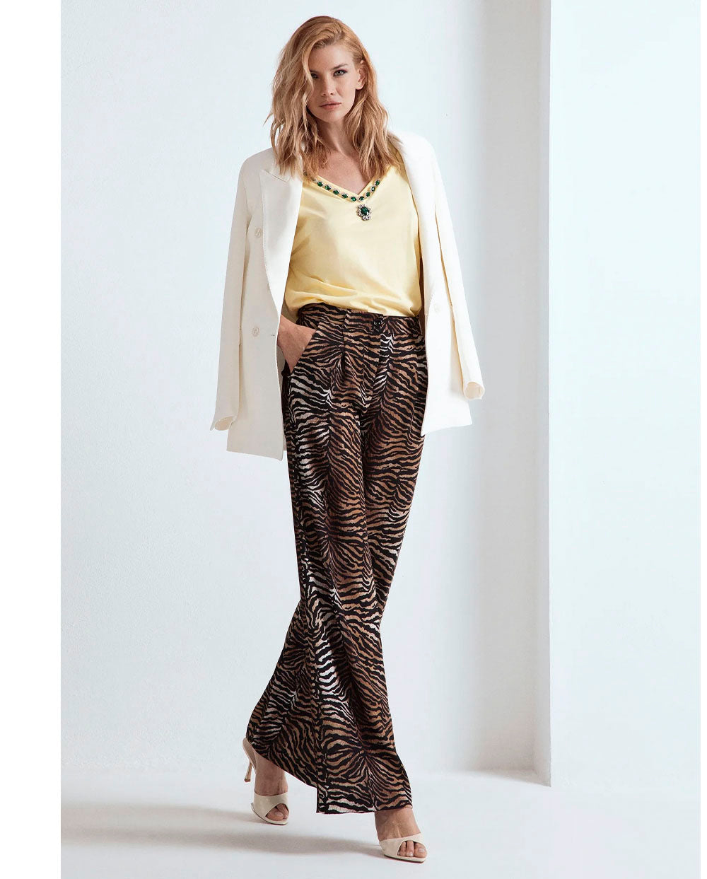 Pantalón Palazzo verde militar con cinturilla jogger de goma elástica y tira vertical en blanco decorada con tachuelas.