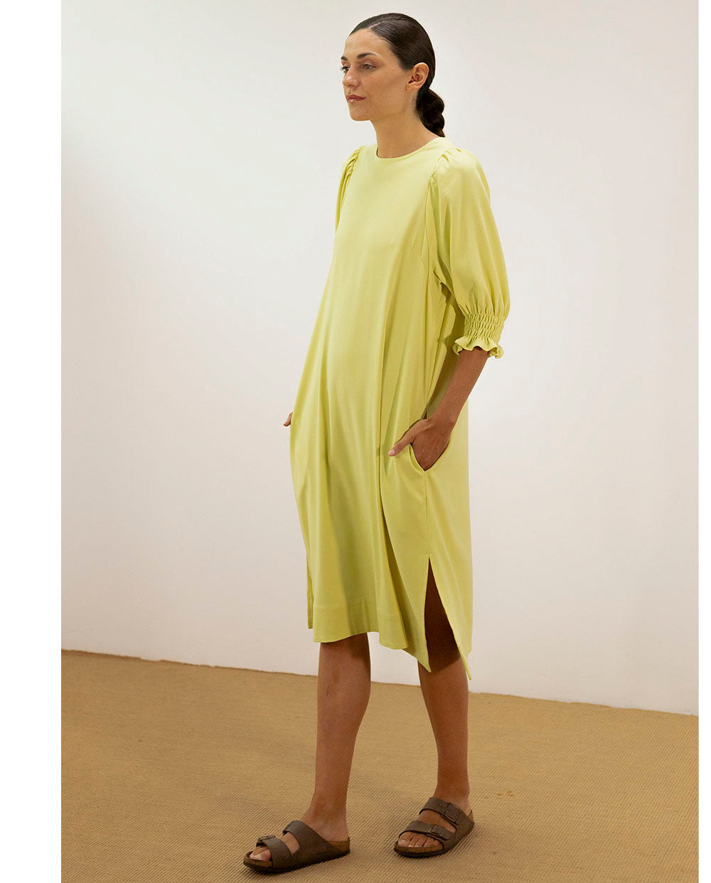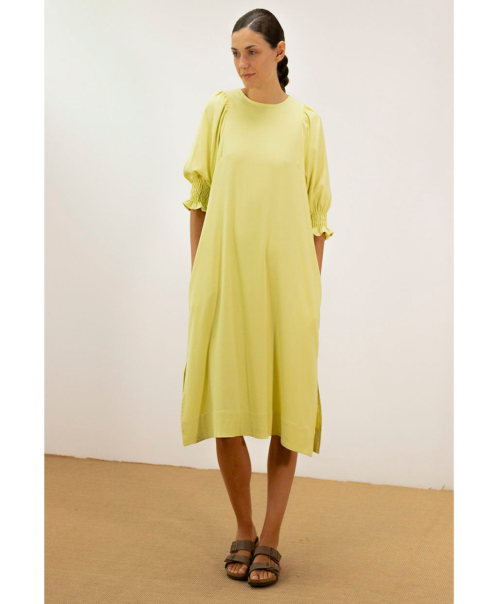 Vestido midi de manga corta farol y cuello redondo en color verde lima. Está fabricado en un tejido de modal con un tacto y acabado sedoso, con caída y muy suave.