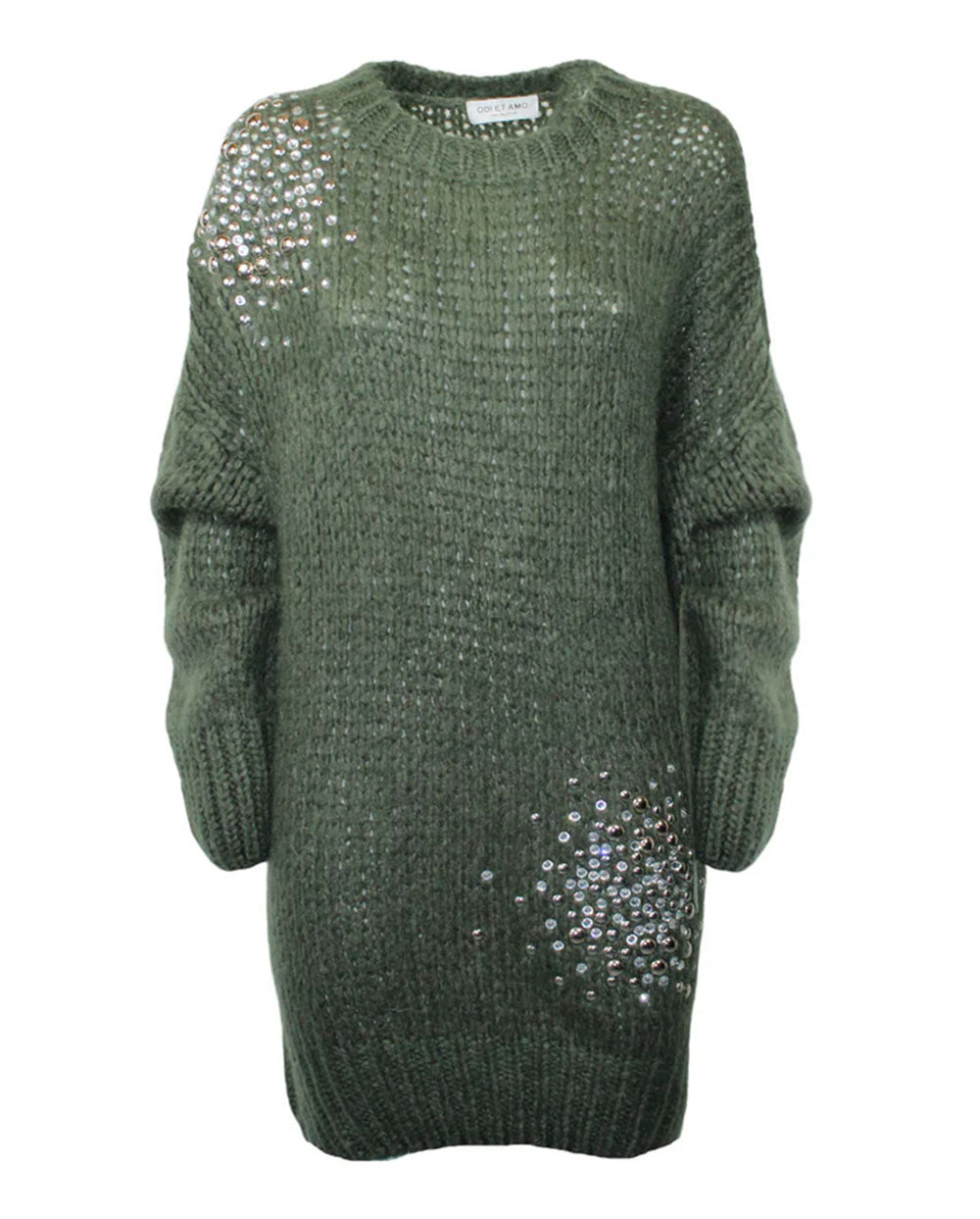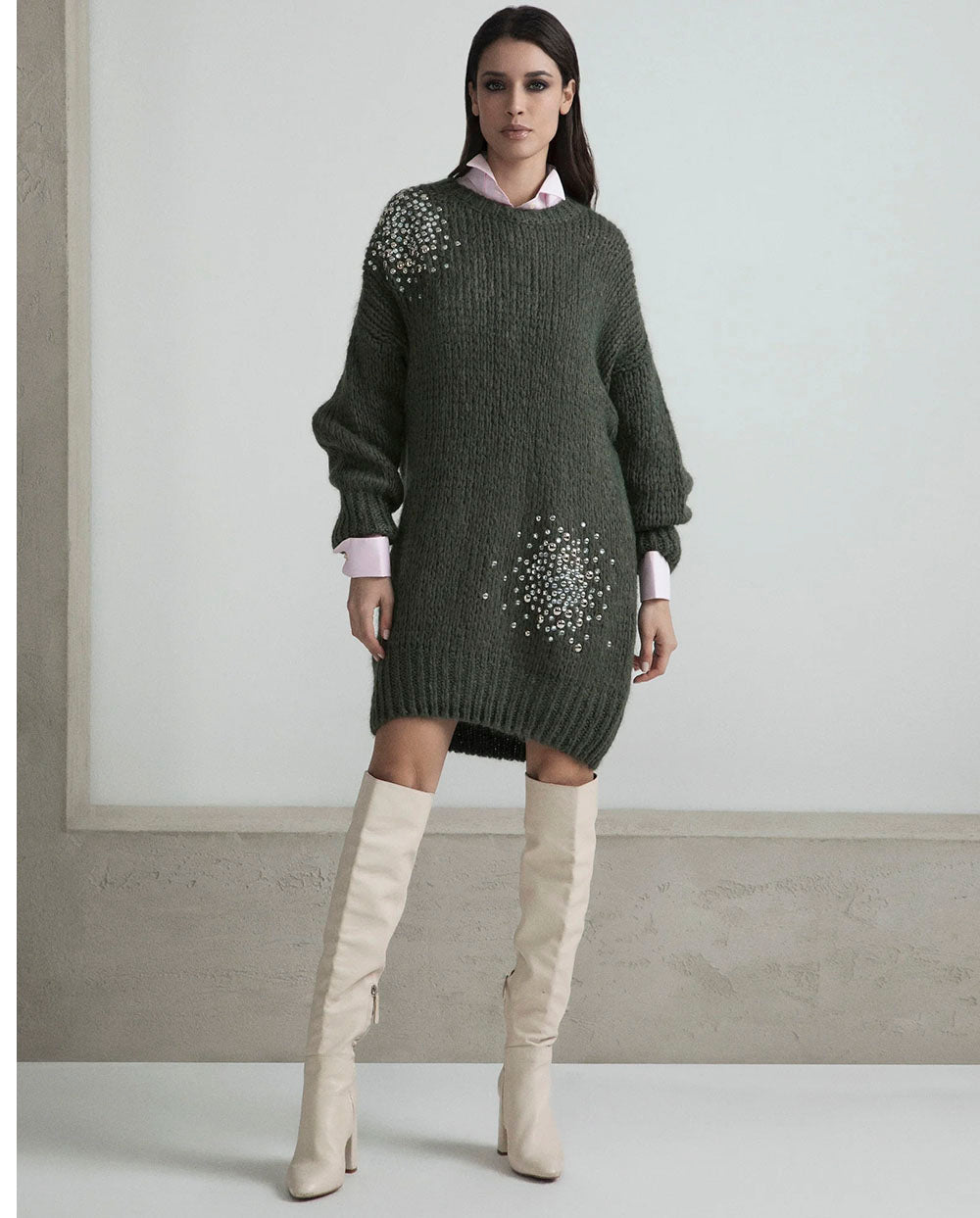 Vestido corto oversized de  punto, con aplicación Big bang de strass en color verde musgo.