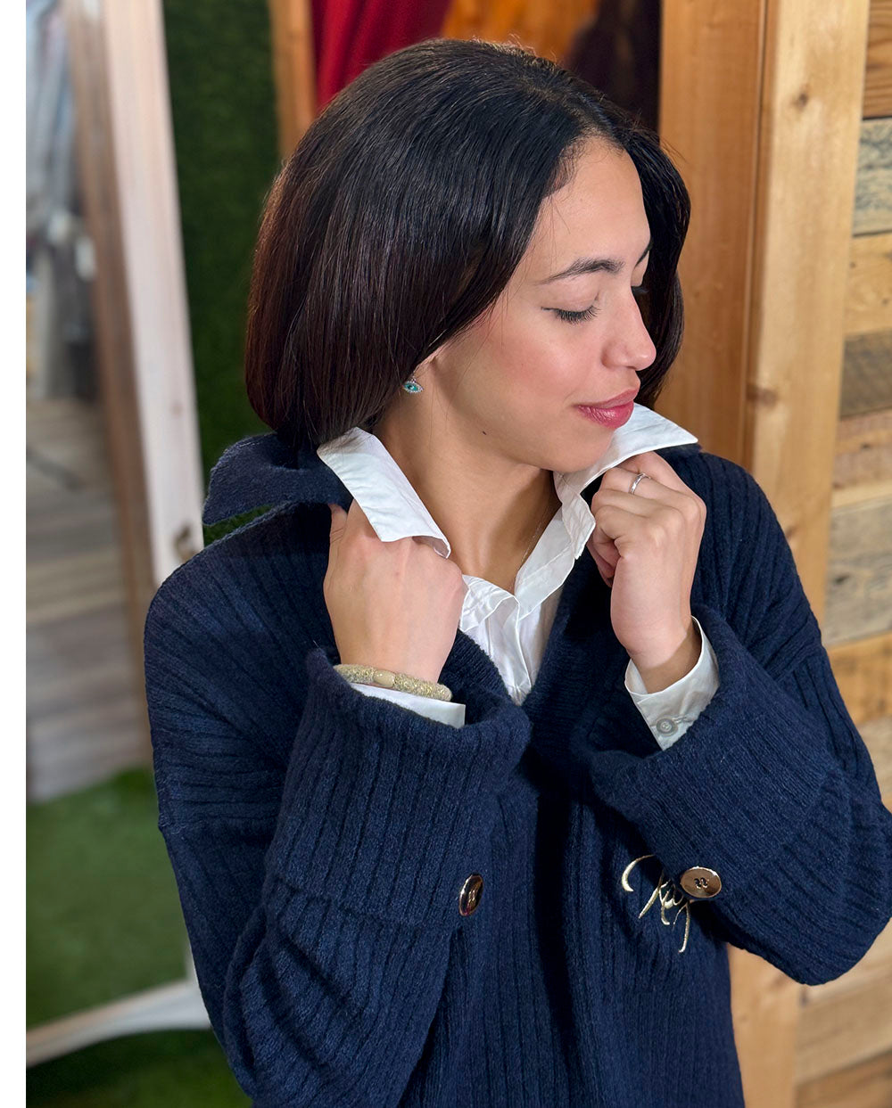 Vestido de punto azul marino en canalé ancho, con bolsillo en pecho que lleva bordadas en hilo dorado las siglas de la marca. Cuello polo y puño en dobladillo decorado con botón dorado. Puedes superponerlo a tus camisas preferidas o cuellos cisne.