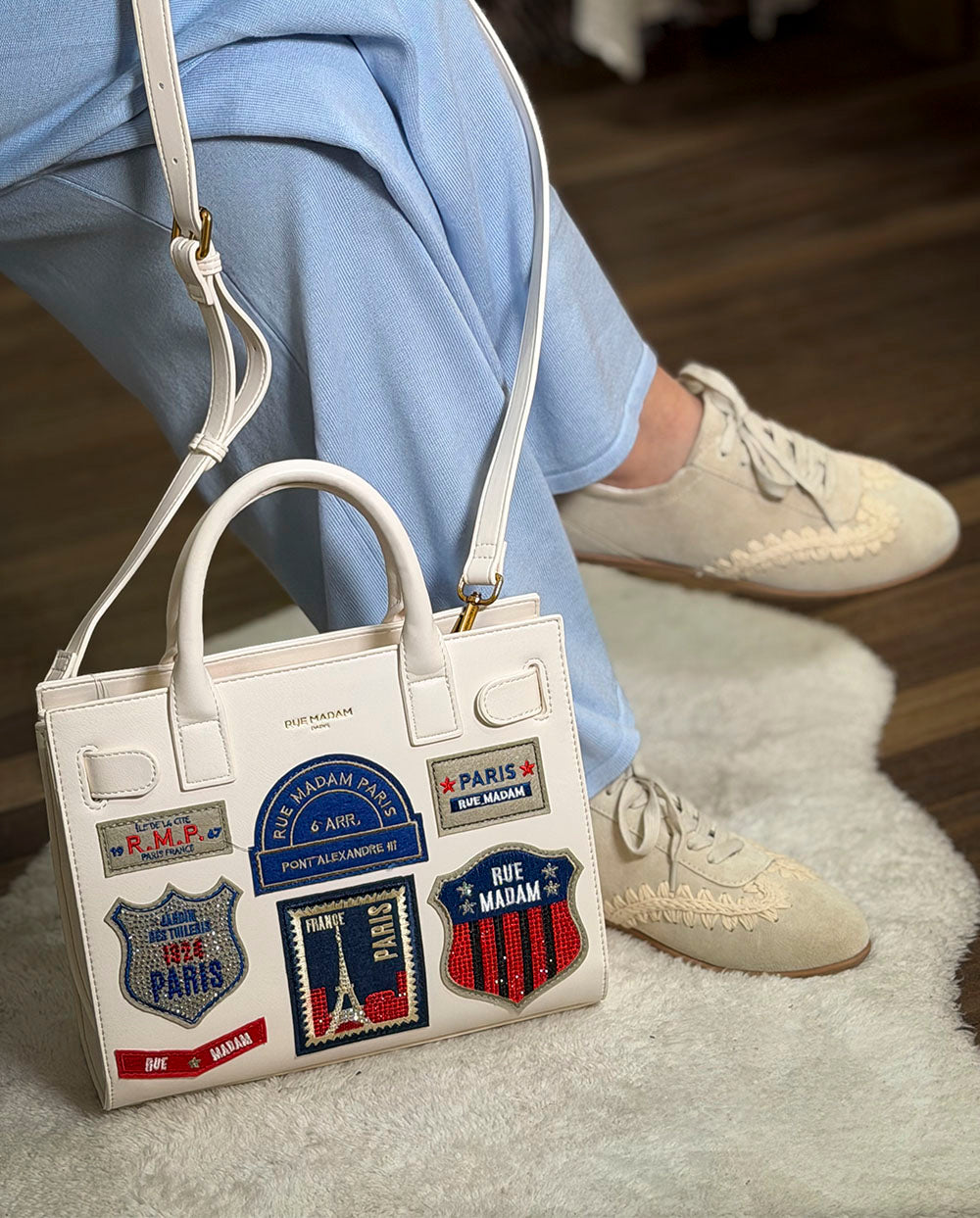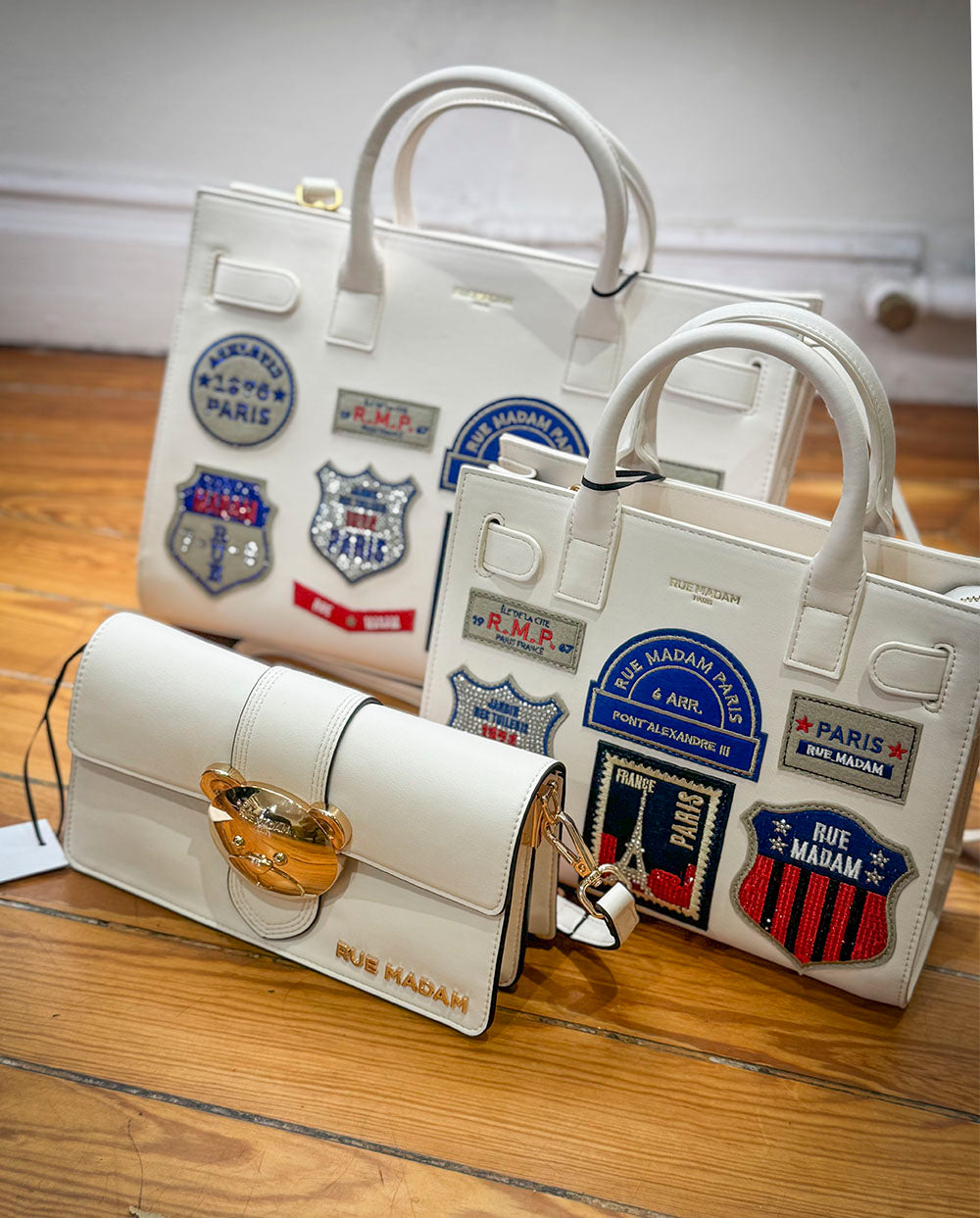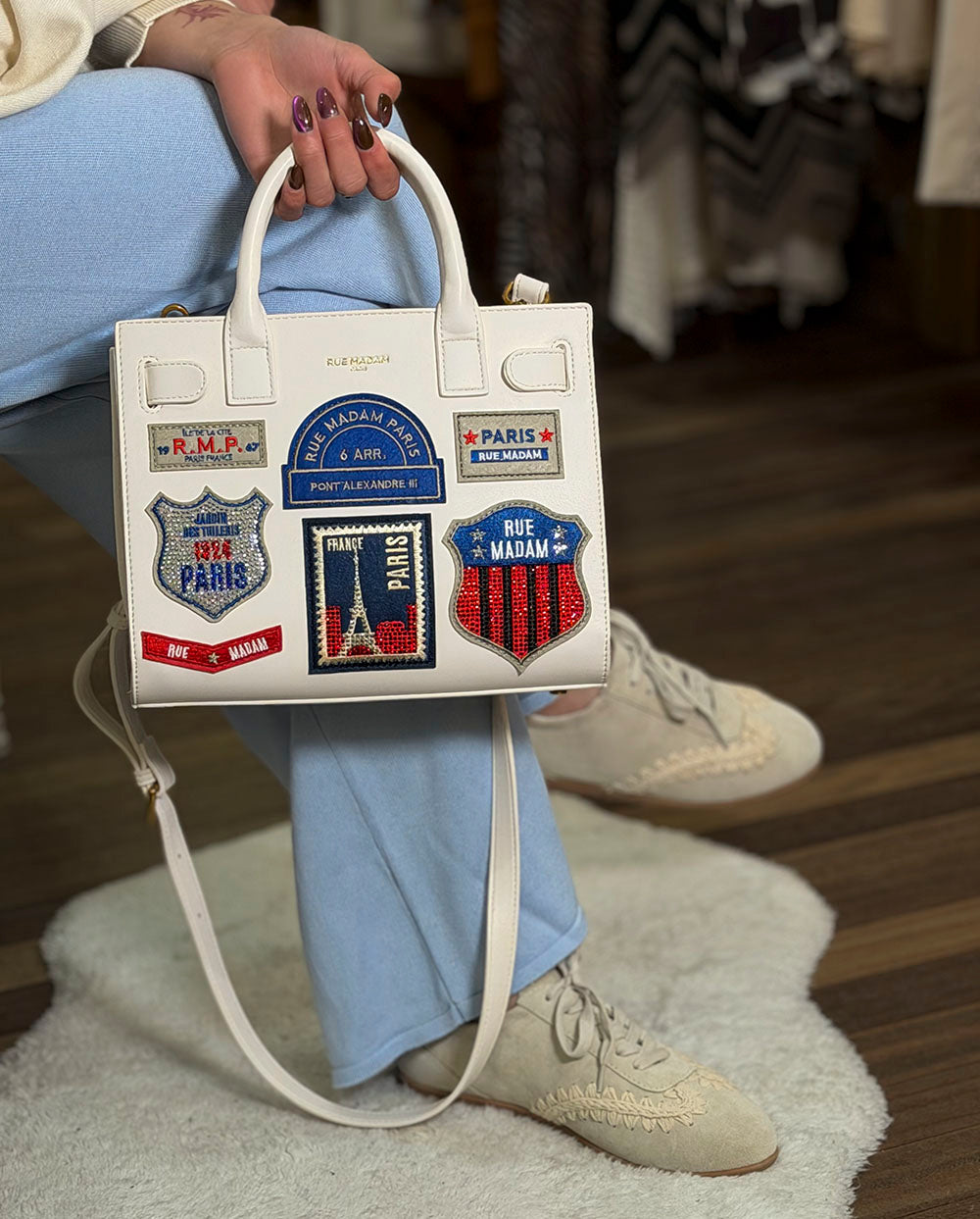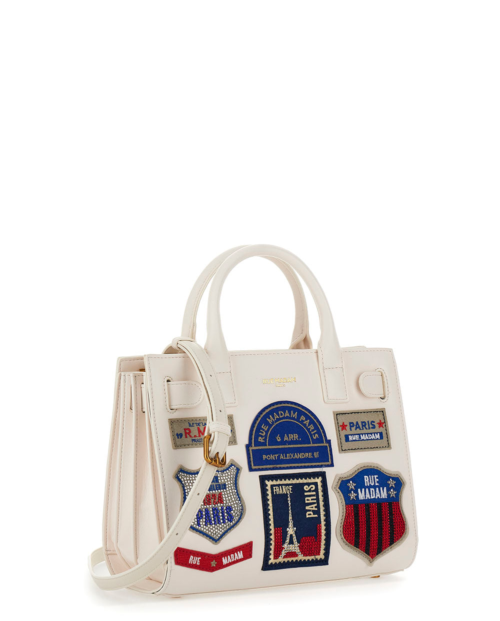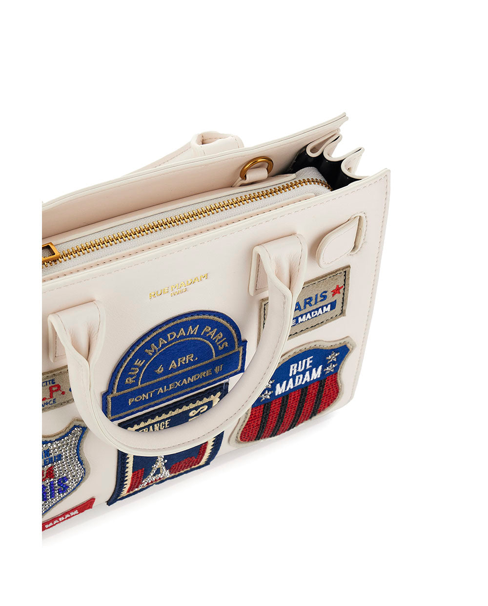 Mini bolso tote de suave eco piel color blanco adornado con aplicaciones de parches de viajes por el mundo con bordados personalizados y pedrería. Diseñado con refuerzos laterales para mayor estructura, cierre de cremallera y correa de hombro extraíble. Incorpora logotipo de Rue Madam Paris grabado en dorado.