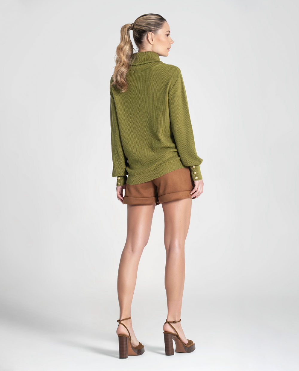 Jersey de cuello vuelto color verde oliva con siglas RG en relieve, fabricado en Portugal en punto frío por la firma Rüga.