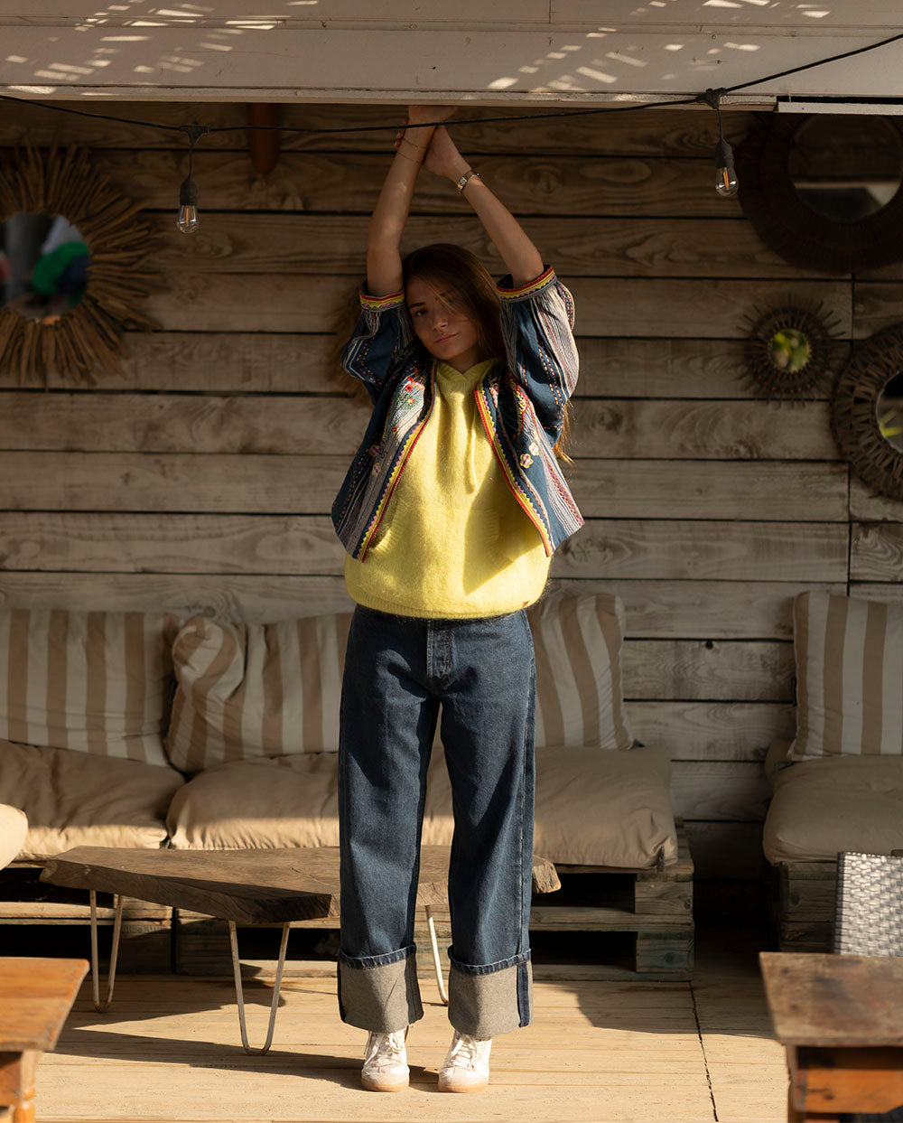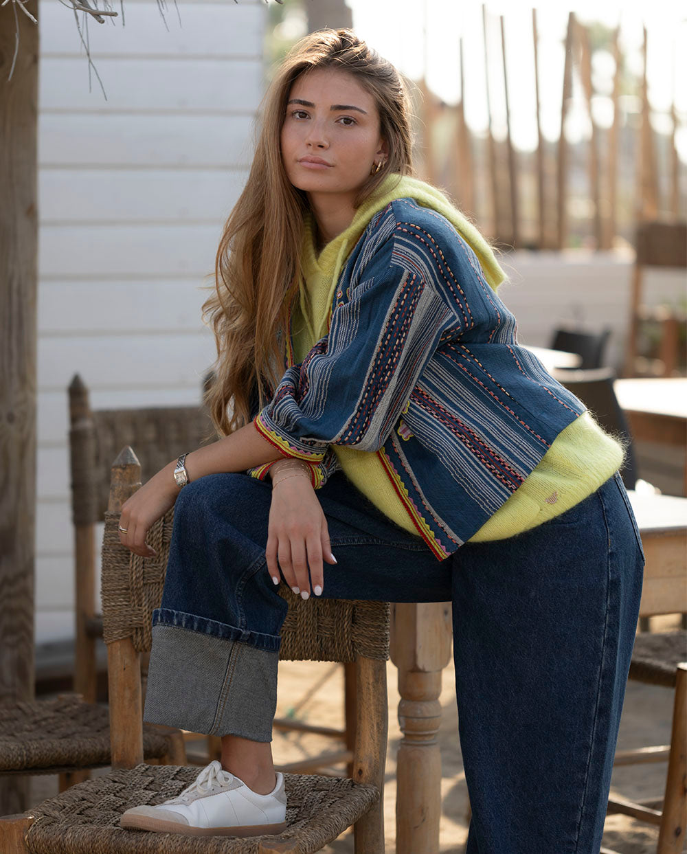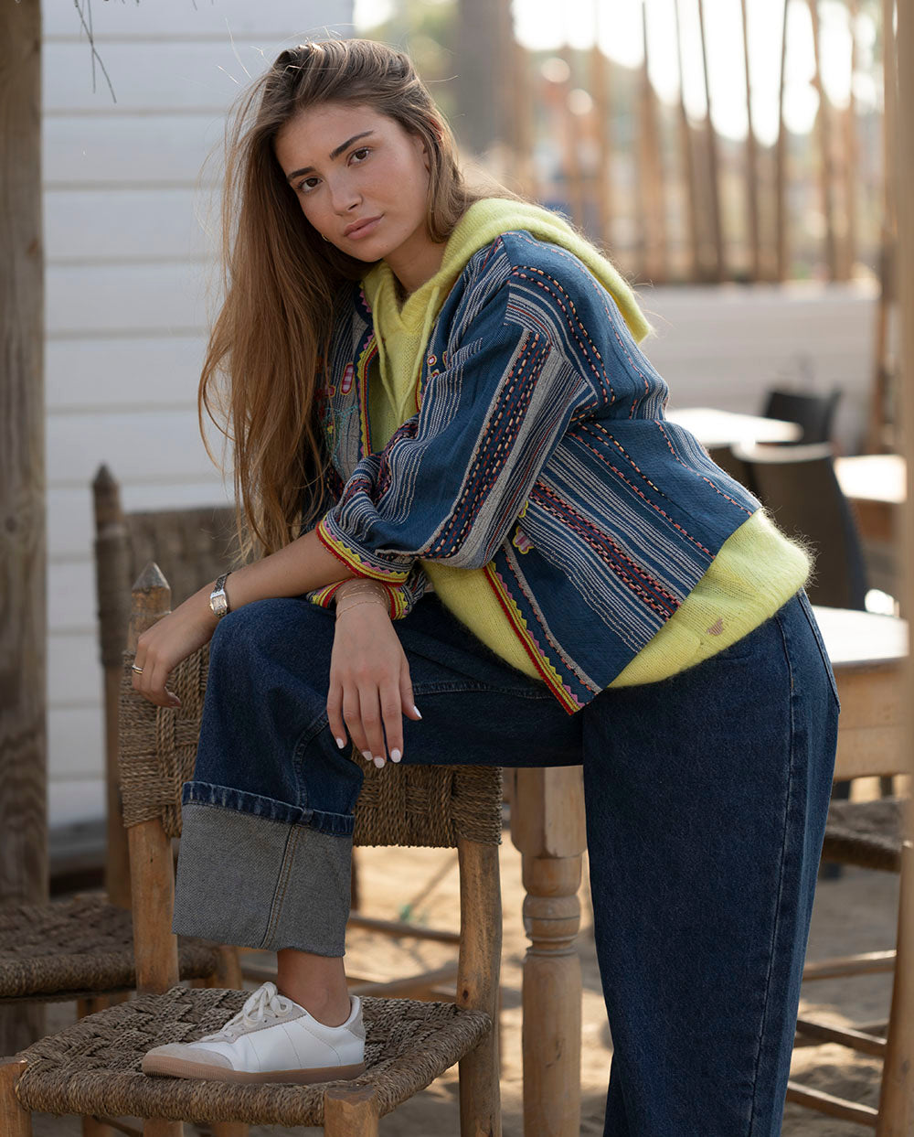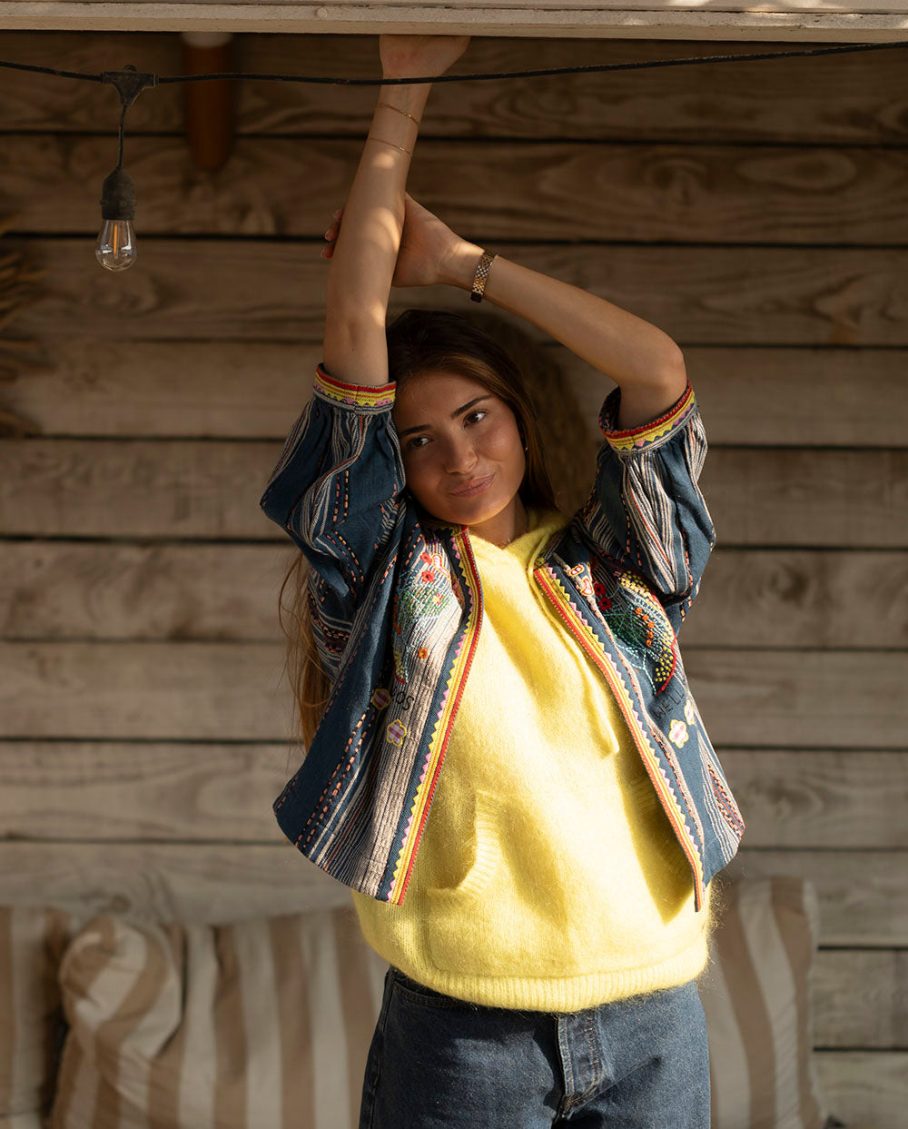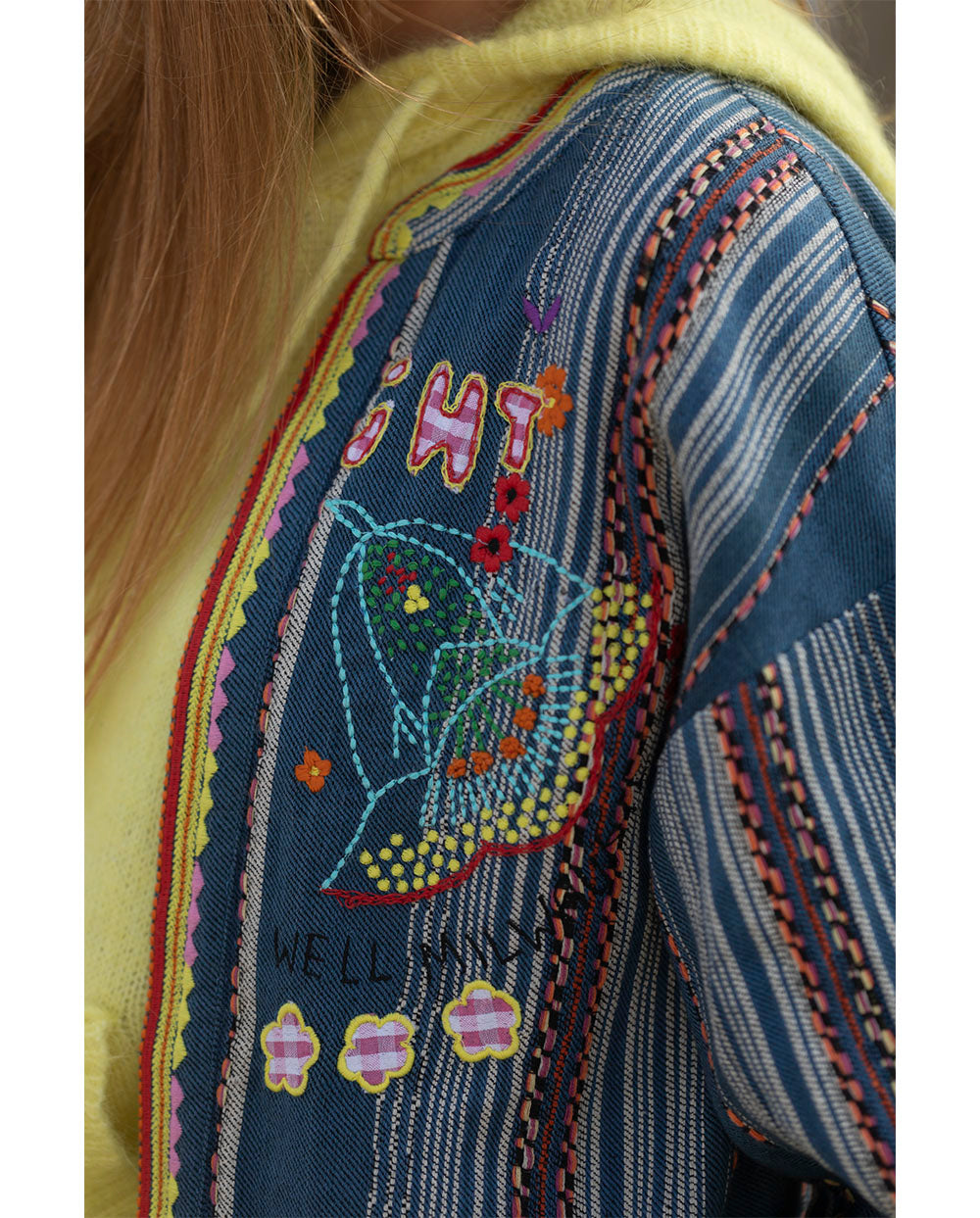 Chaqueta corta en tejido denim con rayas, ribeteada en amarillo y rojo con bordados a juego. Manga por debajo del codo.