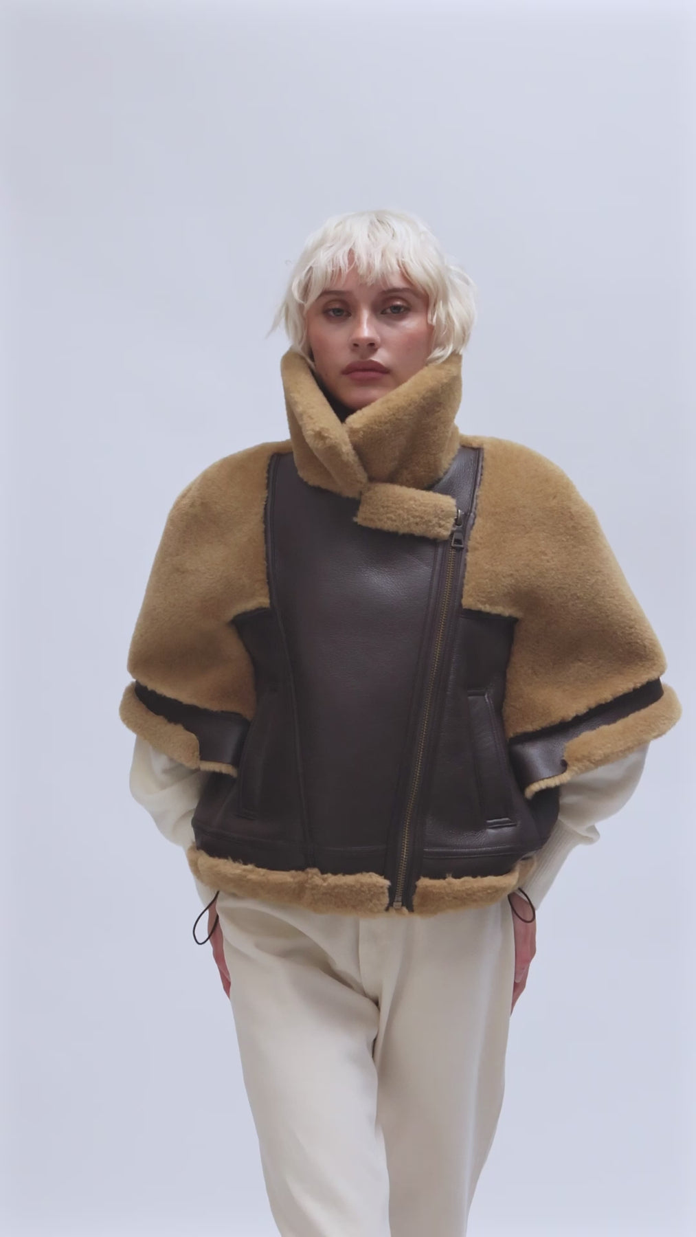 ¡El caprichín de la temproada!! Chaqueta de manga corta combinada en eco piel marrón con pelo marrón cookie, de la firma británica Vegan Code. Con cierre cremallera tipo biker y dos bolsillos.