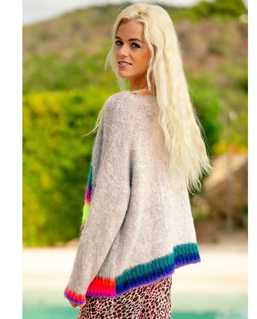 Suéter color arena con el símbolo de la Paz en los colores del Arcoiris, fabricado en mezcla de 70 % lana y 30 % alpaca.
