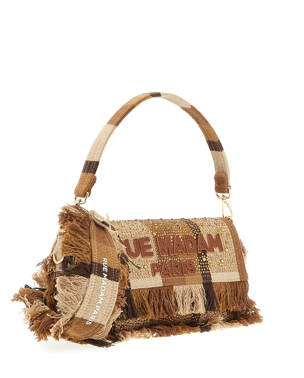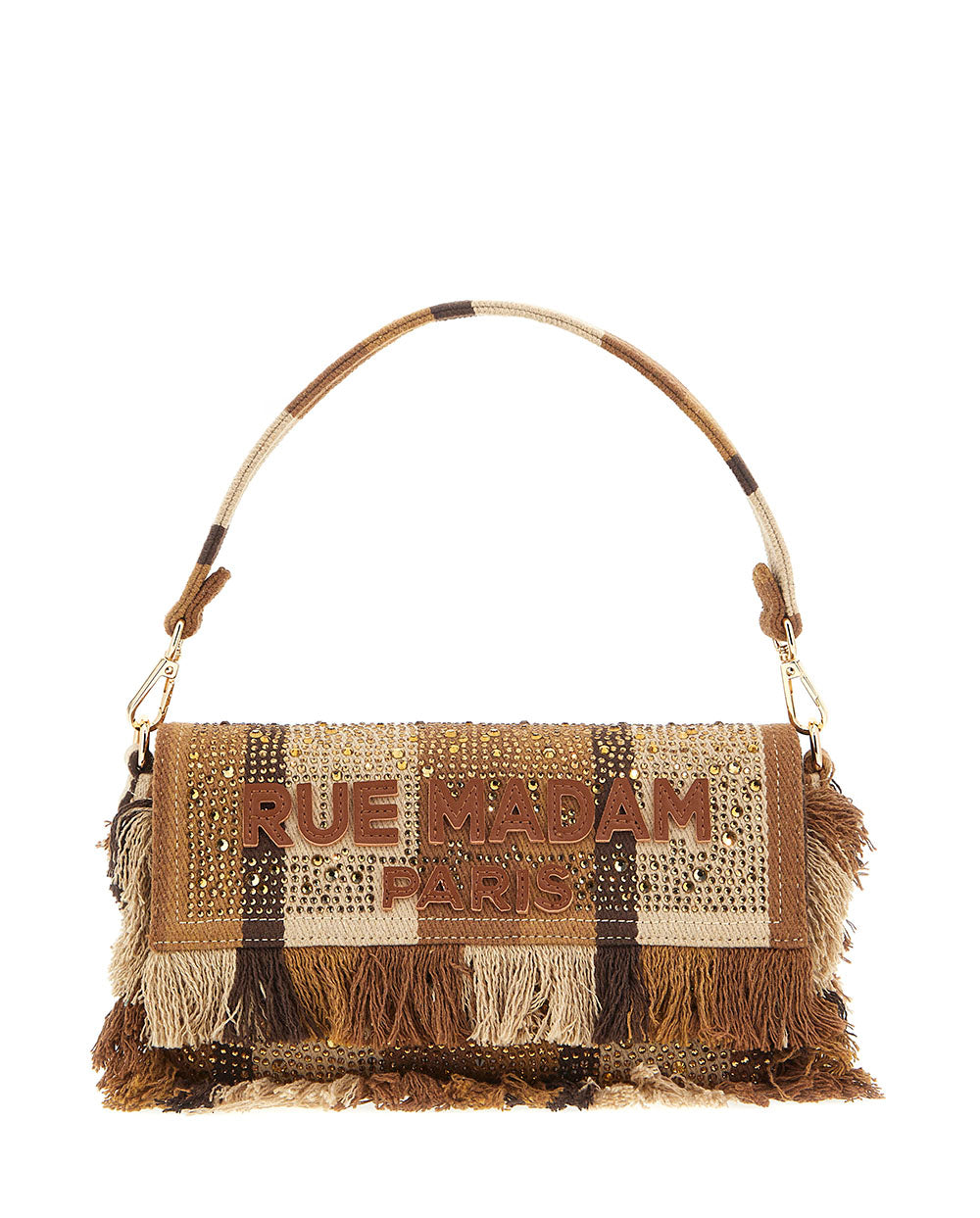 Bolso de hombro Casablanca de lona, en estampado a rayas marrón, de la Nueva colección de Rue Madam Paris para la temporada Primavera Verano 2026.