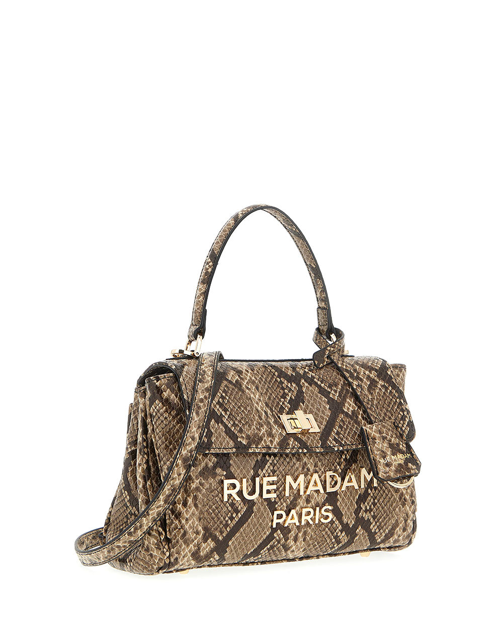 Bolso bandolera en eco piel con un exótico estampado serpiente, versión mini. Logo de metal efecto envejecido y cierre de bloqueo giratorio. Trae llavero y un asa bandolera extraible.