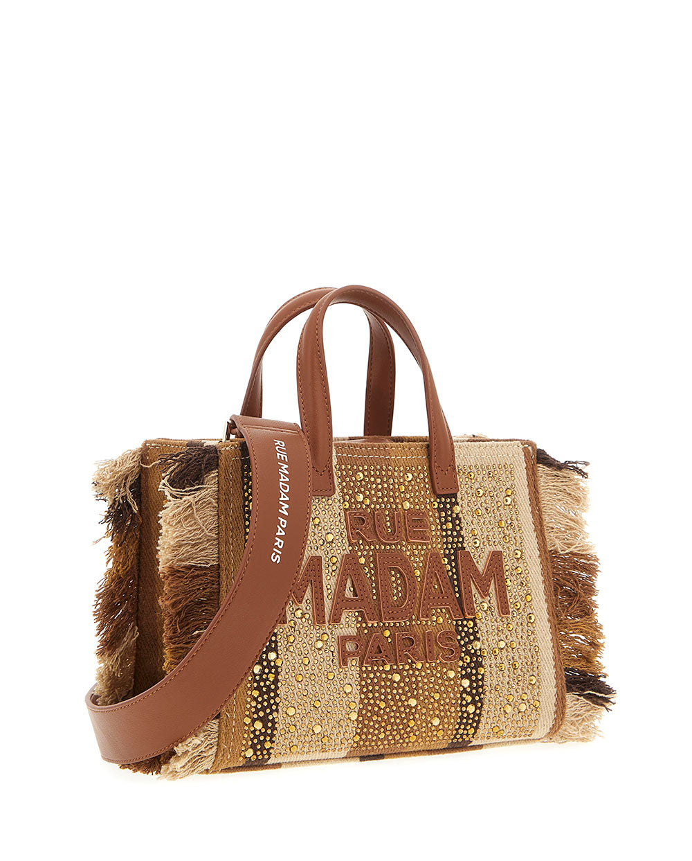Este modelo está fabricado en lona a rayas, que va adornado con flecos y apliques de pedrería. elegantes asas y logotipo de eco piel. La correa de hombro ajustable y extraíble permite llevarlo cruzado. El interior está rematado con un forro de algodón y un bolsillo, ideal para organizar tus objetos personales.