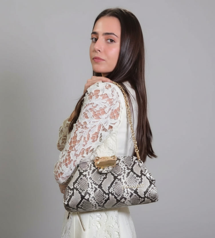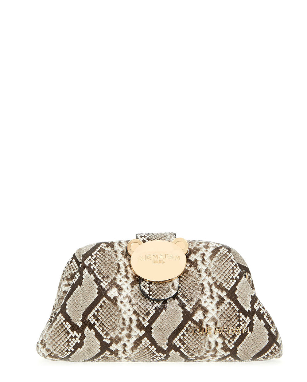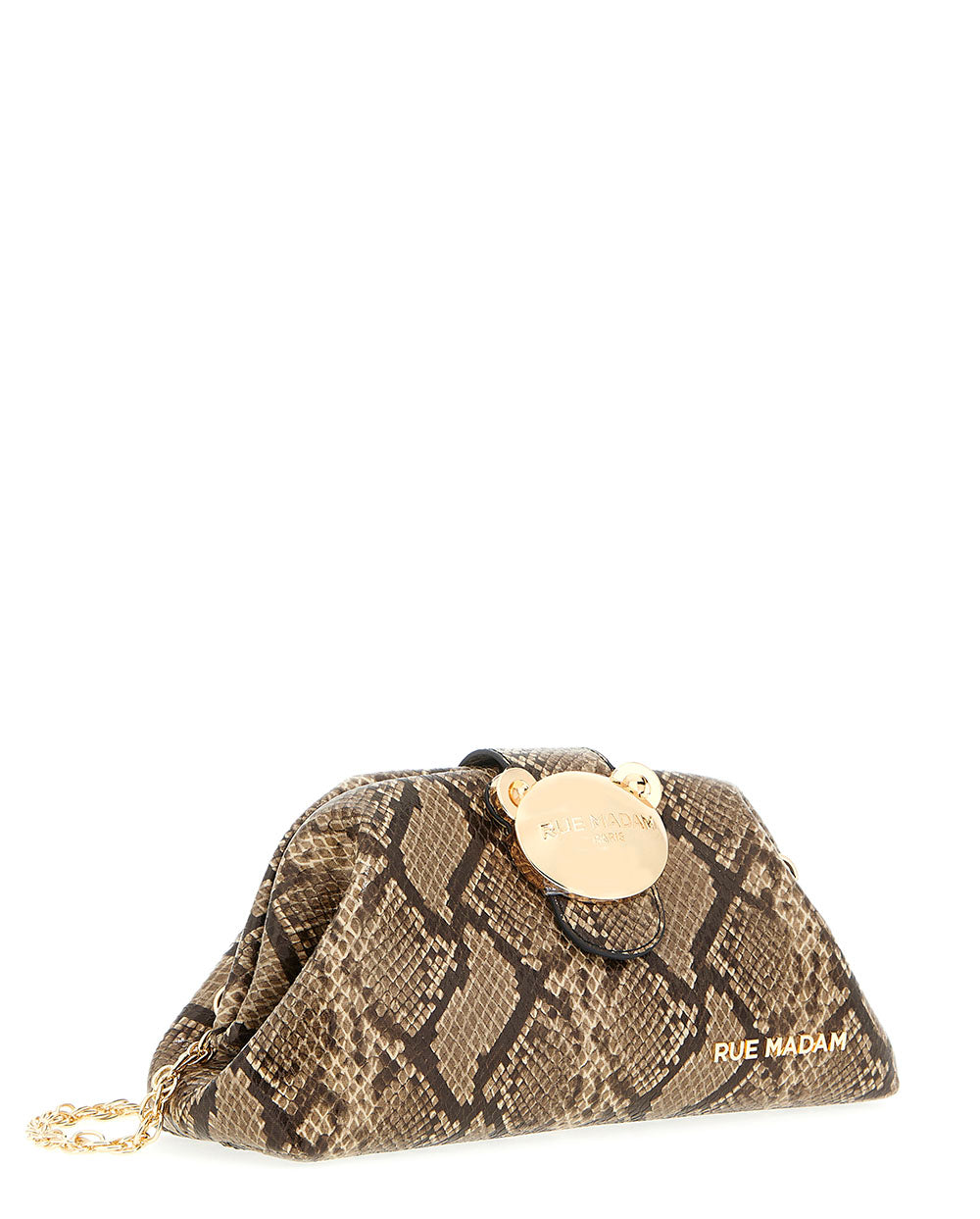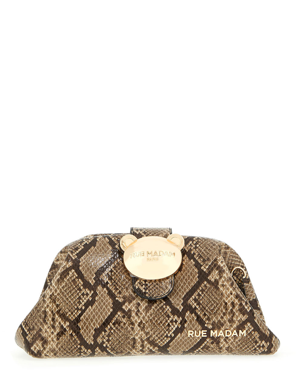 Bolso de mano con cadena para hombro extraíble, de suave ecopiel en un exótico estampado de serpiente. Cierre de imán con osito metálico, ya icónico de la firma Rue Madam Paris.