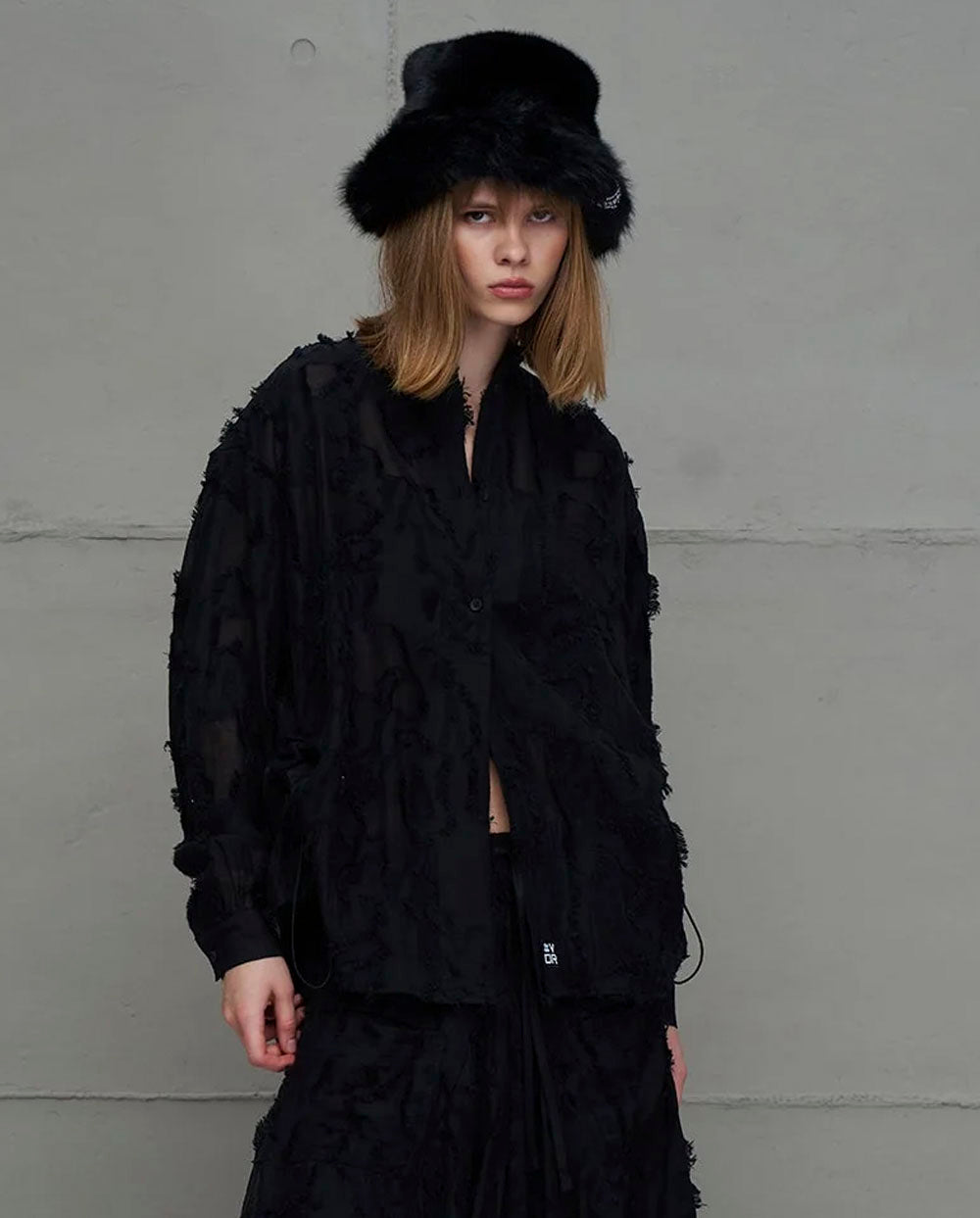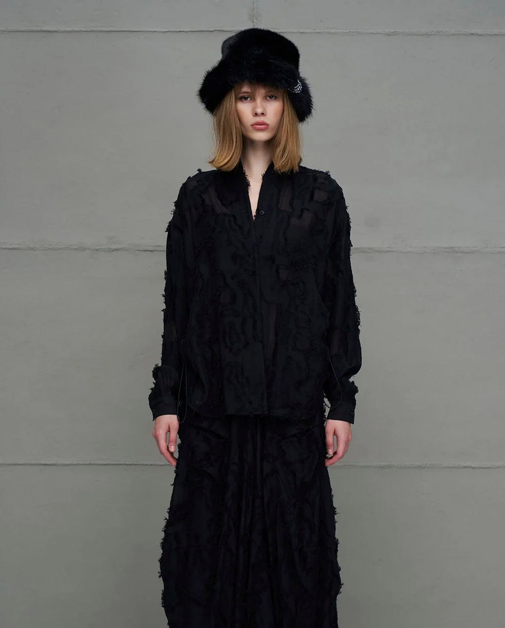 Camisa negra de tejido semitransparente con flecos y corte holgado, abotonada por delante. Nueva colección Otoño invierno 2025-26 de la marca italiana #VDR Viadellerose.
