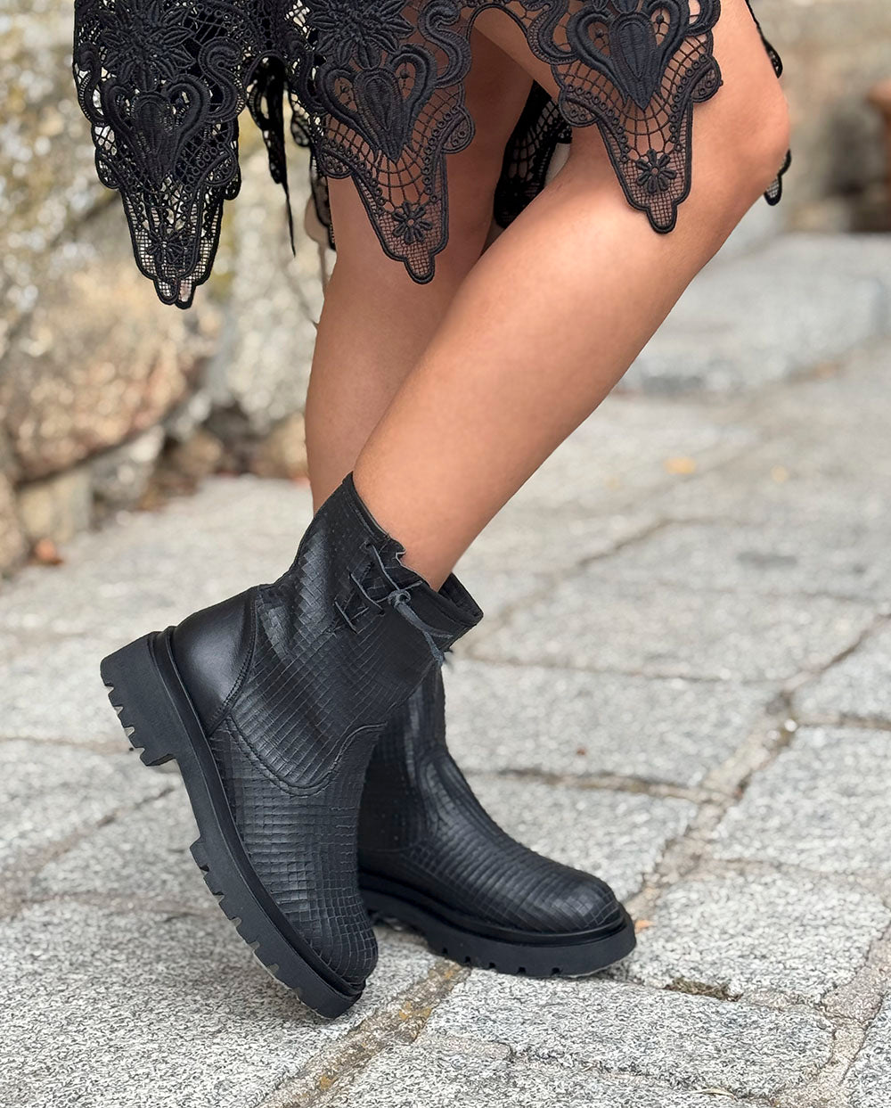 Botín motero super ligero y cómodo, de Nemonic Shoes. Está hecho en España en una piel negra con textura, con detalle de cordon anudado lateral.