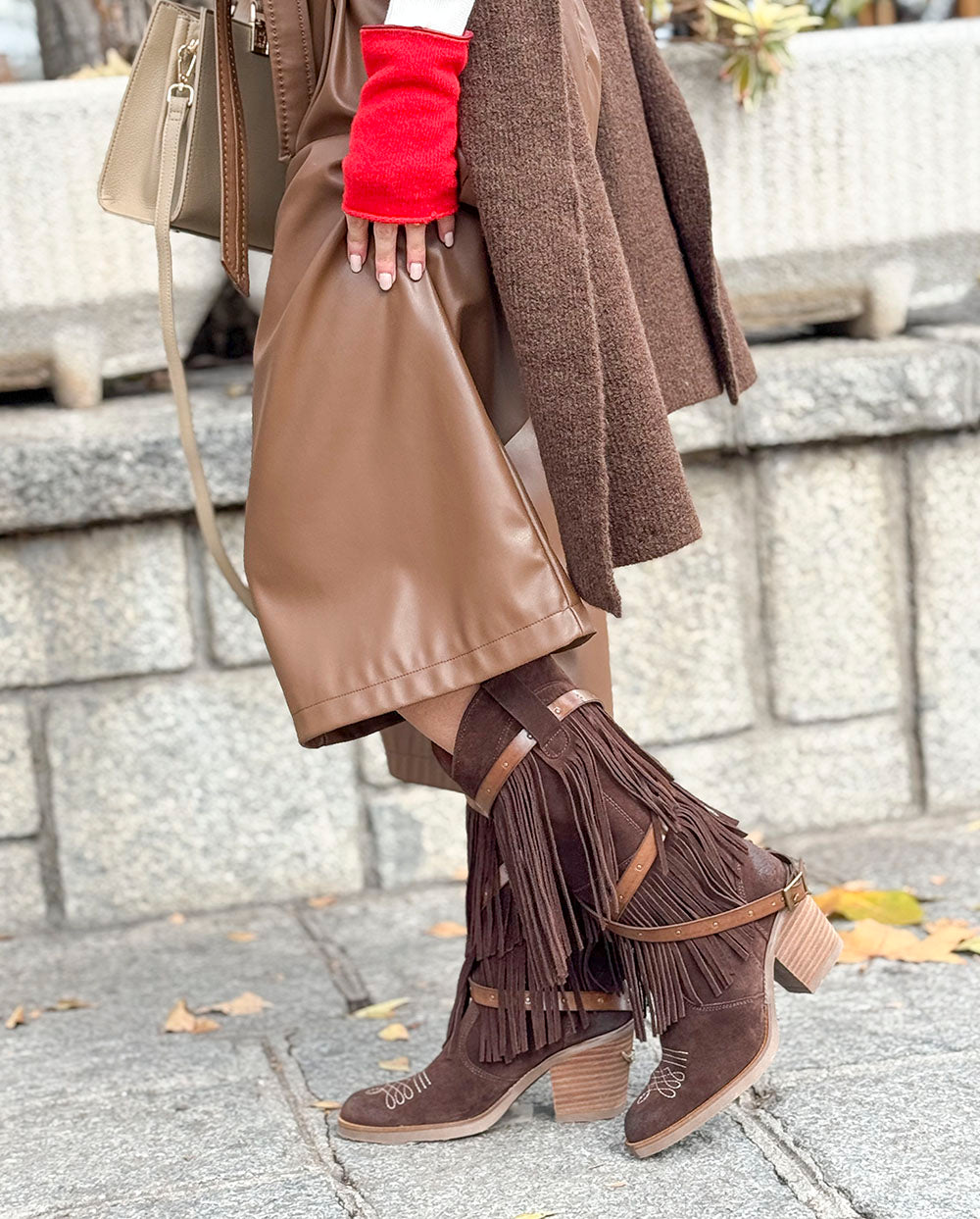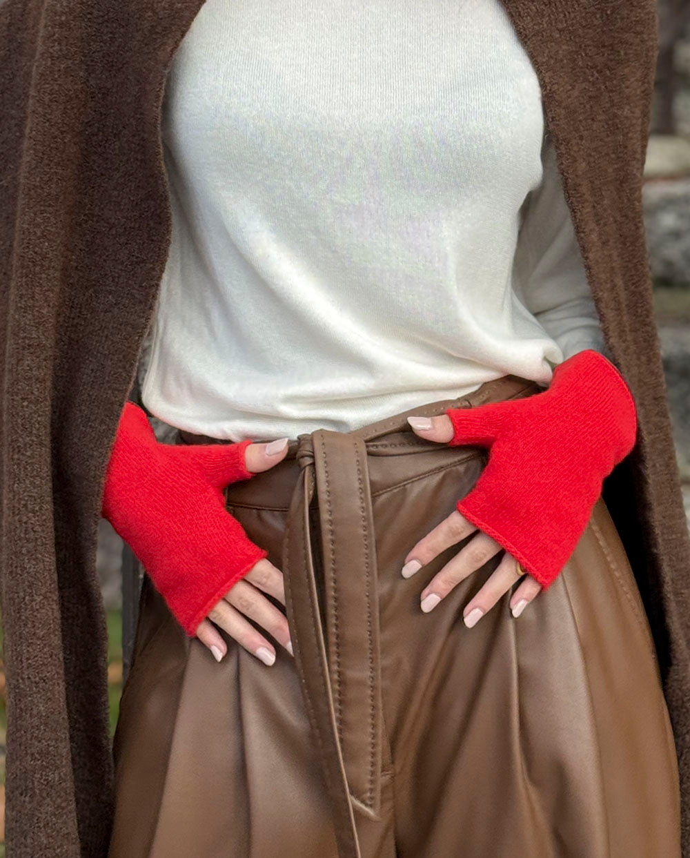 Manguitos rojo carmín cachemir, ribeteados en piel, de la firma Santa Cana.