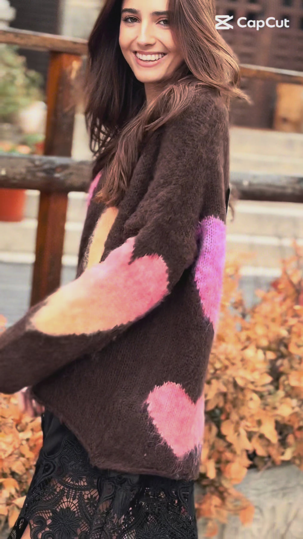Suéter color chocolate con corazones en tonos rosas degradados y escote en uve, fabricado en mezcla de 70 % lana y 30 % alpaca.