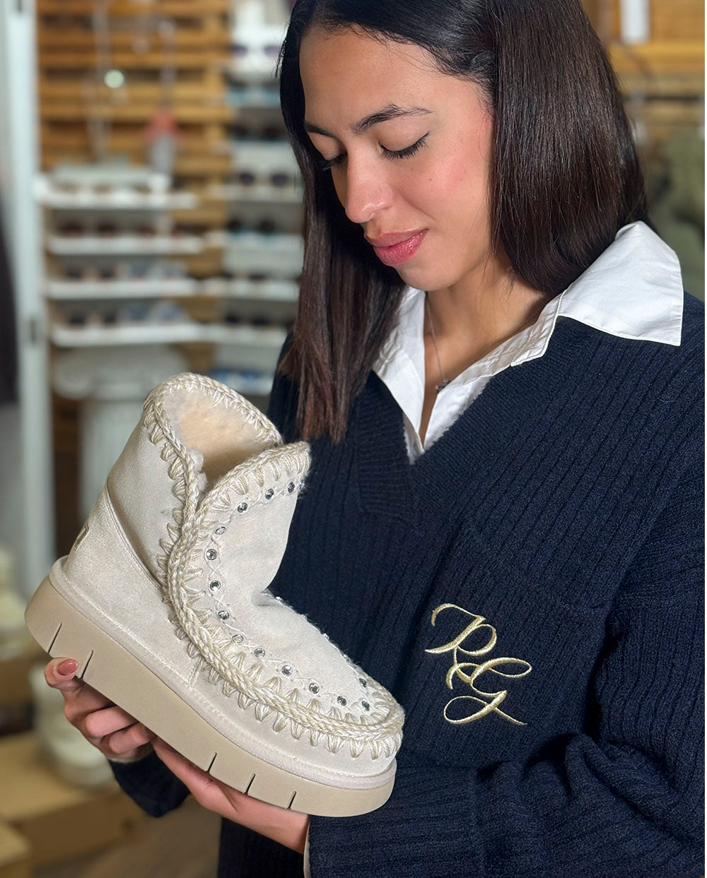 ¡Novedad de Mou para este otoño invierno 2025-26! Su Sneaker con suela de plataforma Bounce ahora decorada con strass. Cómoda, dinámica y en tendencia. Su altura de caña más baja que el botín, es perfecta para usar con pantalones de todo tipo.