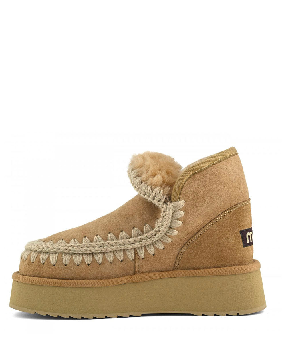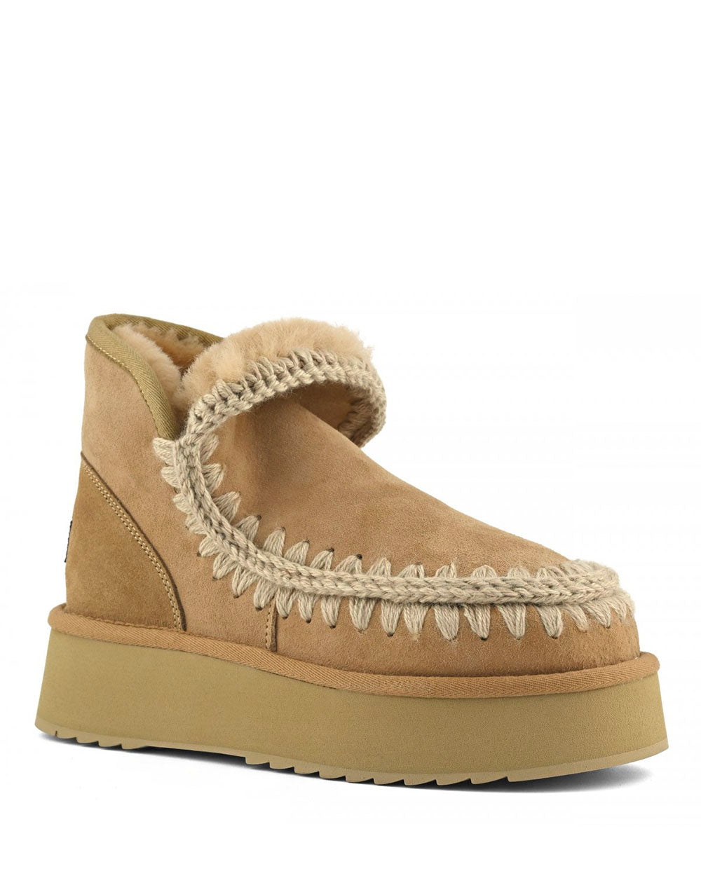 La Bota Mini Eskimo con plataforma con la nueva plataforma lisa, en color marrón savana, decorado con el tradicional pespunte de lana.